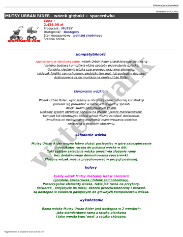 Informacje o produkcie Utworzono 04-03-2017 MUTSY URBAN RIDER - wózek głęboki + spacerówka Cena : 2.429,00 zł Producent : MUTSY Dostępność : Dostępny Stan magazynowy : poniżej średniego Średnia ocena : kompatybilność er m ar k zaopatrzony w obrotową ramę, wózek Urban Rider charakteryzuje się mocną i solidną budową i umożliwia różne sposoby przewożenia dziecka. Gondola, siedzenie wózka spacerowego oraz inne elementy, takie jak foteliki: samochodowy, siedzisko fun seat, lub podwójny duo seat dostosowane są do montażu na ramie Urban Rider. kierowanie wózkiem Wózek Urban Rider, wyposażony w obrotową ramę o mocnej konstrukcji pozwala się prowadzić w niezwykle wygodny sposób dzięki swoim pompowanym kołom. Unikalny system obrotowy pozwala na płynne i proste manewrowanie. Komplet kół obrotowych swivel wheel można zamówić dodatkowo. Umożliwia on maksymalną możliwość manewrowania wózkiem zwłaszcza w miejskim otoczeniu. at składanie wózka w Mutsy Urban Rider można łatwo złożyć pociągając w górę zabezpieczenie i dociskając rączkę do pchania wózka w dół. Taki system składania wózka umożliwia złożenie ramy bez dodatkowego demontowania spacerówki. Złożony wózek można przechowywać w pozycji poziomej. kolory Każdy wózek Mutsy dostępny jest w częściach (gondola, spacerówka i fotelik samochodowy). Poszczególne elementy wózka, takie jak torba na przybory, śpiworek , przykrycie na nóżki, daszek przeciwsłoneczny i parasol, są dostępne w kolorach pasujących do głównych komponentów wózka. wykończenie Rama wózka Mutsy Urban Rider jest dostępna w 2 wersjach: jako standardowa rama z rączką piankową i jako wersja typu 'next' z rączką skórzaną. Wygenerowano w programie www.oscGold.com duoseat jest to specjalna wkładka z dwoma siedzeniami. Przednie siedzenie przeznaczone jest dla dzieci w wieku od 6 miesięcy. Tylnie można umieszczać w 4 pozycjach, można go używać nawet do transportowania noworodków. Zaleca się stosowanie tylniego siedzenia w połączeniu z wkładką; służy ona jako reduktor tylniego siedzenia. Duoseat posiada dwie budy i dostępny jest w trzech kolorach: czerwonym, granatowym i białym. Jest on idealnym rozwiązaniem dla rodziców z 2 małych dzieci. er m ar k wymiary waga po demontażu kół: 7 waga: 11.5 rama po złożeniu i demontażu kół: 98 x 52 x 21.5 rama po złożeniu: 104 x 63 x 30 rama po rozłożeniu: 79 x 62 x 110.5 Dostępne opcje MUTSY URBAN RIDER - wózek głęboki + spacerówka » MUTSY: UR active blue, UR team new red, UR team mist, UR team green, UR team dark grey, UR team caribean, UR team brown, UR w at cargo pacific, UR cargo new black, UR cargo grey, UR cargo chocolate, UR active champagne, UR team purple.