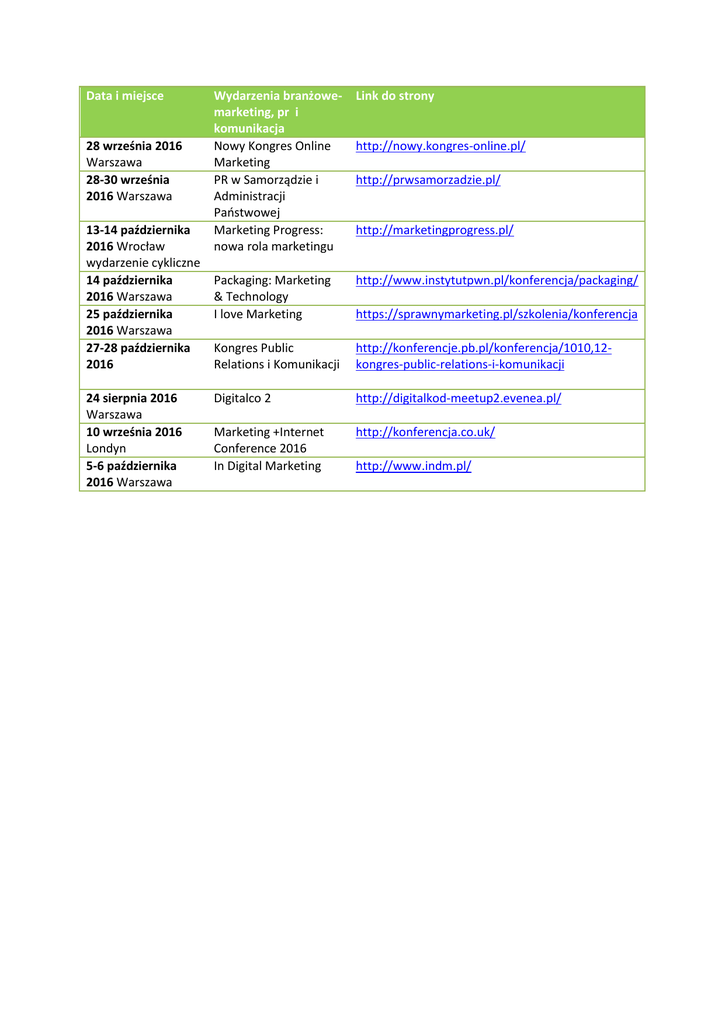 Data i miejsce 28 września 2016 Warszawa 28-30 września 2016 Warszawa 13-14 października 2016 Wrocław wydarzenie cykliczne 14 października 2016 Warszawa 25 października 2016 Warszawa 27-28 października 2016 24 sierpnia 2016 Warszawa 10 września 2016 Londyn 5-6 października 2016 Warszawa Wydarzenia branżowemarketing, pr i komunikacja Nowy Kongres Online Marketing PR w Samorządzie i Administracji Państwowej Marketing Progress: nowa rola marketingu Link do strony Packaging: Marketing & Technology I love Marketing http://www.instytutpwn.pl/konferencja/packaging/ Kongres Public Relations i Komunikacji http://konferencje.pb.pl/konferencja/1010,12kongres-public-relations-i-komunikacji Digitalco 2 http://digitalkod-meetup2.evenea.pl/ Marketing +Internet Conference 2016 In Digital Marketing http://konferencja.co.uk/ http://nowy.kongres-online.pl/ http://prwsamorzadzie.pl/ http://marketingprogress.pl/ https://sprawnymarketing.pl/szkolenia/konferencja http://www.indm.pl/