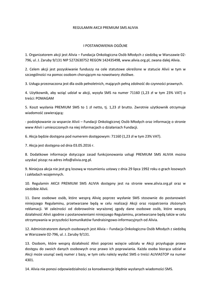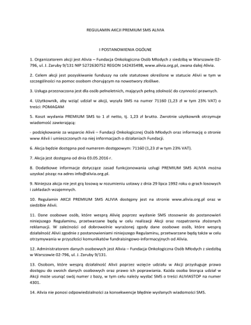 REGULAMIN AKCJI PREMIUM SMS ALIVIA I POSTANOWIENIA OGÓLNE 1. Organizatorem akcji jest Alivia – Fundacja Onkologiczna Osób Młodych z siedzibą w Warszawie 02796, ul. J. Zaruby 9/131 NIP 5272630752 REGON 142435498, www.alivia.org.pl, zwana dalej Alivia. 2. Celem akcji jest pozyskiwanie funduszy na cele statutowe określone w statucie Alivii w tym w szczególności na pomoc osobom chorującym na nowotwory złośliwe. 3. Usługa przeznaczona jest dla osób pełnoletnich, mających pełną zdolność do czynności prawnych. 4. Użytkownik, aby wziąć udział w akcji, wysyła SMS na numer 71160 (1,23 zł w tym 23% VAT) o treści: POMAGAM 5. Koszt wysłania PREMIUM SMS to 1 zł netto, tj. 1,23 zł brutto. Zwrotnie użytkownik otrzymuje wiadomość zawierającą: - podziękowanie za wsparcie Alivii – Fundacji Onkologicznej Osób Młodych oraz informację o stronie www Alivii i umieszczonych na niej informacjach o działaniach Fundacji. 6. Akcja będzie dostępna pod numerem dostępowym: 71160 (1,23 zł w tym 23% VAT). 7. Akcja jest dostępna od dnia 03.05.2016 r. 8. Dodatkowe informacje dotyczące zasad funkcjonowania usługi PREMIUM SMS ALIVIA można uzyskać pisząc na adres [email protected]. 9. Niniejsza akcja nie jest grą losową w rozumieniu ustawy z dnia 29 lipca 1992 roku o grach losowych i zakładach wzajemnych. 10. Regulamin AKCJI PREMIUM SMS ALIVIA dostępny jest na stronie www.alivia.org.pl oraz w siedzibie Alivii. 11. Dane osobowe osób, które wesprą Alivię poprzez wysłanie SMS stosownie do postanowień niniejszego Regulaminu, przetwarzane będą w celu realizacji Akcji oraz rozpatrzenia złożonych reklamacji. W zależności od dobrowolnie wyrażonej zgody dane osobowe osób, które wesprą działalność Alivii zgodnie z postanowieniami niniejszego Regulaminu, przetwarzane będą także w celu otrzymywania w przyszłości komunikatów fundraisingowo-informacyjnych od Alivia. 12. Administratorem danych osobowych jest Alivia – Fundacja Onkologiczna Osób Młodych z siedzibą w Warszawie 02-796, ul. J. Zaruby 9/131. 13. Osobom, które wesprą działalność Alivii poprzez wzięcie udziału w Akcji przysługuje prawo dostępu do swoich danych osobowych oraz prawo ich poprawiania. Każda osoba biorąca udział w Akcji może usunąć swój numer z bazy, w tym celu należy wysłać SMS o treści ALIVIASTOP na numer 4301. 14. Alivia nie ponosi odpowiedzialności za konsekwencje błędnie wysłanych wiadomości SMS. 15. Osoba chcąca wesprzeć działalność Alivii poprzez wysłanie SMS pod numer 71160 zobowiązana jest przed wzięciem udziału w Akcji zapoznać się z treścią niniejszego Regulaminu. II. REKLAMACJE 1. Wszelkie reklamacje i zastrzeżenia dotyczące usługi mogą być składane przez użytkowników wyłącznie w formie pisemnej wraz ze szczegółowym uzasadnieniem, i przesłane na adres siedziby Alivii. 2. Złożone reklamacje będą rozpatrywane przez Alivię niezwłocznie, jednak nie później niż w terminie 7 dni od daty otrzymania reklamacji. 3. Zainteresowani zostaną powiadomieni o sposobie rozpatrzenia reklamacji listownie, najpóźniej w ciągu 7 dni od daty rozpatrzenia reklamacji. III. POSTANOWIENIA KOŃCOWE 1. W sprawach nieuregulowanych niniejszym regulaminem zastosowanie mają odpowiednie przepisy kodeksu cywilnego (Dz. U. 1964, nr 16, poz. 93 z późniejszymi zmianami).