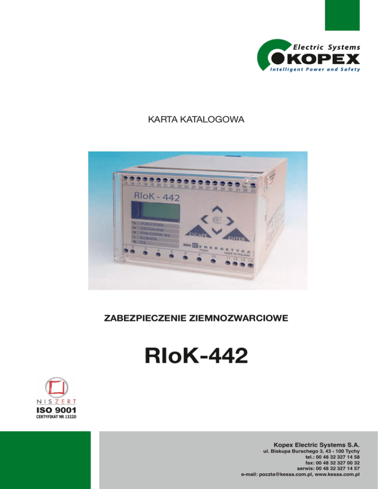tel. (032) 327-14-58; tel./fax (032) 327-00-32 e-mail: [email protected] ZEG-ENERGETYKA Sp. z o. o. 43-100 Tychy, ul. Biskupa Burschego 7 tel. (032) 327-14-58; tel./fax (032) 327-00-32 e-mail: [email protected] DOKUMENTACJA TECHNICZNO-RUCHOWA INSTRUKCJA OBSUGI KARTA KATALOGOWA Zespó Sygnalizacji Zakóceniowej ZABEZPIECZENIE ZIEMNOZWARCIOWE Zabezpieczenie ziemnozwarciowe ZS Z 3 0 RIoK-442 RIoK-442 ZEG-E EE 428072.02 Kopex Electric Systems S.A. ZEG-E ul. Biskupa Burschego 3, 43 - 100 Tychy tel.: 00 48 32 327 14 58 fax: 00 48 32 327 00 32 serwis: 00 48EE 32424061 327 14 57 e-mail: [email protected], www.kessa.com.pl RIoK-442 • ÷ • ÷ ϕ ÷ ÷°° ± ± ±° 2 RIoK-442 • ÷ ϕ ÷ ÷°° ± ± ±° • ÷ ±⋅ • 3 ÷ ±⋅ RIoK-442 = ( ) − ÷ ÷ ±⋅ 4 RIoK-442 5 RIoK-442 6 RIoK-442 7 RIoK-442 8 RIoK-442 ÷÷ ≤ ≤ ≤ ≤ ÷ > < ÷ ≤ < ÷÷ ÷÷ ≤ ≤ 9 RIoK-442 Prośby o szczegółowe informacje oraz zamówienia należy kierować do działu marketingu: Kopex Electric Systems S.A. ul. Biskupa Burschego 3, 43 - 100 Tychy tel.: 00 48 32 327 14 58 fax: 00 48 32 327 00 32 serwis: 00 48 32 327 14 57 e-mail: [email protected], www.kessa.com.pl 10 Zakład Chorzów ul. Opolska 19 41- 500 Chorzów Zakład Tychy ul. Biskupa Burschego 3 43 - 100 Tychy www.kessa.com.pl e-mail: [email protected] Kopex Electric Systems S.A. ul. Biskupa Burschego 3, 43 - 100 Tychy tel.: 00 48 32 327 14 58 fax: 00 48 32 327 00 32 serwis: 00 48 32 327 14 57