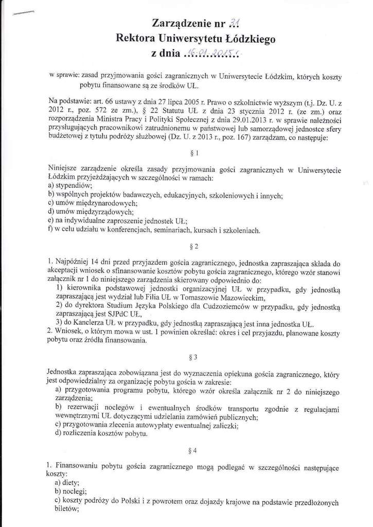 Zarządzenie nr :il Rektora Uniwersytetu Łódzkiego z dnia . !( :!!..ił,i,5.n w sprawic: zasad przyjmorr,alia gości zagranicznl,ch \ł, Uni§,ersytecie Łódzkim, których koszty pobytu finanso\\,anc są Ze środków UŁ. Na podstawie: art, 66 trsta\ł,y z dnia 27 lipca 2005 r Plawo o szkolnictwie lłyżsżym(t j. Dz.IJ. z 2012 t.. poz. 572 ze zm.). § 22 Slitutu LrL z dnia 23 stlcznja 20li r.. (ze zm.) oraz rozporządzenia Ministra Pracy i Polit,vki Społecznej z dnia 29.01,2013 r. rv sprawie należlości przysługujących pracownikowi zatrudnionet,tru \ł państwowej lub samorządowe.j iednostce sfery budżetowej z tltułu podróży służbowe.j (Dz.Il _ z20l3 f.. poz. 167) zarząd,zan. co następuj e: §I Niniejsze zarządzenie okeśla zasady przyjmorvania gości zagranicznych \ł, Uniwersytecie Łódzkinr przyjeżdzających w szczególności w ranrach: a) stypendiów; b) wspólnych projektów badawczych, edŃacl,jnych, szkoleniorłych i innych; c) umów niędz}narodowl,ch; d) umórv międz"vrządorłlch: e) na indyr,vidualne zapro szenie .jedno stek UŁ: f) lv celu udziału w konferencjach. seminariach, kur.sach i szkoleniach, §2 1- Najpóźrriej 14 dni przed przyjazdem gościa zagranicznego, jednostka zaprasżająca składa do akceptacji rvniosek o sfinansou,aDie kosztów pobytu gościa zagranicznego, którcgo wzór stanowi żałącznjk nr 1 do niniejszego zarządzenia skicrowany odpowiednio do: 1) kierorr,nika podstawowej .jednostki organizacyjnej UL rv ptypadku, gdy jednostką /aprd§./ajqjij jest u;dziri lLrb I ilia l L,,ł folroczouic Ml,,.rrłicckinl. 2) do d}Tektora Strrdiun Języka Poiskiego dla ClLdzozie]ncó\Ą rr przl,padku, gd,v jettnostką żaprasżaiącą jest S.IPdC Uł-, _ 3) do Kanclerza UŁ rł ptypadku. gdyjednostką zapraszającąjest innajed1lostka UŁ. 2 Wniosek. o kńrym D]owa w ust, 1 porłinien określać:okres i iel przl,jaŻdu. pliurowane kosży pobYrr oraz źródła finansowania, §] Jednostka zaprasza.jąca zobowiązana jest do rłyznaczcnia opiekuna gościazagranicznego, który jest odpowiedzialny za organizację pobylu gościa w zakr.esie: a) przygotowania programu pobytu, którego \Ą,zór okręślaZałacznik l11 2 do niniejszego z.rrzqdl enir: b) rezerwacji noclególv i ewentualn_vch ślodkóW transpottu Zgodnie regulacjami wewnętrżnymi UŁ dolyczac}.1.1i udzjelania zamówień publiczDych; c) przygotowania Zlecenia autoNypłaty ewentualnej zaliczki: d) rozliczenia kosztów pobytu, z §4 ], Finąnsorł,aniu pobytu gościazagranicznego mogq pod]egać W sżczegó]ności następujące koszt),: a) diet,v; b) noclegi; c),koszt! podróży do Polski i z porvrotern oraz rlojazdy krajowe na podstawie przedłożonych bi]etów: kosay przejazdów lokalnych. 2, Diety na pokrycie kosztó\ł, W),żywienia oraz przejazdów lokalnvch, o których mowa w ust, 1 lit, a i d, mogą być w],płacane w lormic zalicżki na podstawie wniósku o dokónanie autowlpłaty, którego wzór określa za}ączltik nr 3 do niniejszego zafząd,zenla, za pośrer:lnictwem opie-kuna gościa.zagraniczIrego, opiekun przekazuje nięZwłocznie olrzymaną zaliczkę gościorł,i zaglan]cZnemu. 3. cośćzagraniczly k\łituje odbjór Zaliczki, o której mo\łą w ust, 2. Dnrk pokrł,itowania określa zalqcznik nr 4 do n.niej,zceo zurządzen.l, 4, Kosztl, zrłiązaue z zakwaterowaniem ot.aż kosny, o których tnowa \ł,ust. 1 lit. c lnogą być opłacone przeż: a) gościaindyrł,idualnie - bez finansowarria ze strony UŁ, b) UŁ na podstawie rezerwacji i opłacenia 1'aktur uTstawion},ch na UŁ ]ub przedłożonych biletów: c) UŁ w formie reflndacji na podsta\Ą,ic przedlożonl,ch dokumentów finansorłyclr. której dokon.rjc.ie na rochur<k oan\nrły 3uic'a /Jgrdnic,/rcgo, d) Goście zagraniczni kł,aterowani są w CSK I]L bądż za zgorlą kierolvnika podsta\ł,o\łej jednostki organizac),jnej UŁ/dtrektora S]PdC,rl(ałclerza IJł, w irulvm obiekcie hoteiowl,m, 5. Ko.zl1 pobltl go5(ia /Jd-aric,,rego lln.u]5o\J.le pr,,ez Ul okieslr un.,*_ cylłilno_rrarłna. której wżór okeślazałącznik nr 5 do niniejszego zarządzetia. 6, UŁ n]e pokrywa kosztów ubezpieczenia goscja zaaranicznego \^ czasie pob)tu \ł,Polsce, 7 Wszystkie dokument.\ zwią:zane z prz:]jazrlenl gościa zagranicznego. stinorviące załączniki do nlnleIszego Zarżądzenia, składane są w Dziale FinansowJ-m Uł_, pIZy czym: a] zrIaczr.ki 1-3 pr.,cd przlla,,oen gościl zcpraricznego. bl zalacznixi,t_5 oo p-zljcżdzie yo§(id./!granij,/llego Kopia tych dokumcntów pozostaje wjednostce Zapmszającej UŁ. §5 Finansorł,anie pobllu gości zaglanioznl,ch w UŁ odb}.$,a się na następuiących zasadach: 1. w przypadku, gdy program,v i zawańe umowv prze\łiduią zakres i wl,sokośćśrł,iadczelidla gości.ich W},płata następuje zgodnie z tymi zasadami. 2, w pozostałych przypadkaclr śłiadczenianie 111ogą b,vć wyźsze, niż| a,) d\ltkrohość śau,kidiety określonej w r.ozporządzeniu Ministra Prac), i Po]i§&i Społęcznej z dnia 29.01.2013 r. \ł, sprau,ie należnościprzysługującyclr pracorłlikorvi zatrudnionemu w państrvorvej lub samorządowej jednostce sfery budżetowej ż tytuh podróży służbowej w przypadku diety na pokrycie kosztólv dziennego r.ł_vżyrviei.lia, b) dl,udziestokrotność sta\\&i diety okleślonej w rozporządzeniu Ministra Pracy i Polityki Spoiecznej dnia 29.01.2013 r. rv spra\Ą,ic należnościprzysługujących pracownikówi zatrudnionemu w państ\ł,oł,ej 1ub sanrorządowej jednostce sfer.y budzitorvej z t)-tulu podlóży służbolvej lv przypadku. gdy zakwaterowanie zostało zare;erwolvane w innvm obiekcie 1-oteloul m ni., C\K I l 3, rł, uzasadnionych przypadkach kierow.nik podsrawowej jectnostki organizacl,jnei UŁ/dyrektor SJPdC l]Ł/Kanclerz UŁ. na rł,niosek kierorvnika jednostki zapraszajqcej/kierownika projektu, n]oże Wyrazić zgodę na ustalenie innej wysokości świadczeń. niż wynikajacc ninie,lizego zar.z4dzenia lub na przyznanie inrrl,clr świadczeń, Zgoda wlmaga określeni