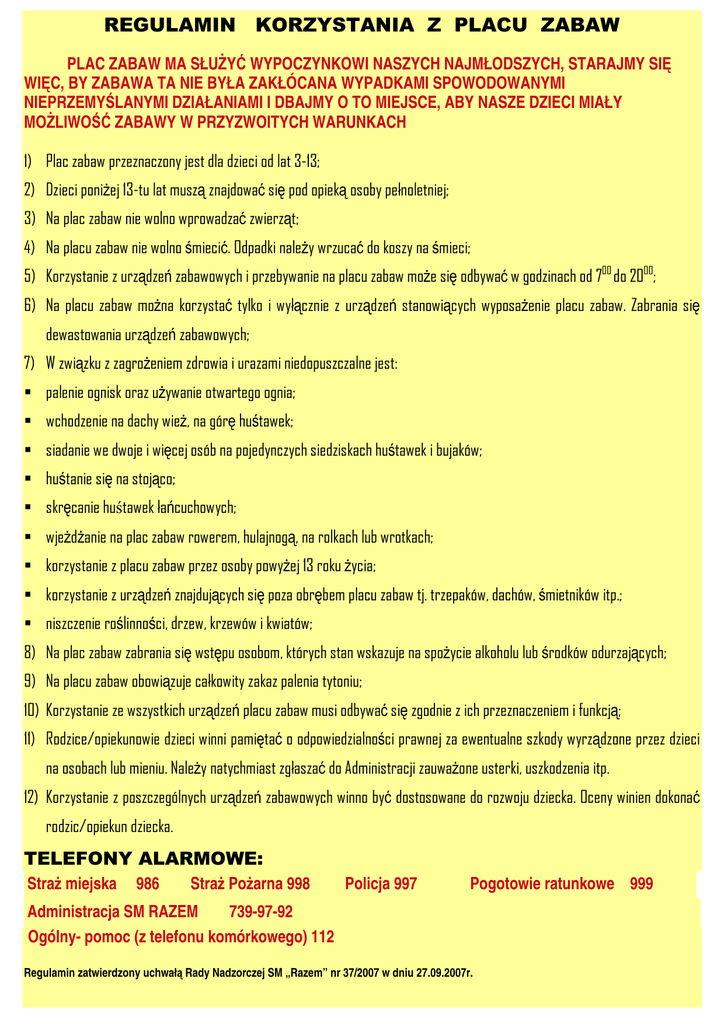 REGULAMIN KORZYSTANIA Z PLACU ZABAW PLAC ZABAW MA SŁUŻYĆ WYPOCZYNKOWI NASZYCH NAJMŁODSZYCH, STARAJMY SIĘ WIĘC, BY ZABAWA TA NIE BYŁA ZAKŁÓCANA WYPADKAMI SPOWODOWANYMI NIEPRZEMYŚLANYMI DZIAŁANIAMI I DBAJMY O TO MIEJSCE, ABY NASZE DZIECI MIAŁY MOŻLIWOŚĆ ZABAWY W PRZYZWOITYCH WARUNKACH 1) Plac zabaw przeznaczony jest dla dzieci od lat 3-13; 2) Dzieci poniżej 13-tu lat muszą znajdować się pod opieką osoby pełnoletniej; 3) Na plac zabaw nie wolno wprowadzać zwierząt; 4) Na placu zabaw nie wolno śmiecić. Odpadki należy wrzucać do koszy na śmieci; 5) Korzystanie z urządzeń zabawowych i przebywanie na placu zabaw może się odbywać w godzinach od 700 do 2000; 6) Na placu zabaw można korzystać tylko i wyłącznie z urządzeń stanowiących wyposażenie placu zabaw. Zabrania się dewastowania urządzeń zabawowych; 7) W związku z zagrożeniem zdrowia i urazami niedopuszczalne jest: palenie ognisk oraz używanie otwartego ognia; wchodzenie na dachy wież, na górę huśtawek; siadanie we dwoje i więcej osób na pojedynczych siedziskach huśtawek i bujaków; huśtanie się na stojąco; skręcanie huśtawek łańcuchowych; wjeżdżanie na plac zabaw rowerem, hulajnogą, na rolkach lub wrotkach; korzystanie z placu zabaw przez osoby powyżej 13 roku życia; korzystanie z urządzeń znajdujących się poza obrębem placu zabaw tj. trzepaków, dachów, śmietników itp.; niszczenie roślinności, drzew, krzewów i kwiatów; 8) Na plac zabaw zabrania się wstępu osobom, których stan wskazuje na spożycie alkoholu lub środków odurzających; 9) Na placu zabaw obowiązuje całkowity zakaz palenia tytoniu; 10) Korzystanie ze wszystkich urządzeń placu zabaw musi odbywać się zgodnie z ich przeznaczeniem i funkcją; 11) Rodzice/opiekunowie dzieci winni pamiętać o odpowiedzialności prawnej za ewentualne szkody wyrządzone przez dzieci na osobach lub mieniu. Należy natychmiast zgłaszać do Administracji zauważone usterki, uszkodzenia itp. 12) Korzystanie z poszczególnych urządzeń zabawowych winno być dostosowane do rozwoju dziecka. Oceny winien dokonać rodzic/opiekun dziecka. TELEFONY ALARMOWE: Straż miejska 986 Straż Pożarna 998 Policja 997 Pogotowie ratunkowe 999 Administracja SM RAZEM 739-97-92 Ogólny- pomoc (z telefonu komórkowego) 112 Regulamin zatwierdzony uchwałą Rady Nadzorczej SM „Razem” nr 37/2007 w dniu 27.09.2007r.