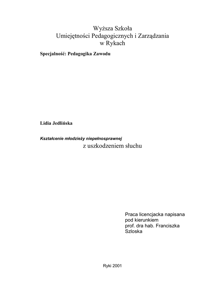 Wyższa Szkoła Umiejętności Pedagogicznych i Zarządzania w Rykach Specjalność: Pedagogika Zawodu Lidia Jedlińska Kształcenie młodzieży niepełnosprawnej z uszkodzeniem słuchu Praca licencjacka napisana pod kierunkiem prof. dra hab. Franciszka Szloska Ryki 2001 2 SPIS TREŚCI WSTĘP ...................................................................................................................3 ROZDZIAŁ I ..........................................................................................................5 WYJAŚNIENIE PODSTAWOWYCH POJĘĆ. ...................................................5 ROZDZIAŁ II ........................................................................................................8 RODZAJE USZKODZEŃ SŁUCHU ICH WPŁYW NA ROZWÓJ OSOBOWOŚCIOWY I UCZUCIOWY JEDNOSTKI.........................................8 2.1. PRZYCZYNY USZKODZEŃ SŁUCHU ........................................................................................... 8 2.2. POTRZEBY ROZWOJOWE ....................................................................................................... 10 2.3. KSZTAŁTOWANIE MOWY DZIECKA GŁUCHEGO ....................................................................... 14 ROZDZIAŁ III .....................................................................................................19 PROCES KSZTAŁCENIA DZIECI Z USZKODZENIEM SŁUCHU ..............19 3.1. KWALIFIKACJA DO ODPOWIEDNICH FORM KSZTAŁCENIA ........................................................ 19 3.2. PODSTAWOWE CELE KSZTAŁCENIA DZIECI I MŁODZIEŻY Z USZKODZONYM SŁUCHEM............... 25 ROZDZIAŁ IV .....................................................................................................28 WYRÓWNYWANIE SZANS ..............................................................................28 4.1. INTEGRACJA SPOŁECZNA DZIECI I MŁODZIEŻY ....................................................................... 28 4.2. REWALIDACJA I REHABILITACJA OSÓB Z USZKODZONYM SŁUCHEM ........................................ 31 CZĘŚĆ BADAWCZA............................................................................................37 ROZDZIAŁ V.......................................................................................................37 ORGANIZACJA BADAŃ WŁASNYCH ............................................................37 5.1. CEL BADAŃ .......................................................................................................................... 37 5.2. HIPOTEZY ROBOCZE ............................................................................................................. 38 5.3. METODY I TECHNIKA BADAŃ ................................................................................................ 39 5.4. NARZĘDZIA BADAWCZE........................................................................................................ 39 5.5. ZAKRES I TEREN BADAŃ....................................................................................................... 39 5.6. STRUKTURA ANKIETY........................................................................................................... 40 5.7. ANALIZA WYNIKÓW BADAŃ .................................................................................................. 40 5.7. WNIOSKI Z BADAŃ ............................................................................................................... 45 ZAKOŃCZENIE ..................................................................................................47 BIBLIOGRAFIA ..................................................................................................48 ANEKS..................................................................................................................50 3 WSTĘP Godność każdej osoby ludzkiej jest dzisiaj sprawą bezdyskusyjną. Ludzie obdarzeni taką samą godnością powinni mieć też równe szanse wielostronnego rozwoju własnej osobowości. Dotyczy to również ludzi, którzy z jakichkolwiek przyczyn posiadają nie w pełni sprawne narządy ruchu lub narządy zmysłów. Na społeczności ciąży obowiązek umożliwienia ludziom niepełnosprawnym udziału w życiu społeczeństwa, na miarę ich indywidualnych potrzeb i możliwości. Nie mogą stać się tu usprawiedliwieniem trudności techniczne związane z codziennym funkcjonowaniem człowieka niepełnosprawnego w życiu społecznym. Jednym z najskuteczniejszych sposobów stwarzania możliwości udziału osób niepełnosprawnych w życiu społecznym jest zapewnienie im odpowiedniego wykształcenia. Celem niniejszej pracy jest przedstawienie sytuacji dzieci i młodzieży z uszkodzeniami słuchu w naszym systemie oświatowym oraz wskazanie, na podstawie przeprowadzonych badań, najskuteczniejszych i najpopularniejszych metod stosowanych w pracy dydaktycznej z dziećmi i młodzieżą o uszkodzonym słuchu. W pierwszym rozdziale pracy wyjaśnione zostały podstawowe pojęcia, którymi posługiwałam się w dalszej części pracy. Rozdział drugi poświęcony został omówieniu potrzeb rozwojowych dzieci oraz kształtowaniu mowy dziecka głuchego. W trzecim rozdziale autorka omówiła proces kształcenia dzieci i młodzieży z uszkodzonym słuchem zaznaczając specyficzne cele 4 kształcenia tej grupy oraz dobór odpowiednich form kształcenia. Rozdział czwarty przedstawia zasady działalności rewalidacyjnej i rehabilitacyjnej jako podstawy integracji społecznej młodych ludzi z uszkodzonym słuchem. Piąty rozdział, stanowiący część badawczą pracy, określa cel badań, podaje sformułowane przez mnie hipotezy, przedstawia też metody i narzędzia badawcze. W tym też rozdziale, po przeanalizowaniu wyników, autorka przedstawiła także wnioski z badań. 5 Rozdział I Wyjaśnienie podstawowych pojęć. Podejmując w niniejszej pracy problematykę kształcenia młodzieży niepełnosprawnej z uszkodzeniem słuchu, dla lepsze