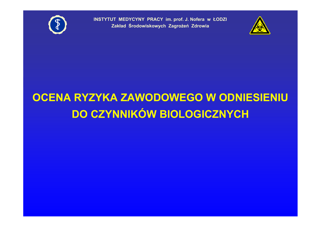 INSTYTUT MEDYCYNY PRACY im. prof. J. Nofera w ŁODZI Zakład Środowiskowych Zagrożeń Zdrowia OCENA RYZYKA ZAWODOWEGO W ODNIESIENIU DO CZYNNIKÓW BIOLOGICZNYCH INSTYTUT MEDYCYNY PRACY im. prof. J. Nofera w ŁODZI Zakład Środowiskowych Zagrożeń Zdrowia OCENA RYZYKA ZAWODOWEGO ¾ Przed rozpoczęciem pracy na danym stanowisku ¾ Okresowo powtarzana i weryfikowana ¾ W przypadku zmiany warunków pracy, która może wpłynąć na ekspozycję na czynniki biologiczne ¾ W przypadku wystąpienia chorób związanych z wykonywaną pracą 14 INSTYTUT MEDYCYNY PRACY im. prof. J. Nofera w ŁODZI Zakład Środowiskowych Zagrożeń Zdrowia OCENA RYZYKA ZAWODOWEGO ¾ Informacja o czynniku biologicznym: rodzaj, klasyfikacja do grupy ryzyka, droga przenoszenia, zdolność do przetrwania w środowisku zewnętrznym, wrażliwość na środki dezynfekcyjne, skutki zdrowotne ¾ Informacja o wykonywanych czynnościach: rodzaj, czas trwania, częstotliwość kontaktu z czynnikiem biologicznym, zgodność z drogą przenoszenia 3 INSTYTUT MEDYCYNY PRACY im. prof. J. Nofera w ŁODZI Zakład Środowiskowych Zagrożeń Zdrowia OCENA RYZYKA ZAWODOWEGO ¾ Informacja o specyficznych czynnościach: powodujące tworzenie się aerozoli, z dużym stężeniem czynników biologicznych, z czynnikami biologicznymi z wysokiej grupy ryzyka, z czynnikami biologicznymi o niskiej dawce infekcyjnej lub wysokiej inwazyjności, charakteryzujące się wysokim ryzykiem skaleczenia ¾ Informacja o możliwości zastosowania szczepień ochronnych ¾ Identyfikacja narażonych pracowników ¾ Informacja o przypadkach stwierdzonych chorób zawodowych 16 INSTYTUT MEDYCYNY PRACY im. prof. J. Nofera w ŁODZI Zakład Środowiskowych Zagrożeń Zdrowia OCENA RYZYKA ZAWODOWEGO ¾ Wybór środków i sposobów ochrony pracowników przed narażeniem na czynniki biologiczne (techniczne, organizacyjne, medyczne) ¾ Kontrola skuteczności działań profilaktycznych ¾ Dokumentowanie oceny ryzyka ¾ Informowanie pracowników o ryzyku zawodowym 17