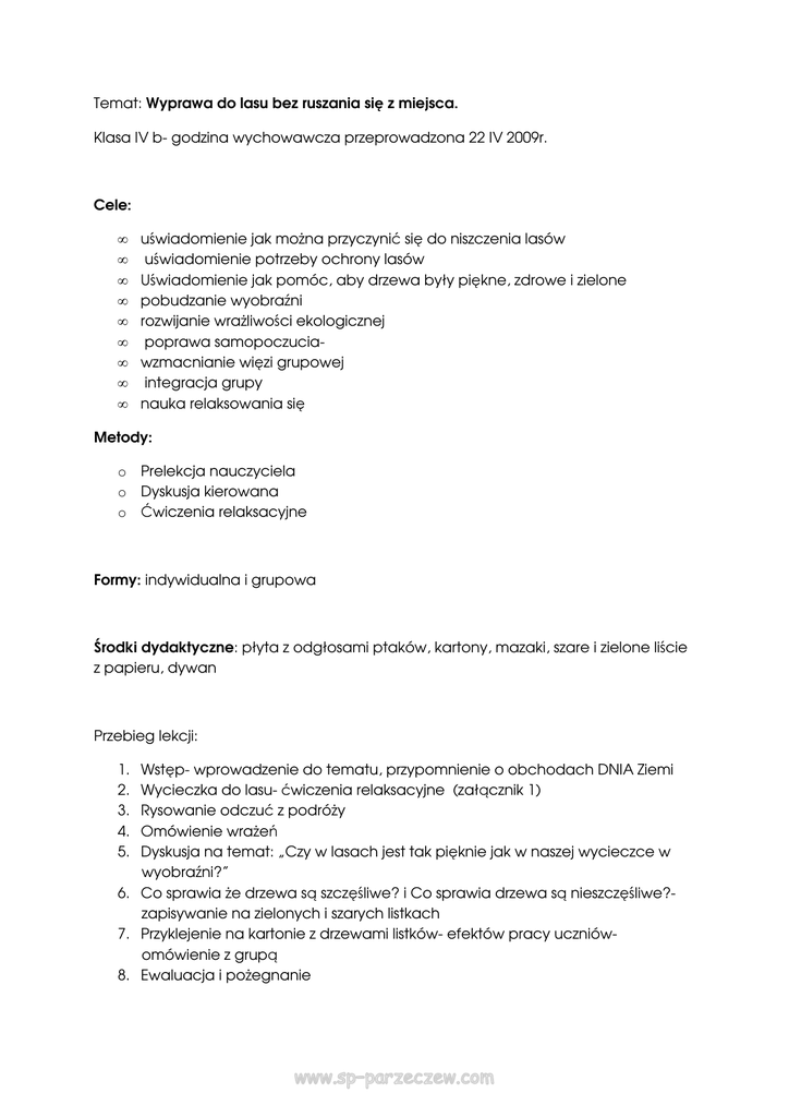 Temat: Wyprawa do lasu bez ruszania się z miejsca. Klasa IV b- godzina wychowawcza przeprowadzona 22 IV 2009r. Cele: • • • • • • • • • uświadomienie jak można przyczynić się do niszczenia lasów uświadomienie potrzeby ochrony lasów Uświadomienie jak pomóc, aby drzewa były piękne, zdrowe i zielone pobudzanie wyobraźni rozwijanie wrażliwości ekologicznej poprawa samopoczuciawzmacnianie więzi grupowej integracja grupy nauka relaksowania się Metody: o Prelekcja nauczyciela o Dyskusja kierowana o Ćwiczenia relaksacyjne Formy: indywidualna i grupowa Środki dydaktyczne: płyta z odgłosami ptaków, kartony, mazaki, szare i zielone liście z papieru, dywan Przebieg lekcji: 1. 2. 3. 4. 5. Wstęp- wprowadzenie do tematu, przypomnienie o obchodach DNIA Ziemi Wycieczka do lasu- ćwiczenia relaksacyjne (załącznik 1) Rysowanie odczuć z podróży Omówienie wrażeń Dyskusja na temat: „Czy w lasach jest tak pięknie jak w naszej wycieczce w wyobraźni?” 6. Co sprawia że drzewa są szczęśliwe? i Co sprawia drzewa są nieszczęśliwe?zapisywanie na zielonych i szarych listkach 7. Przyklejenie na kartonie z drzewami listków- efektów pracy uczniówomówienie z grupą 8. Ewaluacja i pożegnanie Załącznik 1 Czytany tekst: „Wyobraź sobie, że idziesz drogą przez las. Po obu stronach drogi widzisz różne drzewa: sosny, jodły, świerki, brzozy, dęby, klony i inne. Między drzewami przemknęła sarenka, w pobliżu przy drodze dostrzegasz zająca, który nieco spłoszony, nastawił uszy i znieruchomiał. Wśród gałęzi sosny skacze wiewiórka, zrzucając szyszki na ziemię. Słyszysz głos kukułki? W oddali dzięcioł uderza dziobem w pień drzewa. Wsłuchujesz się w piękne głosy ptaków, w ich śpiew. Między konarami drzew przenikają promienie Słońca.. Promienie docierają do ciebie. Słońce ogrzewa twoją twarz i całe ciało. Czujesz się wspaniale. Oddychasz głęboko, swobodnie powoli. Z każdym kolejnym oddechem wdychasz dobrą tęczowa energię, która ożywia twoje ciało. Tęczowa energia napełnia twoje płuca, aby lepiej oddychały, dopływa do twojego serca, które tętni radośniej. Z każdym kolejnym wydechem wydychasz wszystkie smutki, stresy, niepokoje, problemy. Ich miejsce zajmuje dobra energia, która sprawia, że czujesz się szczęśliwym człowiekiem. Masz poczucie bezpieczeństwa, spokoju i zrelaksowania. Zapamiętaj to wspaniałe uczucie. Zapamiętaj zapach lasu.” Mowę lasu” Za chwile powrócisz z krainy wyobraźni. Poczucie zrelaksowania, spokoju, bezpieczeństwa i szczęścia ci pozostanie. Powoli napnij stopy i rozluźnij. Napnij łydki i kolana. Rozluźnij. Napnij uda i pośladki. Rozluźnij. Napnij brzuch, rozluźnij. Napnij ramiona i barki. Rozluźnij. Napnij mięśnie twarzy i zmarszcz czoło. Rozluźnij. Przeciągnij się leniwie. Wykonaj głęboki wdech i wydech i powoli otwórz oczy.”