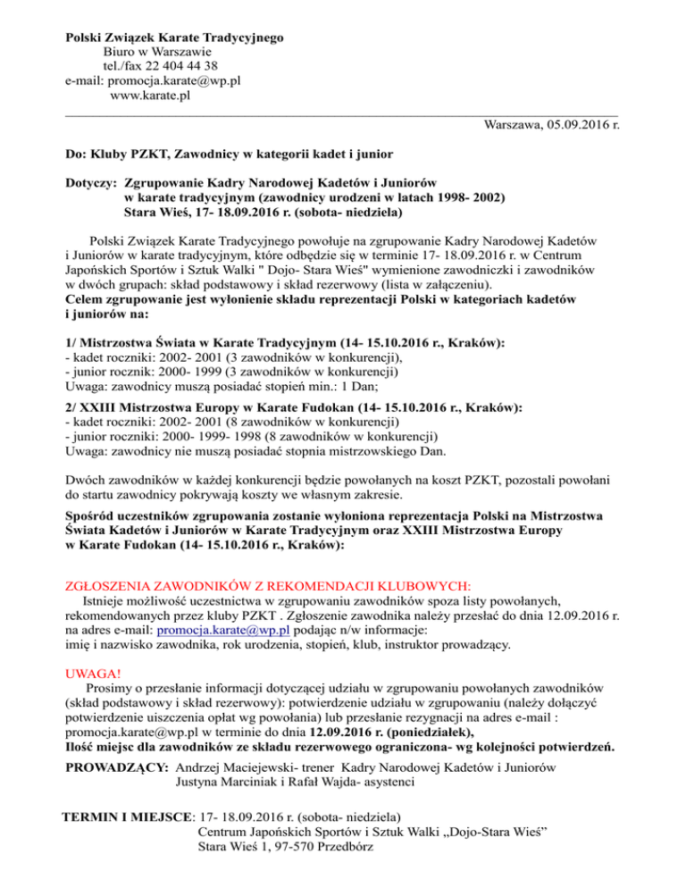 Polski Związek Karate Tradycyjnego Biuro w Warszawie tel./fax 22 404 44 38 e-mail: [email protected] www.karate.pl ________________________________________________________________________________ Warszawa, 05.09.2016 r. Do: Kluby PZKT, Zawodnicy w kategorii kadet i junior Dotyczy: Zgrupowanie Kadry Narodowej Kadetów i Juniorów w karate tradycyjnym (zawodnicy urodzeni w latach 1998- 2002) Stara Wieś, 17- 18.09.2016 r. (sobota- niedziela) Polski Związek Karate Tradycyjnego powołuje na zgrupowanie Kadry Narodowej Kadetów i Juniorów w karate tradycyjnym, które odbędzie się w terminie 17- 18.09.2016 r. w Centrum Japońskich Sportów i Sztuk Walki " Dojo- Stara Wieś" wymienione zawodniczki i zawodników w dwóch grupach: skład podstawowy i skład rezerwowy (lista w załączeniu). Celem zgrupowanie jest wyłonienie składu reprezentacji Polski w kategoriach kadetów i juniorów na: 1/ Mistrzostwa Świata w Karate Tradycyjnym (14- 15.10.2016 r., Kraków): - kadet roczniki: 2002- 2001 (3 zawodników w konkurencji), - junior rocznik: 2000- 1999 (3 zawodników w konkurencji) Uwaga: zawodnicy muszą posiadać stopień min.: 1 Dan; 2/ XXIII Mistrzostwa Europy w Karate Fudokan (14- 15.10.2016 r., Kraków): - kadet roczniki: 2002- 2001 (8 zawodników w konkurencji) - junior roczniki: 2000- 1999- 1998 (8 zawodników w konkurencji) Uwaga: zawodnicy nie muszą posiadać stopnia mistrzowskiego Dan. Dwóch zawodników w każdej konkurencji będzie powołanych na koszt PZKT, pozostali powołani do startu zawodnicy pokrywają koszty we własnym zakresie. Spośród uczestników zgrupowania zostanie wyłoniona reprezentacja Polski na Mistrzostwa Świata Kadetów i Juniorów w Karate Tradycyjnym oraz XXIII Mistrzostwa Europy w Karate Fudokan (14- 15.10.2016 r., Kraków): ZGŁOSZENIA ZAWODNIKÓW Z REKOMENDACJI KLUBOWYCH: Istnieje możliwość uczestnictwa w zgrupowaniu zawodników spoza listy powołanych, rekomendowanych przez kluby PZKT . Zgłoszenie zawodnika należy przesłać do dnia 12.09.2016 r. na adres e-mail: [email protected] podając n/w informacje: imię i nazwisko zawodnika, rok urodzenia, stopień, klub, instruktor prowadzący. UWAGA! Prosimy o przesłanie informacji dotyczącej udziału w zgrupowaniu powołanych zawodników (skład podstawowy i skład rezerwowy): potwierdzenie udziału w zgrupowaniu (należy dołączyć potwierdzenie uiszczenia opłat wg powołania) lub przesłanie rezygnacji na adres e-mail : [email protected] w terminie do dnia 12.09.2016 r. (poniedziałek), Ilość miejsc dla zawodników ze składu rezerwowego ograniczona- wg kolejności potwierdzeń. PROWADZĄCY: Andrzej Maciejewski- trener Kadry Narodowej Kadetów i Juniorów Justyna Marciniak i Rafał Wajda- asystenci TERMIN I MIEJSCE: 17- 18.09.2016 r. (sobota- niedziela) Centrum Japońskich Sportów i Sztuk Walki „Dojo-Stara Wieś” Stara Wieś 1, 97-570 Przedbórz PROGRAM: 17.09.2016 r. (sobota) godz. 12.00- 13.00- przyjazd, rejestracja i zakwaterowanie godz. 13.00- obiad godz. 15.00- 17.00- trening godz. 17.30- kolacja godz. 19.00- 21.00- trening godz. 21.30- spotkanie przy ognisku 18.09.2016 r. (niedziela) godz. 8.00- śniadanie godz. 10.00- 14.00- trening godz. 14.00- obiad, wykwaterowanie, wyjazd KOSZT: I. zawodnicy powołani- skład podstawowy: 1. koszt zakwaterowania i wyżywienia- pokrywa PZKT, 2. koszty podróży- we własnym zakresie, 3. koszt udziału w szkoleniu- 100,00 zł- we własnym zakresie, Płatność na n/w konto do dnia 12.09.2016 r. (prosimy o przesłanie potwierdzenia zapłaty na e-mail: [email protected]). II . zawodnicy powołani- skład rezerwowy: 1. koszt zakwaterowania i wyżywienia- 150,00 zł, 2. koszty podróży- we własnym zakresie, 3. koszt udziału w szkoleniu- 100,00 zł- we własnym zakresie. Płatność na n/w konto do dnia 12.09.2016 r. (prosimy o przesłanie potwierdzenia zapłaty na e-mail: [email protected]). UWAGA: W przypadku zapotrzebowania na fakturę VAT za pobyt- o takiej treści (podane kwoty są kwotami netto) prosimy nie wpłacać należności za zakwaterowanie i wyżywienie na podane konto PZKT. Szczegóły dotyczące uregulowania płatności oraz wystawienia faktury należy ustalić z panią Aliną Ładzińska z CJS i SW „ Dojo- Stara Wieś”: e-mail: [email protected], nr tel.: 512 086 059; (koszt szkolenia 100,00 zł niezmiennie na n/w konto). III . zakwalifikowani zawodnicy z rekomendacji klubowych : 1. koszt zakwaterowania i wyżywienia- 150,00 zł, 2. koszty podróży- we własnym zakresie, 3. koszt udziału w szkoleniu- 100,00 zł- we własnym zakresie Płatność na n/w konto po otrzymaniu informacji o zakwalifikowaniu zawodnika do udziału w zgrupowaniu, do dnia 14.09.2015 r. (prosimy o przesłanie potwierdzenia zapłaty na e-mail: [email protected]).). UWAGA: W przypadku zapotrzebowania na fakturę VAT za pobyt- o takiej treści (podane kwoty są kwotami netto) prosimy nie wpłacać należności za zakwaterowanie i wyżywienie na podane konto PZKT. Szczegóły dotyczące uregulowania płatności oraz wystawienia faktury należy ustalić z panią Aliną Ładzińska z CJSi SW „ Dojo- Stara Wieś”: e-mail: [email protected], nr tel.: 512 086 059; (koszt szkolenia 100,00 zł niezmiennie na n/w konto). Konto do wpłat: Polski Związek Karate Tradycyjnego 90- 057 Łódź, ul. Sienkiewicza 85/87 Nr konta: 06 8988 0001 0000 0017 8930 0007 treść: zgrupowanie kadry wrzesień 2016, imię i nazwisko zawodnika, klub NALEŻY ZABRAĆ m.in.: 1. karate-gi, 2. aktualne badania lekarskie od lekarza specjalisty w zakresie medycyny sportowej lub posiadającego certyfikat Polskiego Towarzystwa Medycyny Sportowej, 3. UWAGA- obowiązkowo: wymagane ochraniacze do kumite, 4. ręcznik. INFORMCJE DODATKOWE: 1. Po potwierdzeniu uczestnictwa, w sytuacji losowej uniemożliwiającej wzięcie udziału w zgrupowaniu prosimy o natychmiastowe pisemne przekazanie informacji na e-mail: [email protected] oraz telefonicznie: Andrzej Maciejewski tel.: 507 197 540, w przypadku po