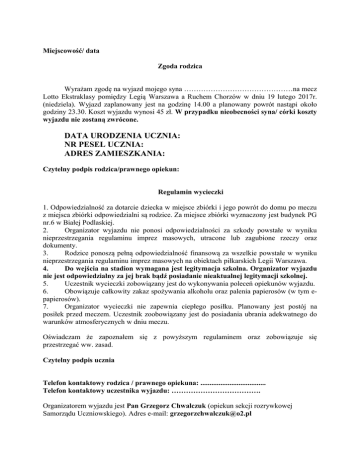 Miejscowość/ data Zgoda rodzica Wyrażam zgodę na wyjazd mojego syna ………………………………………na mecz Lotto Ekstraklasy pomiędzy Legią Warszawa a Ruchem Chorzów w dniu 19 lutego 2017r. (niedziela). Wyjazd zaplanowany jest na godzinę 14.00 a planowany powrót nastąpi około godziny 23.30. Koszt wyjazdu wynosi 45 zł. W przypadku nieobecności syna/ córki koszty wyjazdu nie zostaną zwrócone. DATA URODZENIA UCZNIA: NR PESEL UCZNIA: ADRES ZAMIESZKANIA: Czytelny podpis rodzica/prawnego opiekun: Regulamin wycieczki 1. Odpowiedzialność za dotarcie dziecka w miejsce zbiórki i jego powrót do domu po meczu z miejsca zbiórki odpowiedzialni są rodzice. Za miejsce zbiórki wyznaczony jest budynek PG nr.6 w Białej Podlaskiej. 2. Organizator wyjazdu nie ponosi odpowiedzialności za szkody powstałe w wyniku nieprzestrzegania regulaminu imprez masowych, utracone lub zagubione rzeczy oraz dokumenty. 3. Rodzice ponoszą pełną odpowiedzialność finansową za wszelkie powstałe w wyniku nieprzestrzegania regulaminu imprez masowych na obiektach piłkarskich Legii Warszawa. 4. Do wejścia na stadion wymagana jest legitymacja szkolna. Organizator wyjazdu nie jest odpowiedzialny za jej brak bądź posiadanie nieaktualnej legitymacji szkolnej. 5. Uczestnik wycieczki zobowiązany jest do wykonywania poleceń opiekunów wyjazdu. 6. Obowiązuje całkowity zakaz spożywania alkoholu oraz palenia papierosów (w tym epapierosów). 7. Organizator wycieczki nie zapewnia ciepłego posiłku. Planowany jest postój na posiłek przed meczem. Uczestnik zoobowiązany jest do posiadania ubrania adekwatnego do warunków atmosferycznych w dniu meczu. Oświadczam że zapoznałem się z powyższym regulaminem oraz zobowiązuje się przestrzegać ww. zasad. Czytelny podpis ucznia Telefon kontaktowy rodzica / prawnego opiekuna: .................................... Telefon kontaktowy uczestnika wyjazdu: ………………………………. Organizatorem wyjazdu jest Pan Grzegorz Chwalczuk (opiekun sekcji rozrywkowej Samorządu Uczniowskiego). Adres e-mail: [email protected]