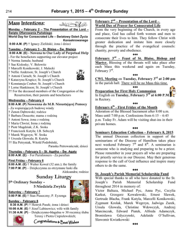 February 1, 2015 – 4th Ordinary Sunday 214 Mass Intentions: Monday – February 2 – The Presentation of the Lord – Święto Ofiarowania Pańskiego World Day for Consecrated Life – Światowy Dzień Życia Konsekrowanego 8:00 A.M. (P) † Ignacy Zieliński; żona i dzieci Tuesday – February 3 – St. Blaise – Św. Błażeja 8:00 A.M. (E) - Novena to Our Lady of Perpetual Help - For the benefactors supporting our elevator project † Norma Jamula; husband † Sue Kislosky; V. Belowitz † Marcelli Konikowski; J. Malecki † Nellie Anderson; St. Joseph’s Church † Antoni Cierach; St. Joseph’s Church † Katarzyna Krupicz; St. Joseph’s Church † Konstancja Czuber; St. Joseph’s Church † Lorne Hankinson; St. Joseph’s Church †† For the deceased members of the Congregation of the Resurrection, their parents and benefactors Wednesday – February 4 8:00 A.M. (P) Nowenna do M.B. Nieustającej Pomocy - Za wspierających budowę windy † Zenon Dąbrowski; rodzice † Barbara Doucette; mama z rodziną † Antoni Sowa; żona z rodziną † Maria Chwist; Irena z rodziną † Piotr Magdziak; Z.K. Sroka † Franciszek Kutyła; I.B. Sobczyk † Marek Węgrzyn; W. Sroka † Urszula Głowala; B. Kutyła †† Ilia Petryniak, Witold Podobiński, Paraska Petrowańczuk; dzieci Thursday – February 5 – St. Agatha – Św. Agaty 8:00 A.M. (E) – For Parishioners - Za parafian First Friday – February 6 8:00 A.M. (E) † Walter Kowal (32 ann.); the family 7:00 P.M. (P) – Dziękczynna za otrzymane łaski dla Aleksandra; rodzice Sunday Liturgy 5th Ordinary Sunday – 5 Niedziela Zwykła Saturday – February 7 5:00 P.M. (E) † Stan Piaseczny; P. Eyzenga Sunday - February 8 8:30 A.M. (P) † Henryk Pasek; żona i dzieci 10:00 A.M. (E) † Józef Labinowicz; wife with family 11:30 A.M. (P) – Dziękczynno-błagalna w 30 rocznicę ślubu Teresy i Piotra Ciepielewskich; February 2nd – Presentation of the Lord – World Day of Prayer for Consecrated Life From the very beginning of the Church, in every age and place, God has called forth women and men to consecrate their lives to him. They follow Christ with greater dedication and imitate him more closely through the practice of the evangelical counsels: chastity, poverty and obedience. ♦♦♦ rd February 3 - Feast of St. Blaise, Bishop and Martyr. Blessing of the throats will take place after each Mass this weekend and again on Tuesday, February 3rd. ♦♦♦ CWL Meeting on Tuesday, February 3rd at 2:00 pm in the parish hall. There will be no Mass this time. ♦♦♦ Preparation for First Holy Communion In English on Tuesday, February 3rd at 6:00 P.M. in Rectory. ♦♦♦ February 6th - First Friday of the Month Adoration of the Blessed Sacrament after 8:00 a.m. Mass until 7:00 p.m. Confessions from 6:15 – 6:45 p.m. Today Fr. Adam will be visiting shut-ins in their private homes. ♦♦♦ Seminary Education Collection – February 8, 2015 The annual Diocesan collection in support of the seminarians of the Diocese of Hamilton takes place next weekend February 7th and 8th. A seminarian is someone who is studying and preparing to be a priest. Please remember in your prayers all who are preparing for priestly service in our Diocese. May their generous response to the call of God influence and inspire many others to do the same. ♦♦♦ St. Joseph’s Parish Memorial Scholarship Fund With special thanks to all who have donated to the St. Joseph’s Parish Memorial Scholarship Fund throughout 2014 in memory of: Victor Baltaza, Michael Pyc, Anna Pyc, Cecylia Karkut, Grzegorz Kowalewski, Ernest Slawek, Gertrude Blacha, Frank Kutyla, Marcelli Konikowski, Zygmunt Krolak, Marek Wegrzyn, Jadwiga Zurek, Ursula Glowala, Christine Wdowczyk, Andrzej Marcinczak, Edward Piatek, Alfreda Adamczyk, Bronislawa Gdyczynski, Adelaide O’Sullivan, Slawomir Kwiatkowski ♦♦♦ 1 luty 2015 r. – 4 Niedziela Zwykła 214 Pierwszy Piątek Miesiąca – 6 luty Całodzienna adoracja Najświętszego Sakramentu. Spowiedź św. od godz. 6:15 - 6:45 wieczorem. Msza św. o godz. 7:00. Po Mszy św. wymiana Tajemnic Różańcowych. W tym dniu ks. Proboszcz odwiedzi chorych w domach prywatnych. Sunday, January 25, 2015 5:00pm 8:30am 10:00am 11:30am Total Offertory $ 678.00 $ 583.00 $ 592.00 $ 700.00 $ 2,553.00 Elevator $ 30.00 $ $ 5.00 $ $ 35.00 Elevator in memory of Ted Sarna ♦♦♦ $ 90.00 Total donations for the Elevator Project in January: January 1st and 4th January 11th January 18th January 25th Total $ 380.00 $ 3,455.00 $ 820.00 $ 125.00 $ 4,780.00 Thank you for your generous and faithful support! Niech Pan Bóg w swej łaskawości wynagrodzi waszą ofiarność. 2 lutego - Święto Ofiarowania Pańskiego Światowy Dzień Życia Konsekrowanego W Kościele Katolickim w Święto Ofiarowania Pańskiego 2 lutego obchodzony jest Dzień Życia Konsekrowanego. Obejmijmy dzisiaj naszą ufną modlitwą wszystkie osoby konsekrowane: zakonnice i zakonników, mniszki i mnichów, pustelników i świeckich konsekrowanych, dziewice poświęcone Bogu i wdowy konsekrowane – wszyscy oni należą bowiem do jednej rodziny osób prowadzących życie konsekrowane, którego istota polega na naśladowaniu Chrystusa poprzez zachowywanie ślubów czystości, ubóstwa i posłuszeństwa. Prośmy za nimi szczególnie w trwającym obecnie Roku Życia Konsekrowanego. ♦♦♦ 3 lutego - Św. Błażeja, biskupa i męczennika Błogosławieństwo gardeł w sobotę i w niedzielę 31 stycznia i 1 lutego po każdej Mszy św. oraz 3 lutego po Mszy św. o godz. 8:00 rano. ♦♦♦ Zebranie Katolickiej Ligi Kobiet we wtorek 3 lutego o godz. 2:00 po południu. Wyjątkowo nie będzie Mszy św. ♦♦♦ Przygotowanie do Pierwszej Komunii św. we wtorek 3 lutego o godz. 6:00 wieczorem. Lekcje w języku polskim odbywają się w sali parafialnej, a w języku angielskim tego samego dnia i o tej samej godzinie na plebanii. ♦♦♦ Dzień Modlitw Przeciw Handlowi Ludźmi W ramach Roku 
