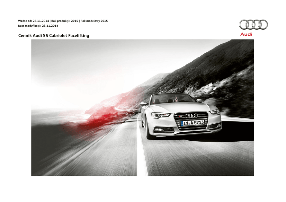 Ważne od: 28.11.2014 | Rok produkcji: 2015 | Rok modelowy 2015 Data modyfikacji: 28.11.2014 Cennik Audi S5 Cabriolet Facelifting Ważne od: 28.11.2014 | Rok produkcji: 2015 | Rok modelowy 2015 Data modyfikacji: 28.11.2014 Cennik Audi S5 Cabriolet Facelifting Modele bazowe Silnik Moc [l] [ kW / KM ] 3.0 TFSI quattro 245/333 Skrzynia biegów Kod Cena z VAT [ PLN ] S tronic 8F7SCY 299 700 Do podanych cen należy doliczyć koszty transportu i przygotowania samochodu do wydania w łącznej kwocie 670 PLN brutto. Przedstawione informacje są aktualne w momencie publikacji. Zastrzega się możliwość wprowadzania zmian bez uprzedzenia. Cennik nie stanowi oferty w rozumieniu prawa. 2 Ważne od: 28.11.2014 | Rok produkcji: 2015 | Rok modelowy 2015 Data modyfikacji: 28.11.2014 Cennik Audi S5 Cabriolet Facelifting Wyposażenie standardowe Bezpieczeństwo Napęd quattro ® ABS z EBV oraz ESP Poduszki powietrzne, dla kierowcy i pasażera Poduszki powietrzne, boczne z przodu i kurtyny chroniące głowy z przodu i z tyłu Światła przeciwmgielne z przodu zintegrowane w zderzaku Reflektory ksenonowe plus ze światłami do jazdy dziennej LED (zawiarają układ zmywania reflektorów Elektromechaniczne wspomaganie układu kierowniczego zależne od prędkości Immobiliser Przygotowanie do podłączenia urządzeń monitorujących skradziony pojazd Czujnik zmierzchowy świateł i czujnik deszczu Czujnik kontroli zapięcia pasów bezpieczeństwa dla foteli przednich Wskaźnik kontroli ciśnienia w oponach Tire mobility set - zestaw naprawczy do opon Komfort Regulacja podparcia odcinka lędźwiowego kręgosłupa, elektryczna Fotele przednie, sportowe z elektryczną regulacją ustawień Easy Entry - funkcja komfortowego wsiadania i wysiadania System radiowy "Concert" z odtwarzaczem CD i mp3 z 6,5 calowym kolorowym wyświetlaczem + 8 głośników Klimatyzacja automatyczna Szyby boczne z przodu i z tyłu regulowane elektrycznie Komputer pokładowy z funkcją optymalizacji zużycia paliwa z kolorowym wyświetlaczem Centralny zamek sterowany falami radiowymi • dostępne wyposażenie | - niedostępne wyposażenie 3 Ważne od: 28.11.2014 | Rok produkcji: 2015 | Rok modelowy 2015 Data modyfikacji: 28.11.2014 Cennik Audi S5 Cabriolet Facelifting Wyposażenie standardowe Dysze spryskiwaczy, ogrzewane Wnętrze Kierownica wielofunkcyjna, sportowa z funkcją zmiany przełożeń, obszyta skórą z emblematem S5 ze szwem ozdobnym w kontrastowym kolorze Podłokietnik z przodu z 2 gniazdami zasilającymi 12V, przesuwany Kanapa tylna z dzielonym i składanym oparciem Tapicerka Alcantara z elementami skórzanymi Pearlnappa (środek siedzeń Alcantara, boki i zagłówki obszyte skórą) Aplikacje ozdobne wokół elementów obsługi na desce rozdzielczej, aluminiowe Aplikacje dekoracyjne z matowego aluminium Progi w drzwiach z emblematem "S", aluminiowe Pakiet "Oświetlenie wnętrza" Pakiet "Schowek" Uchwyty w podłodze bagażnika do mocowania bagażu, 4 sztuki Dywaniki welurowe z przodu i z tyłu Isofix - mocowanie fotelika dziecięcego na skrajnych siedzeniach z tyłu Wyposażenie zewnętrzne Listwa ozdobna wokół szyby przedniej z matowego aluminium Dach izolowany akustycznie, elektrycznie składany Zawieszenie sportowe typu S Windschot - osłona przeciwwiatrowa Gniazdo zasilające 12V w bagażniku Zderzaki przednie i tylne w stylistyce sportowej, w kolorze nadwozia, wykończone listwami w kolorze aluminium Singleframe w odcieniu szarym Platinum z chromowanymi listwami pionowymi z emblematem S5 Lusterka zewnętrzne w aluminiowej obudowie, regulowane elektrycznie i ogrzewane • dostępne wyposażenie | - niedostępne wyposażenie 4 Ważne od: 28.11.2014 | Rok produkcji: 2015 | Rok modelowy 2015 Data modyfikacji: 28.11.2014 Cennik Audi S5 Cabriolet Facelifting Wyposażenie standardowe Obręcze ze stopu metali lekkich, 8,5 J x 18, 5-ramienne w stylistyce S, opony 245/40 R18 Układ wydechowy: podwójne owalne końcówki po obu stronach Śruby zabezpieczające koła przed kradzieżą Zestaw narzędzi samochodowych Trójkąt ostrzegawczy i apteczka Program serwisowy Audi Extensive Program serwisowy 3 lata / 90 000 km. Efektywna ochrona przed kosztami nieprzewidzianych napraw przez rok po upływie fabrycznej gwarancji. • dostępne wyposażenie | - niedostępne wyposażenie 5 Ważne od: 28.11.2014 | Rok produkcji: 2015 | Rok modelowy 2015 Data modyfikacji: 28.11.2014 Cennik Audi S5 Cabriolet Facelifting Kolory nadwozia Kod Opis Kod Opis Kod Opis Standardowe Metaliczne Perłowe Dach czarny T9PA biały Ibis 2YPA biały Gletscher N9PA czerwony Misano A2PA czarny Brillant 0EPA czarny Mythos E9PA niebieski Sepang 1GPA czerwony Vulkan 6YPA szary Daytona W1PA niebieski Moonlight D2PA niebieski Utopia L5PA srebrny Florett 0CPA szary Monsoon Q2PA szary Tornado Standardowe Metaliczne Perłowe Dach brązowy T9PW biały Ibis 2YPW biały Gletscher L8PW czarny Phantom A2PW czarny Brillant 0EPW czarny Mythos N9PW czerwony Misano W1PW niebieski Moonlight D2PW niebieski Utopia L5PW srebrny Florett 0CPW szary Monsoon Q2PW szary Tornado Standardowe Metaliczne Perłowe T9SF biały Ibis 2YSF biały Gletscher L8SF czarny Phantom czarny Brillant 0ESF czarny Mythos N9SF czerwony Misano W1SF niebieski Moonlight D2SF niebieski Utopia A2SF 6 Dach czerwony Ważne od: 28.11.2014 | Rok produkcji: 2015 | Rok modelowy 2015 Data modyfikacji: 28.11.2014 Cennik Audi S5 Cabriolet Facelifting Kolory nadwozia Kod Opis Standardowe Kod Opis Kod Metaliczne L5SF srebrny Florett 0CSF szary Monsoon Q2SF szary Tornado Opis Perłowe Dach czarny Dach szary Standardowe Metaliczne Perłowe T9SW biały Ibis 2YSW biały Gletscher L8SW czarny Phantom A2SW czarny Brillant 0ESW czarny Mythos N9SW czerwony Misano W1SW niebieski Moonlight D2SW niebieski Utopia L5SW srebrny Florett 0CSW szary Monsoon Q2SW szary Tornado 7 Ważne od: 28.11.2014 | Rok produkcji: 2015 | Rok modelowy 2015 Data modyfikacji: 28.11.2014 Cennik Audi S5 Cabriolet Facelifting Tapicerk Alcantara/ Pearlnappa Fote