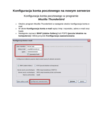 Konfiguracja konta pocztowego na nowym serwerze Konfiguracja konta pocztowego w programie Mozilla Thunderbird • • • Otwórz program Mozilla Thunderbird a następnie otwórz konfiguracja konta email W oknie Konfiguracja konta e-mail wpisz Imię i nazwisko, adres e-mail oraz hasło Następnie zaznacz IMAP (zdalne foldery) lub POP3 (poczta lokalnie na komputerze) i kliknij przycisk Konfiguracja zaawansowana Konfiguracja dla IMAP: • Dla Serwera poczty przychodzącej IMAP: o o o o • Dla serwera poczty wychodzącej SMTP: o o o o • Adres serwera: mail1.komandor.pl Port 993 SSL: SSL/TLS Uwierzytelnienie: Normalne hasło Adres serwera: mail1.komandor.pl Port: 465 SSL: SSL/TLS Uwierzytelnienie: Normalne hasło Następnie kliknij przycisk Gotowe Konfiguracja dla POP3 • Dla Serwera poczty przychodzącej POP3: o o o o • Dla serwera poczty wychodzącej SMTP: o o o o • Adres serwera: mail1.komandor.pl Port 995 SSL: SSL/TLS Uwierzytelnienie: Normalne hasło Adres serwera: mail1.komandor.pl Port: 465 SSL: SSL/TLS Uwierzytelnienie: Normalne hasło Następnie kliknij przycisk Gotowe Jeśli skonfigurowałeś konto, a Twoja poczta nadal nie działa, sprawdź działanie poczty za pomocą strony internetowej https://webmail.komandor.pl. Jeśli twoja poczta nadal nie działa, skontaktuj się z Administratorem. Dodatkowe informacje • dostęp do poczty można uzyskać również logując się na stronie https://webmail.komandor.pl - przeglądarka w opcjach musi mieć włączone TLS o przez dowolny program pocztowy (Outlook, TheBat, Thunderbird itp.) o przez telefon komórkowy https://help.komandor.pl/help/imap_tel/imap_tel.html o przez telefon komórkowy - aplikacja Poczta https://webmail.komandor.pl/horde/imp/redirect.php?autologin=&url= %2Fhorde%2Fmimp%2Findex.php webmail.komandor.pl i wybieramy opcję mimp. o W razie problemów skorzystaj ze strony pomocy https://help.komandor.pl lub skontaktuj się z Administratorem sieci.