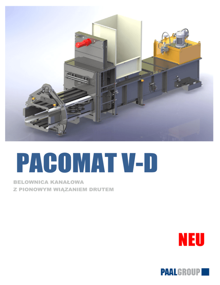 PACOMAT V-D BELOWNICA KANAŁOWA Z PIONOWYM WIĄZANIEM DRUTEM NEU Dane techniczne i wymiary PACOMAT Nacisk Nacisk jednostkowy Przekrój kanału Otwór zasypowy Objętość zasypowa Ilość drutów wiążących Moc napędowa Wydajność objętościowa (na biegu jałowym) Wydajność objętościowa (w trakcie pracy) t (kN) N/cm² cm cm ok. m3 sztuk kW maks. m³/h maks. m³/h V-50 D V-65 D V-80 D 50 (486) 65 (633) 82 (802) 59 77 97 75 x 110 75 x 110 75 x 110 125 x 102 145 x 102 160 x 102 1,55 1,75 1,85 4 4 4 15 22 37 45 15 22 37 45 55 75 15 22 37 45 55 75 2*37 2*45 422 422 617 617 339 339 505 505 742 675 275 275 416 416 624 624 741 741 145 180 275 300 125 155 235 260 335 380 105 130 205 225 295 335 365 395 Wydajność (w odniesieniu do ciężaru nasypowego) • 35 kg/m3 np. karton • 50 kg/m3 np. papier mieszany Ciężar prasy (w zależności od wyposażenia) ok. t/h ok. t/h ok. t Wymiary w mm 5,1 6,9 6,3 9,6 10,5 4,4 8,6 12,8 14,0 5,9 12 A 5,4 8,2 9,1 11,7 13,3 3,7 7,3 11,1 12,2 15,6 17,7 5,1 13 B D E G H I 4,6 6,3 K 7,2 7,9 10,3 11,7 12,8 13,8 9,8 10,8 14,0 16,1 17,3 18,7 17 L N P PACOMAT V-50 D 8212 1915 1250 3475 4100 4112 1515 350 750 1020 1100 PACOMAT V-65 D 8866 1915 1450 3720 4445 4421 1515 350 750 1020 1100 PACOMAT V-80 D 9450 1915 1600 3870 4670 4780 1555 390 750 1020 1100 Dodatkowe cechy nowej prasy PACOMAT D: Zwiększona wydajność i ciężar balotów przy mniejszym zużyciu energii elektrycznej poprzez: • zastosowanie zmodernizowanej konstrukcji noża, wybijaka materiału i kanału prasy • zastosowanie nowoczesnych pomp tłoczkowych o niskich mocach napędowych • zastosowanie nowego systemu zaworów DESITRONIC umożliwiającego różnorodne sterowanie trzystronnym, automatycznym zwężaczem kanału przy belowaniu rozmaitych materiałów • modułowy koncept zasypu i standardowy format balotów • nowy panel dotykowy TP 700 umożliwiający prostą obsługę w zakresie zarządzania rezeptami z obszernymi funkcjami i wyświetlaczem danych najnowszy stan techniki zgodny z ogłoszoną w 2013 Normą C dotyczącą pras kanałowych (EN 16252) www.paalgroup.com Stand 10/15