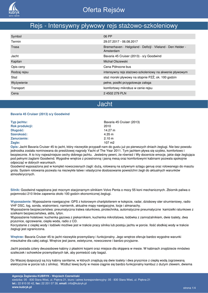 Oferta Rejsów Rejs - Intensywny pływowy rejs stażowo-szkoleniowy Symbol 06 PP Termin 29.07.2017 - 06.08.2017 Trasa Bremerhaven - Helgoland - Delfzijl - Vlieland - Den Helder Amsterdam Jacht Bavaria 45 Cruiser (2013) - s/y Goodwind Kapitan Michał Olszewski Opis ceny Cena Północne bus Rodzaj rejsu intensywny rejs stażowo-szkoleniowy na akwenie pływowym Staż staż morski pływowy na stopnie PZŻ, ok. 100 godzin Wyżywienie pełne, posiłki przygotowuje załoga Transport komfortowy mikrobus w cenie rejsu Cena 2 4502 279 PLN Jacht Bavaria 45 Cruiser (2013) s/y Goodwind Typ jachtu: Bavaria 45 Cruiser (2013) Rok produkcji: 2010 Długość: 14.27 m Szerokość: 4.35 m Zanurzenie: 2.10 m Żagle: 107 m2 Opis: Jacht Bavaria Cruiser 45 to jacht, który niezwykle przypadł nam do gustu już po pierwszych dniach żeglugi. Nie bez powodu jednostka została nominowana do prestiżowej nagrody Yacht of The Year 2011. Tym jachtem pływa się szybko, komfortowo i bezpiecznie. A to trzy najważniejsze cechy dobrego jachtu. Jesteśmy pewni, że również i Wy docenicie emocje, jakie daje żeglująca pod pełnymi żaglami Goodwind. Wygodne wnętrze z przestronną i jasną mesą oraz komfortowymi kabinami pozwala spokojnie odpocząć w dobrych warunkach. Goodwind wyposażona jest w komplet nowoczesnych żagli: dużą, rolowaną na sztywnym sztagu genuę oraz rolowanego do masztu grota. System rolowania pozwala na niezwykle łatwe i elastyczne dostosowanie powieżchni żegli do aktualnych warunków atmosferycznych. Silnik: Goodwind napędzana jest mocnym stacjonarnym silnikiem Volvo Penta o mocy 55 koni mechanicznych. Zbiornik paliwa o pojemności 210 litrów zapewnia około 100 godzin ekonomicznej żeglugi. Wyposażenie: Wyposażenie nawigacyjne: GPS z kolorowym chartplotterem w kokpicie, radar, dziobowy ster strumieniowy, radio VHF DSC, log, sonda, wiatromierz, namiernik, aktualne mapy nawigacyjne, locje i almanachy. Wyposażenie bezpieczeństwa: pneumatyczna tratwa ratunkowa, pirotechnika, automatyczne pneumatyczne kamizelki ratunkowe z szelkami bezpieczeństwa, aldis, tyfon. Wyposażenie hotelowe: kuchenka gazowa z piekarnikiem, kuchenka mikrofalowa, lodówka z zamrażalnikiem, dwie toalety, dwa prysznice, ogrzewanie, ciepła woda, radio z CD. Korzystanie z ciepłej wody i lodówki możliwe jest w trakcie pracy silnika lub postoju jachtu w porcie. Ilość słodkiej wody w trakcie żeglugi jest ograniczona. Wnętrze: Bavaria Cruiser 45 to jacht niezwykle przemyślany i funkcjonalny. Jego wnętrze oferuje bardzo wygodne warunki mieszkalne dla całej załogi. Wnętrze jest jasne, estetyczne, nowoczesne i bardzo przyjazne. Jacht posiada cztery dwuosobowe kabiny z płaskimi kojami oraz miejsce dla skippera w mesie. W kabinach znajdziecie mnóstwo szafeczek i schowków przemyślanych tak, aby pomieścić cały bagaż. Do Waszej dyspozycji są trzy kabiny sanitarne, w których znajdują się dwie toalety i dwa prysznice z ciepłą wodą (ogrzewaną elektrycznie w porcie lub z silnika). Wzdłuż lewej burty w mesie ciągnie się bardzo funkcjonalny kambuz z dużym zlewem, dwiema Agencja Żeglarska KUBRYK - Wojciech Czerwiński siedziba: 05 - 830 Stara Wieś, ul. Piękna 21, biuro i adres korespondencyjny: 05 - 830 Stara Wieś, ul. Piękna 21 tel.: 22 810 00 42, fax: 22 201 07 38, email: [email protected] www.kubryk.pl strona 1/4 Oferta Rejsów lodówkami, kuchenką gazową z piekarnikiem. Przestronna i doświetlona dziennym światłem mesa wygodnie pomieści całą załogę w trakcie posiłków. Jesteśmy pewni, że docenicie nie tylko emocje żeglarskie jakich przysparza ten jacht, ale również wygodę jaką oferuje załodze. Zdjęcia przedstawiają jacht typu Bavaria Cruiser 45 z rocznika 2010. Nie są to zdjęcia s/y Goodwind. Trasa Bremerhaven - Helgoland - Delfzijl - Vlieland - Den Helder - Amsterdam Morze Północne nie jest tak straszne jak je malują. Wbrew obiegowej opinii warunki od lipca do połowy września są tu znacznie lepsze niż na Bałtyku. Tak, Morze Północne potrafi zachwycić żeglugą w pięknej pogodzie i doskonałym wiatrem. Pokochamy je za długą falę, kolor i zapach wody, za Londyn, Amsterdam i Helgoland, które ma w zanadrzu. Joseph Conrad napisał: „Na morzu wszystko można znaleźć, zależnie od tego, czego się szuka – walkę, spokój, romantyzm, najskrajniejszy naturalizm, ideały, nudę, wstręt, natchnienie…” To prawda, na Morzu Północnym można znaleźć wszystko, choć najtrudniej doszukać się nudy Północne pozwoli odbyć rejs stażowo-szkoleniowy na wodach pływowych. Podszkolić się z nawigacji i locji. Przeżyć przygodę życia. Zrealizować marzenia i stworzyć niezapomniane wspomnienia . Zaokrętowanie W sobotę, o godzinie 23:30 ze Szczecina wyruszy mikrobus, który zawiezie załogę do mariny w Bremerhaven. Na miejsce dotrzemy około 06:30 w niedzielę. Od razu zaczniemy sztauowanie prowiantu i rzeczy osobistych, zapoznanie z jachtem i jego obsługą, szkolenie z zasad bezpieczeństwa, podział na wachty, omówienie planu rejsu i aktualnej prognozy pogody. Czy wypłyniemy jeszcze tego samego dnia czy zostaniemy w porcie na noc? Na to pytanie odpowie kapitan po sprawdzeniu prognozy pogody i rozmowie z załogą. Etap Bremerhaven - Helgoland Rozpoczynając rejs w Bremerhaven nie powinniśmy pominąć pominąć wizyty w Narodowym Muzeum Morskim i niezwykłym Atlanticum, które w nowoczesny i atrakcyjny sposób pokazuje życie Morza Północnego i Oceanu Atlantyckiego. Po tych dwóch atrakcjach pozostaje opuścić port i wypłynąć na Wezerę, która wraz z odpływem szybko wyniesie nas na otwarte Morze Północne. Po kilku godzinach Helgoland powinien zamajaczyć na horyzoncie. Jest to niezwykła wysepka zagubiona na wodach Zatoki Niemieckiej. Niezwykła choćby z tego względu, że jeszcze w XI wieku miała powierzchnię 900 kilometrów kwadratowych, gdy dzisiaj ma już niespełna 1 km2! Doskonale obrazuje to niszczącą siłę fal Morza Półno