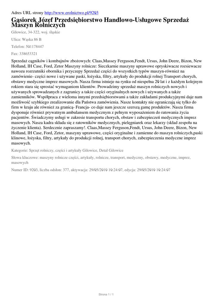 Adres URL strony http://www.erolnictwo.pl/9203 Gąsiorek Józef Przedsiębiorstwo Handlowo-Usługowe Sprzedaż Maszyn Rolniczych Gilowice, 34-322, woj. śląskie Ulica: Wąska 86 B Telefon: 501178447 Fax: 338653321 Sprzedaż cągników i kombajnów zbożowych: Claas,Massey Ferguson,Fendt, Ursus, John Deere, Bizon, New Holland, IH Case, Ford, Zetor Maszyny rolnicze: Sieczkarnie maszyny uprawowe opryskiwacze rozsiewacze nawozu rozrzutniki obornika i przyczepy Sprzedaż części do wszystkich typów maszyn-również na zamówienie- części nowe i używane paski, łożyska, filtry, artykuły do produkcji rolnej Transport chorych, obstawy medyczne imprez masowych. Nasza firma istnieje na rynku od niespełna 20 lat i z każdym kolejnym rokiem stara się sprostać wymaganiom klientów. Prowadzimy sprzedaż maszyn rolniczych nowych i używanych sprowadzanych z zagranicy a także części oryginalnych nowych i używanych a także zamienników. Współpraca z wieloma innymi przedsiębiorstwami a także zakładami produkcyjnymi daje nam możliwość szybkiego zrealizowanie dla Państwa zamówienia. Nasze kontakty nie ograniczają się tylko do firm w kraju ale również za granicą- Francja- co daje nam jeszcze szerszą gamę produktów. Nasza firma dysponuje również prywatnym ambulansem medycznym z pełnym wyposażeniem do ratowania życia pacjentów. Świadczymy usługi w zakresie transportu chorych, obstaw i zabezpieczeń medycznych imprez masowych. Nasza kadra składa się z ratowników medycznych, pielęgniarek oraz lekarzy (skład zespołu na życzenie klienta). Serdecznie zapraszamy!. Claas,Massey Ferguson,Fendt, Ursus, John Deere, Bizon, New Holland, IH Case, Ford, Zetor, maszyny uprawowe, części oryginalne i zamienne do maszyn rolniczych,paski klinowe, łożyska, filtry, artykuły do produkcji rolnej, transport chorych, zabezpieczenia medyczne imprez masowych. Kategorie: Sprzęt rolniczy, części i artykuły Gilowice, Detal Gilowice Słowa kluczowe: maszyny rolnicze części, artykuły, rolnicze, transport, medyczny, obstawy, medyczne, imprez, masowych Numer ID: 9203, liczba odsłon: 377, aktywacja: 29/05/2010 10:24:07, edycja: 29/05/2010 10:24:07 Strona 1 / 1