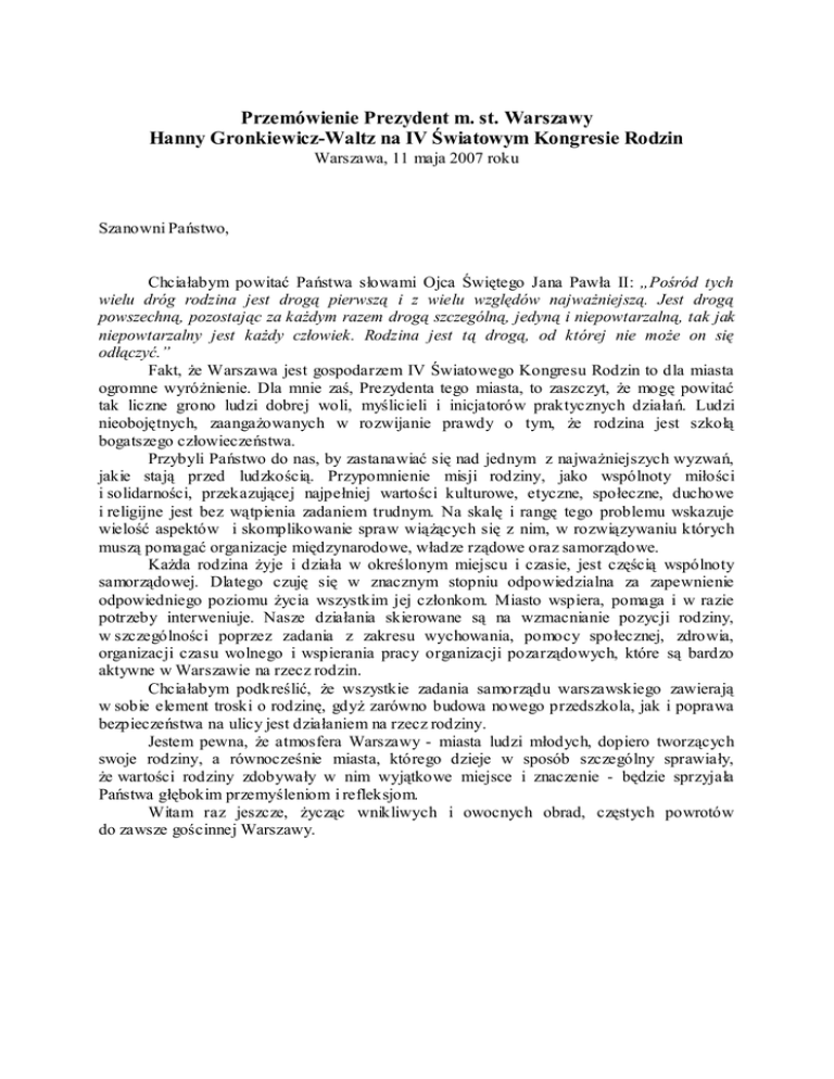 Przemówienie Prezydent m. st. Warszawy Hanny Gronkiewicz-Waltz na IV Światowym Kongresie Rodzin Warszawa, 11 maja 2007 roku Szanowni Państwo, Chciałabym powitać Państwa słowami Ojca Świętego Jana Pawła II: „Pośród tych wielu dróg rodzina jest drogą pierwszą i z wielu względów najwaŜniejszą. Jest drogą powszechną, pozostając za kaŜdym razem drogą szczególną, jedyną i niepowtarzalną, tak jak niepowtarzalny jest kaŜdy człowiek. Rodzina jest tą drogą, od której nie moŜe on się odłączyć.” Fakt, Ŝe Warszawa jest gospodarzem IV Światowego Kongresu Rodzin to dla miasta ogromne wyróŜnienie. Dla mnie zaś, Prezydenta tego miasta, to zaszczyt, Ŝe mogę powitać tak liczne grono ludzi dobrej woli, myślicieli i inicjatorów praktycznych działań. Ludzi nieobojętnych, zaangaŜowanych w rozwijanie prawdy o tym, Ŝe rodzina jest szkołą bogatszego człowieczeństwa. Przybyli Państwo do nas, by zastanawiać się nad jednym z najwaŜniejszych wyzwań, jakie stają przed ludzkością. Przypomnienie misji rodziny, jako wspólnoty miłości i solidarności, przekazującej najpełniej wartości kulturowe, etyczne, społeczne, duchowe i religijne jest bez wątpienia zadaniem trudnym. Na skalę i rangę tego problemu wskazuje wielość aspektów i skomplikowanie spraw wiąŜących się z nim, w rozwiązywaniu których muszą pomagać organizacje międzynarodowe, władze rządowe oraz samorządowe. KaŜda rodzina Ŝyje i działa w określonym miejscu i czasie, jest częścią wspólnoty samorządowej. Dlatego czuję się w znacznym stopniu odpowiedzialna za zapewnienie odpowiedniego poziomu Ŝycia wszystkim jej członkom. Miasto wspiera, pomaga i w razie potrzeby interweniuje. Nasze działania skierowane są na wzmacnianie pozycji rodziny, w szczególności poprzez zadania z zakresu wychowania, pomocy społecznej, zdrowia, organizacji czasu wolnego i wspierania pracy organizacji pozarządowych, które są bardzo aktywne w Warszawie na rzecz rodzin. Chciałabym podkreślić, Ŝe wszystkie zadania samorządu warszawskiego zawierają w sobie element troski o rodzinę, gdyŜ zarówno budowa nowego przedszkola, jak i poprawa bezpieczeństwa na ulicy jest działaniem na rzecz rodziny. Jestem pewna, Ŝe atmosfera Warszawy - miasta ludzi młodych, dopiero tworzących swoje rodziny, a równocześnie miasta, którego dzieje w sposób szczególny sprawiały, Ŝe wartości rodziny zdobywały w nim wyjątkowe miejsce i znaczenie - będzie sprzyjała Państwa głębokim przemyśleniom i refleksjom. Witam raz jeszcze, Ŝycząc wnikliwych i owocnych obrad, częstych powrotów do zawsze gościnnej Warszawy.