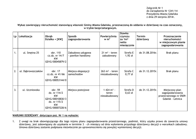 Załącznik Nr 1 do Zarządzenia Nr 1241/14 Prezydenta Miasta Gdańska z dnia 29 sierpnia 2014r. Wykaz zawierający nieruchomość stanowiącą własność Gminy Miasta Gdańska, przeznaczoną do oddania w dzierżawę na czas oznaczony, w trybie bezprzetargowym. Lp Lokalizacja Obręb Działka + [KW] Sposób zagospodarowania 1. ul. Smętna 25 obr. 110 Zabudowa usługowa cz.dz. nr 14/7 - pawilon handlowy KW GD1G/00045879/2 2. ul. Dąbrowszczaków 3. ul. Uczniowska Powierzchnia w m2 Stawka czynszu Termin za 1m² dzierżawy netto miesięcznie Przeznaczenie nieruchomości w miejscowym planie zagospodarowania 21 m² - teren zabudowany Strefa E 1,92 zł do 31.08.2016r. Brak planu obr. 17 Miejsca ekspozycji cz.dz. nr 41/66 samochodów KW GD1G/00053144/0 263 m² - teren niezabudowany Strefa C 0,77 zł do 31.12.2015r. Brak planu obr. 59 Miejsca postojowe dz. nr 114/2 KW GD1G/00010830/3 dz. nr 115/2 KW GD1G/00007228/6 1 424 m² teren niezabudowany Strefa D 0,63 zł do 31.12.2015r. Miejscowy plan zagospodarowania przestrzennego nr 0509Gdańsk - Letnica WARUNKI DZIERŻAWY dotyczące poz. Nr 1 na wykazie: 1. Z uwagi na brak obowiązującego dla tego rejonu planu zagospodarowania przestrzennego, podmiot, który uzyska prawo do zawarcia umowy dzierżawy, jest zobowiązany do uzyskania w terminie 3 – ch miesięcy od dnia wyłonienia przyszłego dzierżawcy decyzji o warunkach zabudowy. Umowa dzierżawy zostanie podpisana niezwłocznie po uprawomocnieniu się powyżej wymienionej decyzji. 2. 3. 4. 5. 6. 7. 8. 9. 10. 11. 12. 13. 14. 15. W przypadku gdy podmiot, który uzyska prawo do zawarcia umowy dzierżawy nie otrzyma decyzji o warunkach zabudowy w terminie 3 miesięcy od dnia wyłonienia przyszłego dzierżawcy, GZNK będzie miał prawo do odstąpienia od zawarcia umowy dzierżawy. Projekt tymczasowej zabudowy należy uzgodnić w Wydziale Urbanistyki, Architektury i Ochrony Zabytków. Przyszły dzierżawca zobowiązany jest uzyskać w Wydziale Urbanistyki, Architektury i Ochrony Zabytków decyzję o pozwoleniu na budowę. Realizacja inwestycji będzie możliwa pod warunkiem budowy zjazdu z pasa drogowego ulicy Smętnej. W celu uzyskania decyzji lokalizacyjnej i uzgodnienia zjazdu należy opracować projekt budowlany zjazdu i uzgodnić go z Zarządem Dróg i Zieleni. Włączenie projektowanego budynku do istniejącej infrastruktury należy zaprojektować i wykonać na warunkach i w uzgodnieniu z gestorami tych sieci. W razie ujawnienia w trakcie wykonywania robót budowlanych dotąd nieustalonych sieci lub urządzeń infrastruktury technicznej należy dokonać stosownych powiadomień właścicieli/gestorów w/w infrastruktury a wynikłe stąd kolizje związane z przyłączeniem obiektu do miejskich sieci uzbrojenia terenu będą rozwiązane staraniem oraz na koszt inwestora. W przypadku wystąpienia kolizji projektowanej inwestycji z zielenią ozdobną i brakiem możliwości jej wyeliminowania, w projekcie budowlanym należy przedłożyć inwentaryzację kolidującej zieleni rosnącej na terenie planowanej inwestycji celem uzgodnienia gospodarki drzewostanem. Posesję należy wyposażyć w pojemniki na odpady bytowe i zawrzeć umowę na ich wywóz. Zakazuje się umieszczania na obiekcie odstających od jego bryły konstrukcji niezwiązanych z prowadzoną działalnością, nośników reklamowych oraz szyldów bez wcześniejszego uzgodnienia ich formy z Referatem Estetyzacji Miasta Gdańska. Zakazuje się umieszczania w otoczeniu obiektu urządzeń i automatów, w szczególności lodówek z napojami. Nakazuje się utrzymywania obiektu w należytym stanie estetycznym, w szczególności usuwania naklejek, plakatów, reklam, ogłoszeń oraz napisów i rysunków w ciągu 48 godzin od ich pojawienia się. Dzierżawca podda się rygorowi egzekucji stosownie do art. 777 § 1 pkt 4 i § 2 Kpc wprost z aktu notarialnego co do obowiązku wydania nieruchomości Gminie Miasta Gdańsk, w stanie wolnym od zabudowy po zakończeniu okresu trwania umowy. Koszty aktu notarialnego ponosić będzie dzierżawca. WARUNKI DZIERŻAWY dotyczące poz. Nr 2 na wykazie: 1. 2. 3. Przy ustaleniu miejsca ekspozycji, należy zapewnić możliwość obserwowania ciągu pieszego na długości 10 m przez kierowców wyjeżdżających ze zjazdów od strony garaży tzw. trójkąt widoczności. Dzierżawca podda się rygorowi egzekucji stosownie do art. 777 § 1 pkt 4 i § 2 Kpc wprost z aktu notarialnego co do obowiązku wydania nieruchomości Gminie Miasta Gdańsk, w stanie wolnym od zabudowy po zakończeniu okresu trwania umowy. Koszty aktu notarialnego ponosić będzie dzierżawca. WARUNKI DZIERŻAWY dotyczące poz. Nr 3 na wykazie: 1. 2. 3. Dzierżawca podda się rygorowi egzekucji stosownie do art. 777 § 1 pkt 4 i § 2 Kpc wprost z aktu notarialnego co do obowiązku wydania nieruchomości Gminie Miasta Gdańsk, w stanie wolnym od zabudowy po zakończeniu okresu trwania umowy. Koszty aktu notarialnego ponosić będzie dzierżawca. Dzierżawca zostanie zobowiązany do zapłacenia kary umownej na wypadek nie wydania nieruchomości w stanie wolnym od zabudowy po zakończeniu trwania umowy lub w przypadku wcześniejszego zakończenia okresu jej trwania. Zobowiązanie do zapłacenia kary umownej nastąpi w formie złożenia weksla In blanco wraz z deklaracją wekslową do dyspozycji Urzędu Miejskiego w Gdańsku, z klauzulą „bez protestu” UWAGI: 1. Ze wzorem umowy dzierżawy można zapoznać się w siedzibie Działu Nieruchomości, ul. Dyrekcyjna 6, pokój nr 5, w dniach od poniedziałku do piątku, w godzinach od 9:00 do 16:00. 2. W okresie podania Zarządzenia do publicznej wiadomości osoby zainteresowane dzierżawą przedmiotowej nieruchomości gruntowej winny złożyć ofertę stanowiącą załącznik nr 2 do Zarządzenia. 3. W przypadku wpływu więcej niż jednej oferty na dzierżawę nieruchomości gruntowej objętej niniejszym wykazem, oferentów zaprasza się do negocjacji, a umowa dzierżawy będzie zawarta z podmiotem, któr