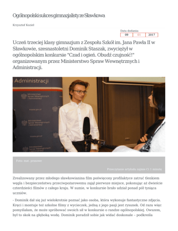 OgólnopolskisukcesgimnazjalistyzeSławkowa Krzysztof Kozieł Data dodania: 09 01 2017 Uczeń trzeciej klasy gimnazjum z Zespołu Szkół im. Jana Pawła II w Sławkowie, szesnastoletni Dominik Staszak, zwyciężył w ogólnopolskim konkursie "Czad i ogień. Obudź czujność!" organizowanym przez Ministerstwo Spraw Wewnętrznych i Administracji. Foto: mat. prasowe Przeczytanie artykułu zajmie Ci 1 minutę Zrealizowany przez młodego sławkowianina film poświęcony profilaktyce zatruć tlenkiem węgla i bezpieczeństwu przeciwpożarowemu zajął pierwsze miejsce, pokonując aż dwieście czterdzieści filmów z całego kraju. W sumie, w konkursie brało udział ponad pół tysiąca uczniów. - Dominik dał się już wielokrotnie poznać jako osoba, która wykonuje fantastyczne zdjęcia. Kręci i montuje też szkolne filmy z wycieczek, jedną z jego pasji jest rysunek. Od razu więc pomyślałam, że może spróbować swoich sił w konkursie o randze ogólnopolskiej. Owszem, był to skok na głęboką wodę. Dominik poradził sobie jak widać doskonale – podkreśla szkolny koordynator konkursu Jolanta Rosa, nauczyciel informatyki i techniki Zespołu Szkół w Sławkowie. Nakręcony przez Dominika Staszaka film utrzymany jest w klasycznej konwencji. Z mrocznym tłem muzycznym doskonale komponuje się niski głos lektora. W tej roli również wystąpił młody sławkowianin. Jak sam przyznaje, czas realizacji filmu był bardzo krótki. – Samo wymyślenie koncepcji zajęło około dwóch tygodni, a czas realizacji to trzy dni, a w zasadzie trzy noce. Nie ukrywam, że bardzo lubię robić tego typu produkcje. W przyszłości myślę o szkole filmowej – opowiada autor. Film obejrzeć można między innymi w serwisie społecznościowym YouTube. Będzie on również wykorzystywany przez ministerstwo do prowadzenia akcji profilaktycznych, uświadamiających zagrożenia związane z działaniem tlenku węgla i zagrożeniem pożarowym w gospodarstwie domowym. Nagrodą dla szkoły w konkursie był czek na 5 tys. zł. Zwycięzca, poza gratulacjami, z rąk ministra spraw wewnętrznych i administracji Mariusza Błaszczaka otrzymał również tablet. List gratulacyjny od szefa MSWiA otrzymała też Jolanta Rosa, szkolny koordynator konkursu. źródło: YouTube foto: materiały MSWiA (licencja CC BY-ND 2.0) foto: materiały MSWiA (licencja CC BY-ND 2.0) Tagi: Dominik Staszakczad i ogieńMSWiAZespół Szkół im. Jana Pawła II w Sławkowie D R U KUJ D RUKUJ DO PDF http://www.slawkow.pl/print.php?pdf=true&unique=gimnazjalista-zwyciezyl-w-konkursie-mswia