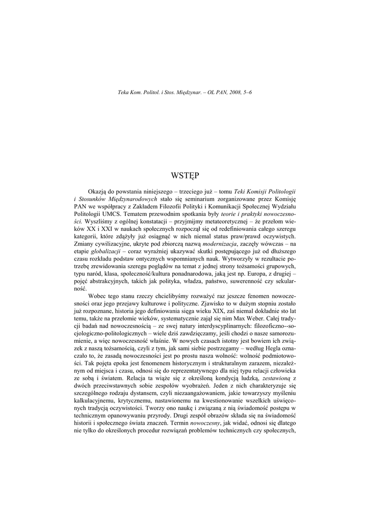 Teka Kom. Politol. i Stos. Międzynar. – OL PAN, 2008, 5–6 WSTĘP Okazją do powstania niniejszego – trzeciego juŜ – tomu Teki Komisji Politologii i Stosunków Międzynarodowych stało się seminarium zorganizowane przez Komisję PAN we współpracy z Zakładem Filozofii Polityki i Komunikacji Społecznej Wydziału Politologii UMCS. Tematem przewodnim spotkania były teorie i praktyki nowoczesności. Wyszliśmy z ogólnej konstatacji – przyjmijmy metateoretycznej – Ŝe przełom wieków XX i XXI w naukach społecznych rozpoczął się od redefiniowania całego szeregu kategorii, które zdąŜyły juŜ osiągnąć w nich niemal status praw/prawd oczywistych. Zmiany cywilizacyjne, ukryte pod zbiorczą nazwą modernizacja, zaczęły wówczas – na etapie globalizacji – coraz wyraźniej ukazywać skutki postępującego juŜ od dłuŜszego czasu rozkładu podstaw ontycznych wspomnianych nauk. Wytworzyły w rezultacie potrzebę zrewidowania szeregu poglądów na temat z jednej strony toŜsamości grupowych, typu naród, klasa, społeczność/kultura ponadnarodowa, jaką jest np. Europa, z drugiej – pojęć abstrakcyjnych, takich jak polityka, władza, państwo, suwerenność czy sekularność. Wobec tego stanu rzeczy chcielibyśmy rozwaŜyć raz jeszcze fenomen nowoczesności oraz jego przejawy kulturowe i polityczne. Zjawisko to w duŜym stopniu zostało juŜ rozpoznane, historia jego definiowania sięga wieku XIX, zaś niemal dokładnie sto lat temu, takŜe na przełomie wieków, systematycznie zajął się nim Max Weber. Całej tradycji badań nad nowoczesnością – ze swej natury interdyscyplinarnych: filozoficzno--socjologiczno-politologicznych – wiele dziś zawdzięczamy, jeśli chodzi o nasze samorozumienie, a więc nowoczesność właśnie. W nowych czasach istotny jest bowiem ich związek z naszą toŜsamością, czyli z tym, jak sami siebie postrzegamy – według Hegla oznaczało to, Ŝe zasadą nowoczesności jest po prostu nasza wolność: wolność podmiotowości. Tak pojęta epoka jest fenomenem historycznym i strukturalnym zarazem, niezaleŜnym od miejsca i czasu, odnosi się do reprezentatywnego dla niej typu relacji człowieka ze sobą i światem. Relacja ta wiąŜe się z określoną kondycją ludzką, zestawioną z dwóch przeciwstawnych sobie zespołów wyobraŜeń. Jeden z nich charakteryzuje się szczególnego rodzaju dystansem, czyli niezaangaŜowaniem, jakie towarzyszy myśleniu kalkulacyjnemu, krytycznemu, nastawionemu na kwestionowanie wszelkich uświęconych tradycją oczywistości. Tworzy ono naukę i związaną z nią świadomość postępu w technicznym opanowywaniu przyrody. Drugi zespół obrazów składa się na świadomość historii i społecznego świata znaczeń. Termin nowoczesny, jak widać, odnosi się dlatego nie tylko do określonych procedur rozwiązań problemów technicznych czy społecznych, 6 Jan P. Hudzik wykazujących się racjonalnością instrumentalną mierzoną w kategoriach ekonomiczności, wydajności i wewnętrznej spójności. Stosuje się on takŜe do świata wartości niewymiernych, w swej istocie uniwersalnych, bez których nie moŜna by mówić ani o prawach człowieka, ani o teoriach i praktykach demokratycznego samo-rządzenia. Elementy wchodzące w zakres pierwszego znaczenia pojęcia nowoczesny wymagają poznania, w zakres znaczenia drugiego – rozumienia. Nauka i historia, poznanie i rozumienie/interpretacja to dwie ścierające się ze sobą sfery naszego działania i myślenia, dwie instytucje imaginacyjne, które razem dopiero, w dialektycznym spięciu, zakreślają granice fenomenu nowoczesności. Uczestników seminarium prosiliśmy o wypowiedzi, które oddadzą tę złoŜoność pojęcia nowoczesność. Z góry zakładaliśmy więc, Ŝe będą one miały formę raczej szkiców i przyczynków niŜ studiów – kompletnych opracowań z tezą. RozwaŜania dotyczyły dwóch bloków tematycznych: 1. Nowoczesność jako Zachód – źródła i kluczowe teksty tego zagadnienia: czy jest to zjawisko (tylko) historyczne (a więc niepowtarzalne), czy (takŜe) strukturalne, czyli określane za pomocą pewnych ogólnych cech, które moŜna spotkać w kaŜdym społeczeństwie? czy moŜliwa jest więc jego realizacja/recepcja w społeczeństwach „nie-zachodnich”? jaka jest skala i przejawy wykluczenia z nowoczesności? jakie są tego następstwa? 2. Technika jako „język” nowoczesności – źródło jej dynamiki i samopoznania, organizator naszego codziennego doświadczenia (w szczególności technologie informacyjne) i twórca kształtów otaczającego nas świata: nowoczesność jako synonim naszej teraźniejszości; komunikacja i więzi międzyludzkie w mediasferze i hiperrzeczywistości; społeczeństwo sieciowe i nowe formy jego polityki. Zawarte w tym tomie artykuły nie podejmują wszystkich tych tematów. Oferują jedynie pewne ich konkretyzacje. Tak więc autorzy części pierwszej Filozofia i polityka nowoczesna zajmują się takimi kwestiami, jak istota nowoczesnej polityki i demokracji, wielość sposobów rozumienia tych pojęć, jak równieŜ fundujących je innych pojęć, takich jak np. racjonalność, natura ludzka czy wolność. W szczególności dociekają historycznych i koncepcyjnych zaleŜności między nowoczesnością, filozofią i polityką (Jan P. Hudzik), relacjonują projekty demokracji deliberacyjnej i sfery publicznej (Magdalena śardecka--Nowak, Edyta Barańska), rozwaŜają hipotezę nowoczesnych korzeni totalitaryzmu i holokaustu (Waldemar Bulira). W części drugiej Nowoczesność i religia pojawia się problem relacji wiara – wiedza w tzw. społeczeństwach postsekularnych, które mimo nieustannych postępów modernizacyjnych, nadal zachowują w swych teoriach i praktykach miejsce na religię (Adam Chmielewski, Witold Nowak). Część trzecią Społeczeństwo sieci stanowią wypowiedzi w sprawie politycznych i kulturowych skutków stosowania nowych technologii medialnyc