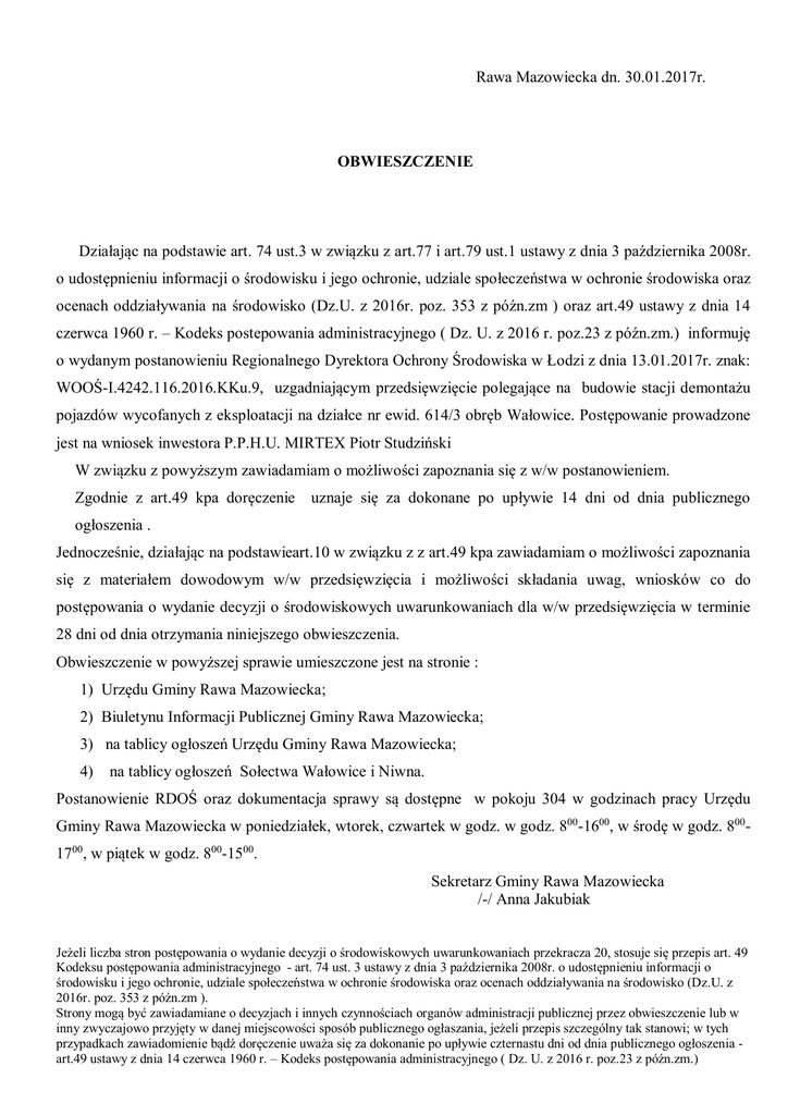 Rawa Mazowiecka dn. 30.01.2017r. OBWIESZCZENIE Działając na podstawie art. 74 ust.3 w związku z art.77 i art.79 ust.1 ustawy z dnia 3 października 2008r. o udostępnieniu informacji o środowisku i jego ochronie, udziale społeczeństwa w ochronie środowiska oraz ocenach oddziaływania na środowisko (Dz.U. z 2016r. poz. 353 z późn.zm ) oraz art.49 ustawy z dnia 14 czerwca 1960 r. – Kodeks postepowania administracyjnego ( Dz. U. z 2016 r. poz.23 z późn.zm.) informuję o wydanym postanowieniu Regionalnego Dyrektora Ochrony Środowiska w Łodzi z dnia 13.01.2017r. znak: WOOŚ-I.4242.116.2016.KKu.9, uzgadniającym przedsięwzięcie polegające na budowie stacji demontażu pojazdów wycofanych z eksploatacji na działce nr ewid. 614/3 obręb Wałowice. Postępowanie prowadzone jest na wniosek inwestora P.P.H.U. MIRTEX Piotr Studziński W związku z powyższym zawiadamiam o możliwości zapoznania się z w/w postanowieniem. Zgodnie z art.49 kpa doręczenie uznaje się za dokonane po upływie 14 dni od dnia publicznego ogłoszenia . Jednocześnie, działając na podstawieart.10 w związku z z art.49 kpa zawiadamiam o możliwości zapoznania się z materiałem dowodowym w/w przedsięwzięcia i możliwości składania uwag, wniosków co do postępowania o wydanie decyzji o środowiskowych uwarunkowaniach dla w/w przedsięwzięcia w terminie 28 dni od dnia otrzymania niniejszego obwieszczenia. Obwieszczenie w powyższej sprawie umieszczone jest na stronie : 1) Urzędu Gminy Rawa Mazowiecka; 2) Biuletynu Informacji Publicznej Gminy Rawa Mazowiecka; 3) na tablicy ogłoszeń Urzędu Gminy Rawa Mazowiecka; 4) na tablicy ogłoszeń Sołectwa Wałowice i Niwna. Postanowienie RDOŚ oraz dokumentacja sprawy są dostępne w pokoju 304 w godzinach pracy Urzędu Gminy Rawa Mazowiecka w poniedziałek, wtorek, czwartek w godz. w godz. 800-1600, w środę w godz. 8001700, w piątek w godz. 800-1500. Sekretarz Gminy Rawa Mazowiecka /-/ Anna Jakubiak Jeżeli liczba stron postępowania o wydanie decyzji o środowiskowych uwarunkowaniach przekracza 20, stosuje się przepis art. 49 Kodeksu postępowania administracyjnego - art. 74 ust. 3 ustawy z dnia 3 października 2008r. o udostępnieniu informacji o środowisku i jego ochronie, udziale społeczeństwa w ochronie środowiska oraz ocenach oddziaływania na środowisko (Dz.U. z 2016r. poz. 353 z późn.zm ). Strony mogą być zawiadamiane o decyzjach i innych czynnościach organów administracji publicznej przez obwieszczenie lub w inny zwyczajowo przyjęty w danej miejscowości sposób publicznego ogłaszania, jeżeli przepis szczególny tak stanowi; w tych przypadkach zawiadomienie bądź doręczenie uważa się za dokonanie po upływie czternastu dni od dnia publicznego ogłoszenia art.49 ustawy z dnia 14 czerwca 1960 r. – Kodeks postępowania administracyjnego ( Dz. U. z 2016 r. poz.23 z późn.zm.)