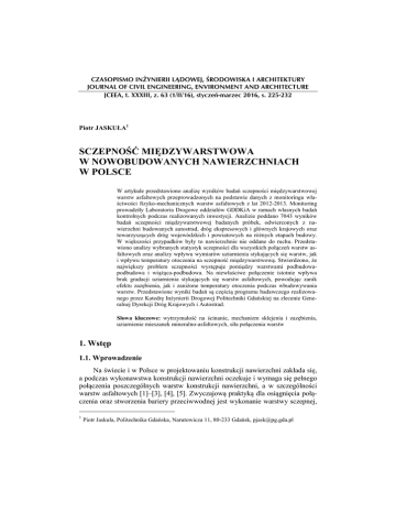 CZASOPISMO INŻYNIERII LĄDOWEJ, ŚRODOWISKA I ARCHITEKTURY JOURNAL OF CIVIL ENGINEERING, ENVIRONMENT AND ARCHITECTURE JCEEA, t. XXXIII, z. 63 (1/II/16), styczeń-marzec 2016, s. 225-232 Piotr JASKUŁA1 SCZEPNOŚĆ MIĘDZYWARSTWOWA W NOWOBUDOWANYCH NAWIERZCHNIACH W POLSCE W artykule przedstawiono analizę wyników badań sczepności międzywarstwowej warstw asfaltowych przeprowadzonych na podstawie danych z monitoringu właściwości fizyko-mechanicznych warstw asfaltowych z lat 2012-2013. Monitoring prowadziły Laboratoria Drogowe oddziałów GDDKiA w ramach własnych badań kontrolnych podczas realizowanych inwestycji. Analizie poddano 7043 wyników badań sczepności międzywarstwowej badanych próbek, odwierconych z nawierzchni budowanych autostrad, dróg ekspresowych i głównych krajowych oraz towarzyszących dróg wojewódzkich i powiatowych na różnych etapach budowy. W większości przypadków były to nawierzchnie nie oddane do ruchu. Przedstawiono analizy wybranych statystyk sczepności dla wszystkich połączeń warstw asfaltowych oraz analizy wpływu wymiarów uziarnienia stykających się warstw, jak i wpływu temperatury otoczenia na sczepność międzywarstwową. Stwierdzono, że największy problem sczepności występuje pomiędzy warstwami podbudowapodbudowa i wiążąca-podbudowa. Na niewłaściwe połączenie istotnie wpływa brak gradacji uziarnienia stykających się warstw asfaltowych, powodując zanik efektu zazębienia, jak i zaniżone temperatury otoczenia podczas wbudowywania warstw. Przedstawione wyniki badań są częścią programu badawczego realizowanego przez Katedrę Inżynierii Drogowej Politechniki Gdańskiej na zlecenie Generalnej Dyrekcji Dróg Krajowych i Autostrad. Słowa kluczowe: wytrzymałość na ścinanie, mechanizm sklejenia i zazębienia, uziarnienie mieszanek mineralno-asfaltowych, siła połączenia warstw 1. Wstęp 1.1. Wprowadzenie Na świecie i w Polsce w projektowaniu konstrukcji nawierzchni zakłada się, a podczas wykonawstwa konstrukcji nawierzchni oczekuje i wymaga się pełnego połączenia poszczególnych warstw konstrukcji nawierzchni, a w szczególności warstw asfaltowych [1]–[3], [4], [5]. Zwyczajową praktyką dla osiągnięcia połączenia oraz stworzenia bariery przeciwwodnej jest wykonanie warstwy sczepnej, 1 Piotr Jaskuła, Politechnika Gdańska, Narutowicza 11, 80-233 Gdańsk, [email protected] 226 P. Jaskuła skropienia międzywarstwowego z emulsji asfaltowej pomiędzy kolejnymi warstwami konstrukcji nawierzchni. Polskie specyfikacje techniczne od początku ich istnienia podają ilościowe zakresy skropienia w zależności od rodzaju stykających się warstw. Zalecane wartości skropienia wynikają z doświadczenia, obserwacji dobrego zachowania się nawierzchni, a nie są wynikiem analiz mechanicznych właściwości sczepności międzywarstwowej. W okresie ostatnich 10 lat istotnie zmieniły się przepisy techniczne, dotyczące projektowania i produkcji mieszanek mineralno-asfaltowych oraz materiałów stosowanych w technologiach asfaltowych. Pojawiły się problemy z uzyskaniem sczepności międzywarstwowej pomiędzy poszczególnymi warstwami asfaltowymi, a w specyfikacjach technicznych, jak i projektach wykonawczych poza ilością skropienia brakuje wyraźnych wskazówek do zmaksymalizowania wytrzymałości na ścinanie połączenia. 1.2. Badania sczepności międzywarstwowej warstw asfaltowych Analizę wyników badań sczepności międzywarstwowej warstw asfaltowych przeprowadzono na podstawie danych z monitoringu właściwości fizykomechanicznych warstw asfaltowych prowadzonego w latach 2012-2013 przez Laboratoria Drogowe oddziałów GDDKiA w ramach własnych badań kontrolnych podczas prowadzonych inwestycji [6]. Analizie poddano 7043 wyników badań sczepności międzywarstwowej badanych na próbek o średnicy 100 i 150 mm, odwierconych z nawierzchni budowanych autostrad, dróg ekspresowych i głównych krajowych oraz towarzyszących dróg wojewódzkich i powiatowych na różnych etapach budowy. Próbki do badań sczepności międzywarstwowej pochodziły z 74 odcinków nowobudowanych lub remontowanych dróg. W przypadku 512 prób z 7043 wyników badania sczepności dysponowano jednocześnie wynikami oznaczenia właściwości fizycznych badanych mieszanek mineralnoasfaltowych tj. wielkości uziarnienia, zawartości asfaltu, zawartości wolnych przestrzeni oraz wskaźnika zagęszczenia. Wybrane dane wykorzystano w analizach poszukiwania korelacji pomiędzy sczepnością międzywarstwową i parametrami fizycznymi stykających się warstw z mieszanek mineralno-asfaltowych. Badania sczepności międzywarstwowej wykonywano w temperaturze +20°C, przy wykorzystaniu prasy Marshalla i aparatu Leutnera. Prędkość przemieszczania się tłoka prasy podczas ścinania wynosiła 50 mm/min. 2. Analiza wyników badań sczepności międzywarstwowej 2.1. Zestawienie ogólne Zestawienie wszystkich wyników badań sczepności międzywarstwowej z podziałem na poszczególne połączenia warstw przedstawiono w tablicy 1. Zestawienie wyników monitoringu sczepności międzywarstwowej pokazuje, że mimo problemów z połączeniem międzywarstwowym podczas realizacji inwestycji można osiągnąć satysfakcjonujące wyniki, co widać po dużych śred- Sczepność międzywarstwowa w nowobudowanych nawierzchniach w Polsce 227 Tablica 1. Zestawienie wyników badań sczepności międzywarstwowej wykonanych metodą Leutnera, w temperaturze +20°C Table 1. Summary of the interlayer bonding results from the Leutner test, carried out at +20°C Lp. 1. 2. 3. 4. 5. 6. 7. 8. 9. Parametr statystyczny Liczba próbek Średnia wytrzymałość na ścinanie [MPa] Odchylenie standardowe [MPa] Wskaźnik zmienności Mediana [MPa] Wartość min. >0 [MPa] Wartość max. [MPa] Liczba próbek; stwierdzono brak sczepności (rozpad warstw podczas odwiertu) Liczba próbek; stwierdzono wartości mniejsze od kryterium tymczasowego Wyniki połączeń międzywarst