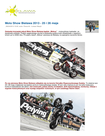 Moto Show Bielawa 2013 - 25 i 26 maja , 08/04/2013 10:03, autor: Rzecznik - Łukasz Masyk Gwiazdą trzynastej edycji Moto Show Bielawa będzie „Mokus” - motocyklowy kaskader, ze światowej czołówki. Popisy węgierskiego stunter'a bielawska publiczność oklaskiwała z zapartym tchem już w 2008 roku. Po pięciu latach „Mokus” powraca do Bielawy na specjalne życzenie fanów. Po raz pierwszy Moto Show Bielawa odbędzie się na terenie Ośrodka Wypoczynkowego Sudety. To właśnie tam 25 i 26 maja znajdować się będzie centrum motocyklowego święta. W tym roku impreza to już nie tylko tradycyjny konkurs kaskaderów ale także: zlot motocykli, pokaz stuntu na kładach, drift samochodowy, konkursy, relacje z wypraw motocyklowych oraz występ zespołów rockowych, w tym czeskiego Ramm Stain. Dla najlepszych stunterów czekają cenne nagrody. W klasie regulaminowej będzie to: 5000 zł – pierwsze miejsce, 2000 zł – drugie miejsce, 1000 zł – trzecie miejsce. Klasa nieregulaminowa (skutery oraz motocykle do pojemności 125 ccm): 1000 zł – pierwsze miejsce. Dla uczestników zlotu organizatorzy udostępniają miejsca na polu namiotowym. Wstęp na Moto Show Bielawa dla publiczności kosztować będzie 10 zł/1 dzień. Więcej o imprezie na stronie www.motoshowbielawa.pl. © 2010 Gmina Bielawa. Wszelkie prawa zastrzeżone. All rights reserved. Projekt: XOOOM