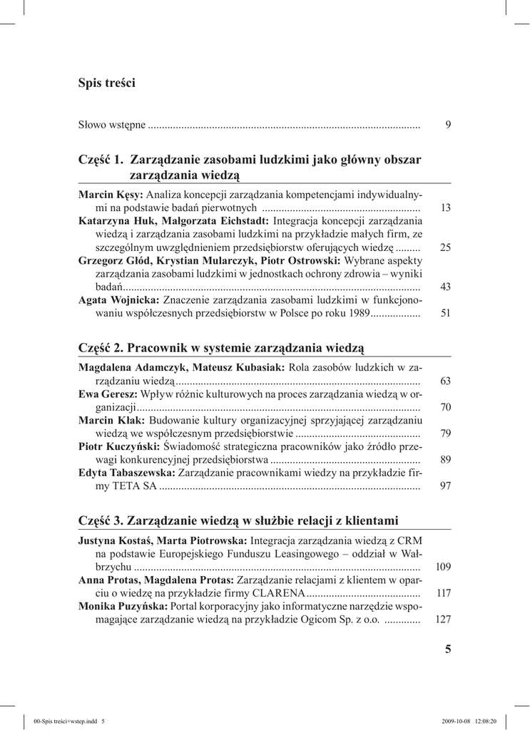 Spis treści Słowo wstępne................................................................................................... 9 Część 1. Zarządzanie zasobami ludzkimi jako główny obszar zarządzania wiedzą Marcin Kęsy: Analiza koncepcji zarządzania kompetencjami indywidualnymi na podstawie badań pierwotnych .......................................................... Katarzyna Huk, Małgorzata Eichstadt: Integracja koncepcji zarządzania wiedzą i zarządzania zasobami ludzkimi na przykładzie małych firm, ze szczególnym uwzględnieniem przedsiębiorstw oferujących wiedzę.......... Grzegorz Głód, Krystian Mularczyk, Piotr Ostrowski: Wybrane aspekty zarządzania zasobami ludzkimi w jednostkach ochrony zdrowia – wyniki badań............................................................................................................ Agata Wojnicka: Znaczenie zarządzania zasobami ludzkimi w funkcjonowaniu współczesnych przedsiębiorstw w Polsce po roku 1989................... 13 25 43 51 Część 2. Pracownik w systemie zarządzania wiedzą Magdalena Adamczyk, Mateusz Kubasiak: Rola zasobów ludzkich w zarządzaniu wiedzą......................................................................................... Ewa Geresz: Wpływ różnic kulturowych na proces zarządzania wiedzą w organizacji....................................................................................................... Marcin Kłak: Budowanie kultury organizacyjnej sprzyjającej zarządzaniu wiedzą we współczesnym przedsiębiorstwie.............................................. Piotr Kuczyński: Świadomość strategiczna pracowników jako źródło przewagi konkurencyjnej przedsiębiorstwa....................................................... Edyta Tabaszewska: Zarządzanie pracownikami wiedzy na przykładzie firmy TETA SA............................................................................................... 63 70 79 89 97 Część 3. Zarządzanie wiedzą w służbie relacji z klientami Justyna Kostaś, Marta Piotrowska: Integracja zarządzania wiedzą z CRM na podstawie Europejskiego Funduszu Leasingowego – oddział w Wałbrzychu........................................................................................................ 109 Anna Protas, Magdalena Protas: Zarządzanie relacjami z klientem w oparciu o wiedzę na przykładzie firmy CLARENA.......................................... 117 Monika Puzyńska: Portal korporacyjny jako informatyczne narzędzie wspomagające zarządzanie wiedzą na przykładzie Ogicom Sp. z o.o. .............. 127 5 00‑Spis treści+wstep.indd 5 2009‑10‑08 12:08:20 Magdalena Wróbel, Natalia Busse: Wiedza o wymaganiach klienta jako czynnik kształtowania jakości usług taksówkarskich w Łodzi.................. 135 Część 4. Znaczenie wiedzy w logistyce Tomasz Janeczko, Wojciech Musiał: Zarządzanie wiedzą w systemie magazynowym przedsiębiorstwa produkcyjnego................................................ Marta Partyka, Krzysztof Nadolny: Benchmarking w procesie przygotowania produkcji nowego wyrobu................................................................. Daniel Wilczyński, Krzysztof Nadolny: Koncepcja modernizacji procesów logistycznych z wykorzystaniem zarządzania wiedzą na przykładzie przedsiębiorstwa usługowo‑produkcyjnego................................................ Tomasz Wyszyński: Zarządzanie wiedzą jako element zarządzania łańcuchem dostaw: przypadek Metro Group ...................................................... 157 165 173 181 Część 5. Kształtowanie organizacji zorientowanej na wiedzę Marek Krasiński: Czy Hoshin Kanri ma szansę stać się w Polsce popularnym modelem strategicznego zarządzania jakością?.................................. Janusz Marek Lichtarski: Struktura organizacyjna jako element integrujący współczesne koncepcje i metody zarządzania............................................ Paweł Paluchowski: Strategiczne zarządzanie wiedzą w przedsiębiorstwie opartym na wiedzy na przykładzie firmy Korbank Sp. z o.o. ................... Zbigniew Piepiora: Zarządzanie wiedzą o zagrożeniach – studium przypadku Miejskiego Zespołu Zarządzania Kryzysowego w Kowarach.............. Maciej Skrobisz: Sieciocentryczne pole walki a zarządzanie projektami . .... Agnieszka Szczygielska, Bartosz Jasiński: Nadzór korporacyjny nad kapitałem intelektualnym przedsiębiorstwa . .................................................... 191 199 208 216 224 230 Summaries Part 1. Human resources management as the main area of knowledge management Marcin Kęsy: Analysis of management conception of individual competences on the base of original studies.......................................................... Katarzyna Huk, Małgorzata Eichstadt: Integration �������������������������������� of knowledge management and human resources management conception in small enterprises, with particular attention paid to knowledge oriented enterprises .............. Grzegorz Głód, Krystian Mularczyk, Piotr Ostrowski: Chosen aspects of human resources management in the health protection units – the results of the researches.......................................................................................... 24 36 50 6 00‑Spis treści+wstep.indd 6 2009‑10‑08 12:08:20 Agata Wojnicka: Human resources management significance in functioning of modern companies in Poland after 1989 year......................................... 60 Part 2. An employee in the system knowledge management Magdalena Adamczyk, Mateusz Kubasiak: The role of human resources in knowledge management.............................................................................. 69 Ewa Geresz: Influence the cultural differences on the processes of knowledge management in an organization................................................................... 78 Marcin K