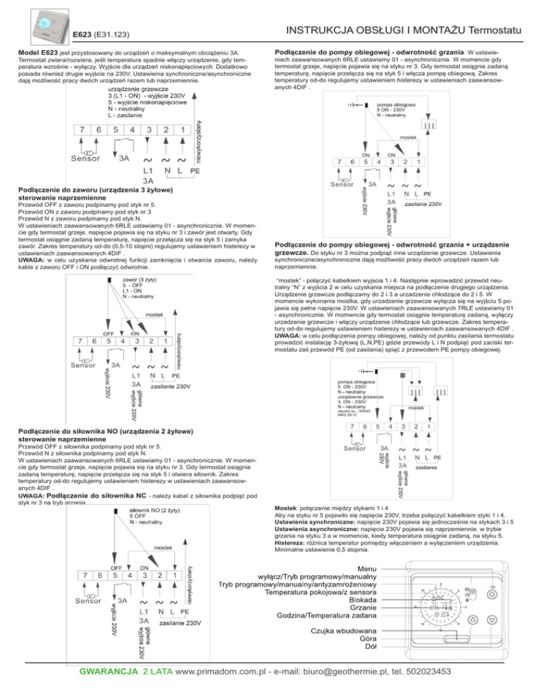E623 (E31.123) Model E623 jest przystosowany do urządzeń o maksymalnym obciążeniu 3A. Termostat zwiera/rozwiera, jeśli temperatura spadnie włączy urządzenie, gdy temperatura wzrośnie - wyłączy. Wyjście dla urządzeń niskonapięciowych. Dodatkowo posiada również drugie wyjście na 230V. Ustawienia synchroniczne/asynchroniczne dają możliwość pracy dwóch urządzeń razem lub naprzemiennie. INSTRUKCJA OBSŁUGI I MONTAŻU Termostatu Podłączenie do pompy obiegowej - odwrotność grzania W ustawieniach zaawansowanych 6RLE ustawiamy 01 - asynchronicznie. W momencie gdy termostat grzeje, napięcie pojawia się na styku nr 3. Gdy termostat osiągnie zadaną temperaturę, napięcie przełącza się na styk 5 i włącza pompę obiegową. Zakres temperatury od-do regulujemy ustawieniem histerezy w ustawieniach zaawansowanych 4DIF . Podłączenie do zaworu (urządzenia 3 żyłowe) sterowanie naprzemienne Przewód OFF z zaworu podpinamy pod styk nr 5. Przewód ON z zaworu podpinamy pod styk nr 3 Przewód N z zaworu podpinamy pod styk N. W ustawieniach zaawansowanych 6RLE ustawiamy 01 - asynchronicznie. W momencie gdy termostat grzeje, napięcie pojawia się na styku nr 3 i zawór jest otwarty. Gdy termostat osiągnie zadaną temperaturę, napięcie przełącza się na styk 5 i zamyka zawór. Zakres temperatury od-do (0,5-10 stopni) regulujemy ustawieniem histerezy w ustawieniach zaawansowanych 4DIF . UWAGA: w celu uzyskania odwrotnej funkcji zamknięcia i otwarcia zaworu, należy kable z zaworu OFF i ON podłączyć odwrotnie. Podłączenie do pompy obiegowej - odwrotność grzania + urządzenie grzewcze. Do styku nr 3 można podpiąć inne urządzenie grzewcze. Ustawienia synchroniczne/asynchroniczne dają możliwość pracy dwóch urządzeń razem lub naprzemiennie. “mostek” - połączyć kabelkiem wyjscia 1 i 4. Następnie wprowadzić przewód neutralny “N” z wyjścia 2 w celu uzyskania miejsca na podłączenie drugiego urządzenia. Urządzenie grzewcze podłączamy do 2 i 3 a urzadzenie chłodzące do 2 i 5. W momencie wykonania mostka, gdy urzadzenie grzewcze wyłącza się na wyjściu 5 pojawia się pełne napięcie 230V. W ustawieniach zaawansowanych 7RLE ustawiamy 01 - asynchronicznie. W momwncie gdy termostat osiągnie temperaturę zadaną, wyłączy urzadzenie grzewcze i włączy urządzenie chłodzące lub grzewcze. Zakres temperatury od-do regulujemy ustawieniem histerezy w ustawieniach zaawansowanych 4DIF . UWAGA: w celu podłączenia pompy obiegowej, należy od punktu zasilania termostatu prowadzić instalację 3-żyłową (L,N,PE) gdzie przewody L i N podpiąć pod zaciski termostatu zaś przewód PE (od zasilania) spiąć z przewodem PE pompy obiegowej. Podłączenie do siłownika NO (urządzenia 2 żyłowe) sterowanie naprzemienne Przewód OFF z siłownika podpinamy pod styk nr 5. Przewód N z siłownika podpinamy pod styk N. W ustawieniach zaawansowanych 6RLE ustawiamy 01 - asynchronicznie. W momencie gdy termostat grzeje, napięcie pojawia się na styku nr 3. Gdy termostat osiągnie zadaną temperaturę, napięcie przełącza się na styk 5 i otwiera siłownik. Zakres temperatury od-do regulujemy ustawieniem histerezy w ustawieniach zaawansowanych 4DIF . UWAGA: Podłączenie do siłownika NC - należy kabel z siłownika podpiąć pod styk nr 3 na tryb grzania. Mostek: połączenie między stykami 1 i 4 Aby na styku nr 5 pojawiło się napięcie 230V, trzeba połączyć kabelkiem styki 1 i 4. Ustawienia synchroniczne: napięcie 230V pojawia się jednocześnie na stykach 3 i 5 Ustawienia asynchroniczne: napięcie 230V pojawia się naprzemiennie. w trybie grzania na styku 3 a w momencie, kiedy temperatura osiągnie zadaną, na styku 5. Histereza: różnica temperatur pomiędzy włączeniem a wyłączeniem urządzenia. Minimalne ustawienie 0,5 stopnia. GWARANCJA 2 LATA www.primadom.com.pl - e-mail: [email protected], tel. 502023453 INSTRUKCJA OBSŁUGI I MONTAŻU Termostatu E623 (E62.123) Codzienne używanie termostatu 1. Tryby: manualny ustawiamy temperaturę komfortową zegarowy programujemy termostat na 2 temperatury: komfortowa i ekonom- iczna. Zegar podzielony jest na 24 godziny. Każdą godzinę można dostosować indywidualnie do jednej z dwóch zaprogramowanych temperatur. komfortowy będąc w trybie zegarowym w każej chwili można zmienić temperaturę zadaną. Termostat powróci do temperatury zaprogramowanej przy następnej pełnej godzinie. 2. Przełącznik Przełącz klawiszem na zegar lub rączkę aby wybrać tryb programowy lub manualny 3. plus “▲” i “▼” minus Sterownik jest wyposażonym w intuicyjne menu obrazkowe oraz przełącznik OFF/ tryb zegar/tryb manualny. Przełącznik można ustawić na * Off termostat wyłączony, aktywna funkcja antyszronowa * rączka (tryb manualny): ustawiamy temperaturę komfortową (w każdej chwili można zmienić zadaną temperaturę komfortową ) * zegar (programowanie) : ustawiamy temperaturę ekonomiczną i komfortową (w każdej chwili można zmienić zadaną temperaturę przyciskami ▲▼ i wejść w tryb komfortowy. Termostat powróci przy kolejnej godzinie do zadanej temperatury zaprogramowanej.) “Err” na ekranie. Brak podpiętego czujnika zewnętrznego. Należy podpiąć czujnik zewnętrzny lub wybrać w ustawieniach zaawansowanych: 2. SEN - Tryb sensora - IN: wbudowany czujnik Naciśnij przycisk “▲” lub “▼”, aby zwiększyć lub zmniejszyć wartość zadaną. 4. off Przełącznik włączona. wyłącza termostat. Uaktywnia funkcję antyszronową, gdy jest 5. Programowanie Włącz termostat przełącznikiem na tryb programowy. Przyciśnij i przytrzymaj do 5 sekund przycisk MENU. Na ekranie pojawi się 00. Następne przyciskami ▲▼ ustaw program. Przycisk ▼ ustawi godziny na ustawioną ekonomiczną temperaturę. Przycisk ▲ ustawi godziny grzania na temperaturę komfortową. Następnie przyciśnij ponownie przycisk MENU, pojawi się PH - ustawienie temperatury komfortow