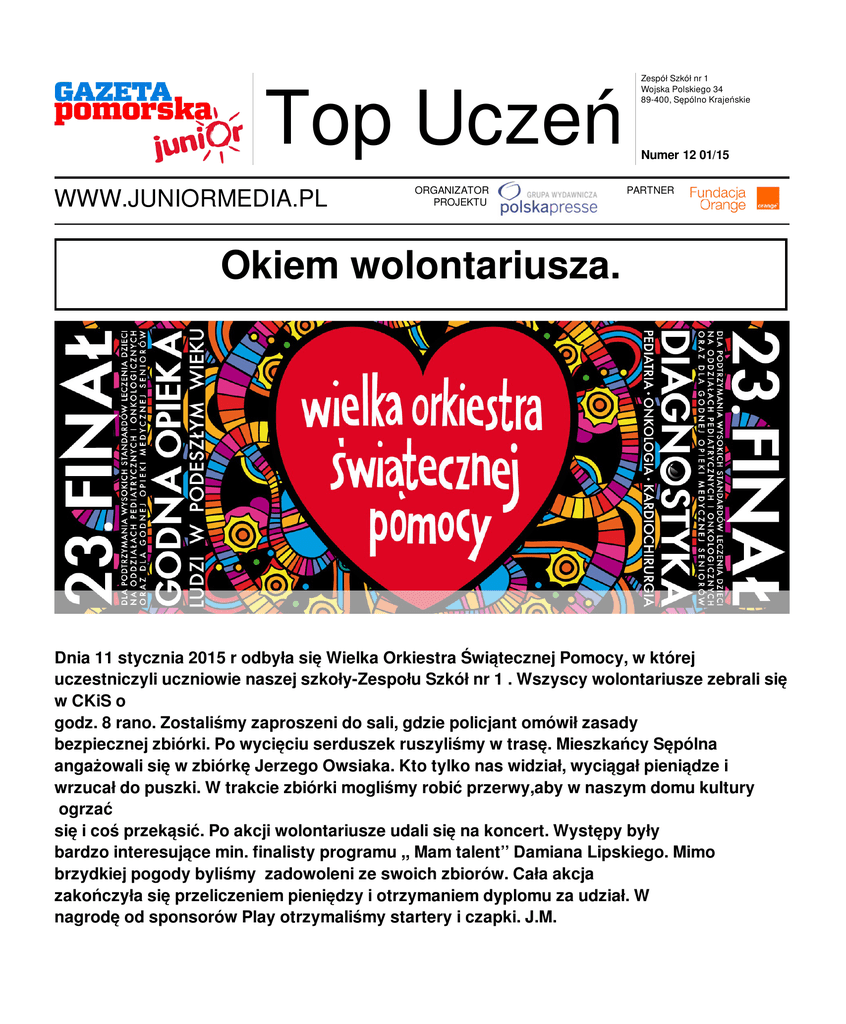 Top Uczeń WWW.JUNIORMEDIA.PL ORGANIZATOR PROJEKTU Zespół Szkół nr 1 Wojska Polskiego 34 89-400, Sępólno Krajeńskie Numer 12 01/15 PARTNER Okiem wolontariusza. Dnia 11 stycznia 2015 r odbyła się Wielka Orkiestra Świątecznej Pomocy, w której uczestniczyli uczniowie naszej szkoły-Zespołu Szkół nr 1 . Wszyscy wolontariusze zebrali się w CKiS o godz. 8 rano. Zostaliśmy zaproszeni do sali, gdzie policjant omówił zasady bezpiecznej zbiórki. Po wycięciu serduszek ruszyliśmy w trasę. Mieszkańcy Sępólna angażowali się w zbiórkę Jerzego Owsiaka. Kto tylko nas widział, wyciągał pieniądze i wrzucał do puszki. W trakcie zbiórki mogliśmy robić przerwy,aby w naszym domu kultury ogrzać się i coś przekąsić. Po akcji wolontariusze udali się na koncert. Występy były bardzo interesujące min. finalisty programu ,, Mam talent’’ Damiana Lipskiego. Mimo brzydkiej pogody byliśmy zadowoleni ze swoich zbiorów. Cała akcja zakończyła się przeliczeniem pieniędzy i otrzymaniem dyplomu za udział. W nagrodę od sponsorów Play otrzymaliśmy startery i czapki. J.M. Gazeta Pomorska | Numer 12 01/2015 | Strona 2 Top Uczeń www.pomorska.pl WWW.JUNIORMEDIA.PL Cztery kroki do postanowień. Postanowienia. Niedawno obchodziliśmy Święta Bożego Narodzenia, Sylwestra oraz Nowy Rok. Z tego powodu nadszedł czas na postanowienia na nowy 2015 rok. Niektórzy zakładają sobie, że rzucą palenie, zaczną się odchudzać itd. Jednak bardzo często po paru dniach lub tygodniach odrzucają je i stwierdzają, że nałogi są od nich silniejsze. I właśnie dlatego około 92% postanowień noworocznych jest niezrealizowanych, rzucanych na wiatr. Jednak zawsze warto spróbować. Wiadomo boimy się, że nam się nie uda. Dlatego pragnę Wam przedstawić sposoby na postanowienia noworoczne. Ale na samym początku zapamiętajcie, że nie wszystko na raz, wybierzcie takie, które coś może w waszym życiu zmienić i jesteście na tą zmianę gotowi. A oto krótki sposób na postanowienia: 1. Poczekaj z postanowieniem parę dni. Zastanów się czy jesteś gotowy, aby zacząć je realizować. Nie wybieraj postanowienia, na które nie będziesz mieć czasu, dobrze je przemyśl. Bo co będzie, gdy po tygodniu się poddasz, gdyż już nie będziesz mieć motywacji? Tylko niepotrzebne rozczarowanie. Dlatego 7 dni pozwoli ci się nad nim zastanowić. Poświęć trochę czasu, aby nad nim poważnie pomyśleć. 2. Zaplanuj wyzwanie na sam początek na 7 dni bądź 14. Niestety, łatwiej jest coś zmienić na parę dni niż na zawsze. Gdy będziesz wiedzieć, że to jest na krótki czas, łatwiej będzie ci je wykonać. Gdy już ten okres minie, wykonuj te postanowienie na dłuższy okres np. 30 dni itd. Jak uda ci się wykonać postanowienie parodniowe, to już będzie to twój mały sukces. 3. Dobrze się do tego przygotuj. Jeśli chcesz np. zacząć się lepiej uczyć, to warto poznać parę sposobów na koncentrację i dobrą pamięć. Warto też sobie kupić owoce, ale przede wszystkim zrezygnuj z oglądania programów telewizyjnych bądź grania w gry. Poświęć więcej czasu na naukę. Jeśli chcesz schudnąć, zacznij ćwiczyć, chodzić na siłownię, biegać, stosować diety, ale bez głodzenia się. Poszerz bardziej swoją wiedzę na temat swojego postanowienia. Dzięki temu bardziej przybliżysz się do swojego celu. 4. I chyba najważniejsze. Pozwól sobie na małą porażkę, potknięcie. Lecz po tym podnieś się z większą energią, nie poddawaj się do końca, po prostu walcz. Monika Metzmacher Każdemu zdarzają się porażki, nie przejmuj się tym. Lecz nie każdy w stanie jest podjąć decyzję o spróbowaniu jeszcze raz, ale Ty bądź odważniejszy i ją podejmij. Nie wmawiaj sobie, że postanowienia są do bani, złe, bo to nie prawda. Właśnie w tym okresie, w nowym roku możesz zawalczyć o swoje lepsze życie, taka okazja trafia się raz na rok, ale trzeba nad nią bardzo dużo pracować, potrzeba do tego więcej czasu, a osiągniesz swój cel. Mam nadzieję, że ten sposób, chociaż w najmniejszym stopniu Wam pomoże zrealizować swoje postanowienie noworoczne :) Powodzenia!! Niech twoje postanowienia nie będą jak te bengalskie ognie, które świecą przez chwilę, aby zostawić później niczym gorzką rzeczywistość, czarny i nieużyteczny niedopałek, który się wyrzuca z pogardą. (św. J. Escriva) //KK www.pomorska.pl WWW.JUNIORMEDIA.PL Gazeta Pomorska | Numer 12 01/2015 | Strona 3 Top Uczeń Ostatnia wizyta w świecie Tolkiena, czyli Hobbit: Bitwa Pięciu Armii Recenzja. Po wyjściu z kina miałem mieszane uczucia, z jednej strony wizualnie ''Hobbit'' wywarł na mnie wrażenie, a z drugiej nieco się zawiodłem . Emocje ,jakie towarzyszyły nam przy wielkim finale trylogii, były dalekie od tych, których się spodziewałem. Już 2 lata temu, kiedy do kin trafiła pierwsza część ekranizacji, przeczuwałem, że dzielenie jednej 300stronicowej książki na 3 filmy nie jest najlepszym pomysłem. Jackson na siłę wprowadził postaci, które w literackim pierwowzorze nie występują , a oprócz tego, jak już wcześniej wspominałem, rozciągnął opowieść na 3 monotonnie długie filmy, nie potrzebnie przedłużając sceny walk. Gdzieś przeczytałem trafną uwagę, że Jackson zmienił się, jak Thorin – z oddanego sprawie przywódcy w oślepionego złotem szaleńca. Nie widzę tej samej niezwykłości w ''Hobbicie'', jaką widziałem w ''Władcy Pierścieni''. Widzę za to potrzebę szybkiego zarobku i jak widać to im się udało. Cała trylogia zarobiła w sumie 2.738.000.000$. Mimo to uważam, że film jest wart obejrzenia. Gra aktorska doskonała, a oprawa wizualna i efekty specjalne...fantastyczne! Oprócz tego muszę wspomnieć, że muzyka i udźwiękowienie, podobnie jak w poprzednich częściach stoją na najwyższym poziomie, co bardzo mnie ucieszyło, bo była to jedna z nielicznych rzeczy, które udały się perfekcyjnie. Mam nadzieję