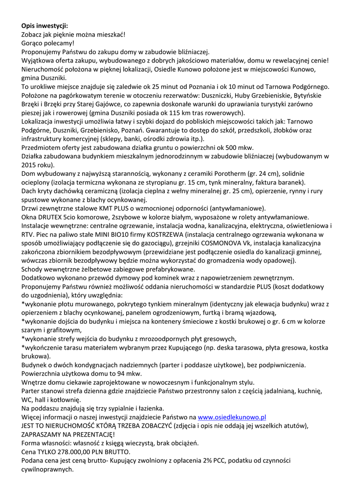 Opis inwestycji: Zobacz jak pięknie można mieszkać! Gorąco polecamy! Proponujemy Państwu do zakupu domy w zabudowie bliźniaczej. Wyjątkowa oferta zakupu, wybudowanego z dobrych jakościowo materiałów, domu w rewelacyjnej cenie! Nieruchomość położona w pięknej lokalizacji, Osiedle Kunowo położone jest w miejscowości Kunowo, gmina Duszniki. To urokliwe miejsce znajduje się zaledwie ok 25 minut od Poznania i ok 10 minut od Tarnowa Podgórnego. Położone na pagórkowatym terenie w otoczeniu rezerwatów: Duszniczki, Huby Grzebieniskie, Bytyńskie Brzęki i Brzęki przy Starej Gajówce, co zapewnia doskonałe warunki do uprawiania turystyki zarówno pieszej jak i rowerowej (gmina Duszniki posiada ok 115 km tras rowerowych). Lokalizacja inwestycji umożliwia łatwy i szybki dojazd do pobliskich miejscowości takich jak: Tarnowo Podgórne, Duszniki, Grzebienisko, Poznań. Gwarantuje to dostęp do szkół, przedszkoli, żłobków oraz infrastruktury komercyjnej (sklepy, banki, ośrodki zdrowia itp.). Przedmiotem oferty jest zabudowana działka gruntu o powierzchni ok 500 mkw. Działka zabudowana budynkiem mieszkalnym jednorodzinnym w zabudowie bliźniaczej (wybudowanym w 2015 roku). Dom wybudowany z najwyższą starannością, wykonany z ceramiki Porotherm (gr. 24 cm), solidnie ocieplony (izolacja termiczna wykonana ze styropianu gr. 15 cm, tynk mineralny, faktura baranek). Dach kryty dachówką ceramiczną (izolacja cieplna z wełny mineralnej gr. 25 cm), opierzenie, rynny i rury spustowe wykonane z blachy ocynkowanej. Drzwi zewnętrzne stalowe KMT PLUS o wzmocnionej odporności (antywłamaniowe). Okna DRUTEX 5cio komorowe, 2szybowe w kolorze białym, wyposażone w rolety antywłamaniowe. Instalacje wewnętrzne: centralne ogrzewanie, instalacja wodna, kanalizacyjna, elektryczna, oświetleniowa i RTV. Piec na paliwo stałe MINI BIO10 firmy KOSTRZEWA (instalacja centralnego ogrzewania wykonana w sposób umożliwiający podłączenie się do gazociągu), grzejniki COSMONOVA Vk, instalacja kanalizacyjna zakończona zbiornikiem bezodpływowym (przewidziane jest podłączenie osiedla do kanalizacji gminnej, wówczas zbiornik bezodpływowy będzie można wykorzystać do gromadzenia wody opadowej). Schody wewnętrzne żelbetowe zabiegowe prefabrykowane. Dodatkowo wykonano przewód dymowy pod kominek wraz z napowietrzeniem zewnętrznym. Proponujemy Państwu również możliwość oddania nieruchomości w standardzie PLUS (koszt dodatkowy do uzgodnienia), który uwzględnia: *wykonanie płotu murowanego, pokrytego tynkiem mineralnym (identyczny jak elewacja budynku) wraz z opierzeniem z blachy ocynkowanej, panelem ogrodzeniowym, furtką i bramą wjazdową, *wykonanie dojścia do budynku i miejsca na kontenery śmieciowe z kostki brukowej o gr. 6 cm w kolorze szarym i grafitowym, *wykonanie strefy wejścia do budynku z mrozoodpornych płyt gresowych, *wykończenie tarasu materiałem wybranym przez Kupującego (np. deska tarasowa, płyta gresowa, kostka brukowa). Budynek o dwóch kondygnacjach nadziemnych (parter i poddasze użytkowe), bez podpiwniczenia. Powierzchnia użytkowa domu to 94 mkw. Wnętrze domu ciekawie zaprojektowane w nowoczesnym i funkcjonalnym stylu. Parter stanowi strefa dzienna gdzie znajdziecie Państwo przestronny salon z częścią jadalnianą, kuchnię, WC, hall i kotłownię. Na poddaszu znajdują się trzy sypialnie i łazienka. Więcej informacji o naszej inwestycji znajdziecie Państwo na www.osiedlekunowo.pl JEST TO NIERUCHOMOŚĆ KTÓRĄ TRZEBA ZOBACZYĆ (zdjęcia i opis nie oddają jej wszelkich atutów), ZAPRASZAMY NA PREZENTACJĘ! Forma własności: własność z księgą wieczystą, brak obciążeń. Cena TYLKO 278.000,00 PLN BRUTTO. Podana cena jest ceną brutto- Kupujący zwolniony z opłacenia 2% PCC, podatku od czynności cywilnoprawnych. Inwestor: Everest Select Properties *jesteśmy z Państwem już przeszło 20 lat. *jesteśmy przekonani, że hasło "Zobacz jak pięknie można mieszkać" właściwie określa naszą inwestycję. Biuro sprzedaży: ulica Chwiałkowskiego 7/1, 61-543 Poznań Serdecznie zapraszamy na prezentację i do zakupu! Prezentacja i kontakt: Grzegorz Gardyjas telefon: 606 239 052, Z poważaniem/Best Regards Grzegorz Gardyjas Everest Select Properties telefon 606-239-052