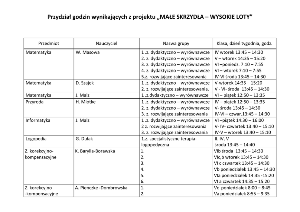 Przydział godzin wynikających z projektu „Małe skrzydła, wysokie loty”