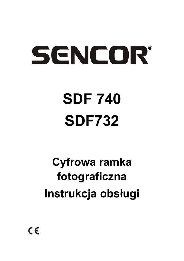 SDF 740 SDF732 Cyfrowa ramka fotograficzna Instrukcja obsługi Dziękujemy za zakupienie cyfrowej ramki fotograficznej. Przed użyciem urządzenia przeczytaj instrukcję obsługi i zachowaj ją do użytku w przyszłości. Ta instrukcja ułatwia korzystanie z wielu użytecznych funkcji, dzięki którym używanie cyforwej ramki do zdjęć stanie się zabawne. 1. Bezpieczeństwo 1.1 Przeznaczenie Cyfrowa ramka fotograficzna służy do pokazywania zdjęć. Ze względu na dużą różnorodność produktów umożliwiających podłączenie zewnętrznych kart pamięci (USB, SD/MMC itd.) oraz na ich specyficzne funkcje, nie możemy zagwarantować, że wszystkie urządzenia zostaną rozpoznane i że wszystkie ich funkcje, będące teoretycznie do dyspozycji, będą również w praktyce działać. 1.2 Podstawowe zalecenia z zakresu bezpieczeństwa OSTRZEŻENIE Przy obsłudze urządzenia nie używaj siły. Mogłoby dojść do jego uszkodzenia. UWAGA Zadbaj o to, aby nie doszło do polania urządzenia jakąkolwiek cieczą. 2. Przygotowanie do użytku 2.1 Wypakowanie Ostrożnie rozpakuj urządzenie. Zgodnie z poniższym opisem sprawdź zawartość opakowania. Jeśli brakuje jakiejś pozycji, skontaktuj się ze sprzedawcą. Jeśli na panelu przednim znajduje się naklejka, ostrożnie zdejmij ją z panelu. 2.2 Zawartość opakowania W tym opakowaniu znajdują się następujące elementy: 1 cyfrowa ramka fotograficzna 1 adapter prądu zmiennego/stałego + kabel 1 instrukcja obsługi 2.3 Podłączanie do zasilania sieciowego Podłącz złącze pinowe adaptera znajdujące się na kablu adaptera do złącza zasilania prądem stałym. Włącz wtyczkę do gniazdka sieciowego. 3. Funkcje 4. Obsługa 4.1 Photo (Fotografie) 1) Po włączeniu cyfrowej ramki fotograficznej zostanie automatycznie rozpoczęta prezentacja fotografii zapisanych na włożonej karcie pamięci albo USB (jeżeli jest do dyspozycji). (Na wyświetlaczu wyświetli się ekran wstępny, następnie kalendarz i po upływie 1–2 sekund rozpocznie się prezentacja fotografii) 2) Jeżeli nie jest włożona karta pamięci, to na ekranie wyświetlony zostanie kalendarz. 3) Ramka cyfrowa rozpocznie prezentację fotografii, kiedy włożony jest dysk USB z fotografiami (tak samo jak w przypadku karty SD), a jeżeli karta SD albo dysk USB włożony zostanie później, to przełączeniem z kalendarza zostanie automatycznie rozpoczęta prezentacja fotografii. 4.2 Kalendarz W menu głównym wybierz kalendarz. Wciśnij przycisk Play wejdź do menu Monthly Calendar (Kalendarz miesięczny). (jeżeli nie wciśniesz przycisku Odtwarzanie, to ramka po upływie 15 sekund rozpocznie prezentację fotografii) W lewej części ekranu wyświetlony jest kalendarz i data, w prawej części fotografie i czas (najpierw włóż kartę albo urządzenie USB i upewnij się, że zawiera fotografie). Ewentualnie wciśnięciem przycisku Odtwarzanie na Digital clock (Zegar cyfrowy) w lewej części ekranu wyświetlisz zegar oraz datę i czas, a w prawej części ekranu także fotografie, ponownym wciśnięciem Odtwarzanie na Analog Clock (Zegar analogowy) wyświetlisz zegar analogowy oraz czas. 4.3 Set up (Ustawianie) Jeśli chcesz wejść do menu ustawień, wciśnij przycisk Odtwarzanie Jeśli chcesz wybrać opcję menu, wciśnij przycisk W górę lub przycisk W dół Jeśli chcesz zmienić ustawienia, wciśnij LEWY lub PRAWY przycisk Jeśli chcesz wybrać powrót do menu, wciśnij przycisk Menu. 4.3.1 Ustawianie fotografii Tryb wyświetlania: Prezentacje, podglądy, tryb przeglądarki Slideshow Mode (tryb prezentacji) W trybie wyświetlania wybierz Slideshow (prezentacja). W celu zakończenia wróć do menu głównego i do wklejenia PHOTO (Fotografii) wciśnij przycisk Play, a następnie przejdź do prezentacji fotografii. (jeżeli nie wciśniesz przycisku odtwarzanie, to po 15 sekundach automatycznie przejdzie do trybu prezentacji) (Jeżeli włożona jest karta albo USB). W trybie prezentacji fotografie wyświetlane są automatycznie i do poprzedniej albo następnej fotografii przejść możesz wciśnięciem lewego albo prawego przycisku. Tryb podglądów W menu wybierz Thumbnail (podglądy). W celu zakończenia wróć do menu głównego i do wklejenia PHOTO (Fotografii) wciśnij przycisk Play, a następnie przejdź do wyświetlania podglądów fotografii. (Jeżeli włożona jest karta albo USB) Na jednej stronie można pokazać 15 zmniejszonych fotografii, a w dolnym wierszu zostanie pokazana informacja dotycząca fotografii. Tryb przeglądarki W menu wybierz Browse (przeglądanie). W celu zakończenia wróć do menu głównego i do wklejenia PHOTO wciśnij przycisk Play (Jeżeli włożona jest karta albo USB) Wyświetla aktualną fotografię, o ile nie wciśniesz lewego albo prawego przycisku. Proporcje boków prezentacji: Cały ekran, dostosuj do ekranu, obetnij w celu wypełnienia ekranu Czas wyświetlania fotografii podczas prezentacji: 5 sekund 15 sekund 30 sekund 60 sekund 5 minut 15 minut Slideshow Repeat (Powtarzanie prezentacji): Repeat (Powtórz), Once (Jeden raz), Efekty prezentacji: Dostępne są następujące opcje przejścia pomiędzy dwoma fotografiami: Random (Losowo), Snake (Wąż), Partition (Podział), Erase (Kasowanie), Blinds (Rolety), Random lines (Linie losowo), Grid (Kratka), Cross (Krzyż), Rect (Prostokąt), Spiral (Spirala), Close (Zbliżenie) 4.3.2 Ustawianie kalendarza Tryb wyświetlania: Monthly Calendar (Kalendarz miesięczny), Digital clock (Zegar cyfrowy), Analog Clock (Zegar analogowy) Ustawianie daty: datę i rok zmienisz wciśnięciem lewego albo prawego przycisku, do poprzedniego lub następnego kroku przejdziesz wciśnięciem przycisku w górę i w dół. Clock Mode (Tryb zegara): 24 godzin, 12 godzin Ustawianie daty: datę i rok zmienisz wciśnięciem lewego albo prawego przycisku, do poprzedniego lub następnego kroku przejdziesz wciśnięciem przycisku w górę i w dół. 4.3.3 Ustawianie systemu Language (Język): EN/CZ/SL/HU/PL Backl