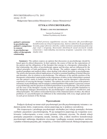 Psychoterapia 4 (175) 2015 strony: 21-34 Małgorzata Opoczyńska-Morasiewicz1, Janusz Morasiewicz2 Etyka i psychoterapia Ethics and psychotherapy 2 patient’s autonomy in psychotherapy patient’s competence to consent to psychotherapy ethics of therapeutic relationship 1 Instytut Psychologii UJ Gabinet Psychiatryczny Kraków Artykuł porusza zagadnienia etyczne, kluczowe dla prawidłowego kształtowania się relacji terapeutycznej. Autorzy odnieśli je do paradygmatu leczenia, pojęć zdrowia i choroby, a także istotności autonomii pacjenta oraz jego więzi z terapeutą. Stosowanie określonych zasad etycznych zostało zestawione z indywidualną etycznością terapeuty i pacjenta oraz relacji między nimi. Summary: The authors express an opinion that discussion on psychotherapy should be based upon its ethical dimension. In their opinion, the source of that are the expectations of the patient and the obligations of the therapist that emerge in a therapeutic relationship. In that relationship, the ethics of psychotherapy appear and develop, and are influenced by the ethical principles of both participants of the therapy. The authors suggest referring to the medical paradigm and medical ethics when dealing with ethical decisions in psychotherapy. The article also presents ethical implications of actual or nominal handling of mental illnesses and disorders, also in relation to psychotherapy. The influence of the specific position of the therapeutic relationship’s participants on the importance of ethics in this relationship is pointed out (the patient’s status as both the healed and the healer, and the therapist’s characteristic experience of carrying the therapy’s burden). The authors also refer to the issue of the patient’s autonomy in psychotherapy and investigate a related problem of the patient’s conscious consent to psychotherapy and the question of medical paternalism in psychotherapy. The article points out the issue of the therapist’s loyalty towards the patient, as well as possible limitations to the therapeutic dialogue determined by the psychotherapist’s and patient’s worldviews and ethical principles. The authors reckon that because of the relational nature of ethics, the ethical problems of a psychotherapist are different in the relationship with every single patient and in each given moment of the therapy. Wprowadzenie Podjęcie dyskusji na temat etyki psychoterapii jest dla psychoterapeuty tożsame z zadaniem pytań, które, rozproszone, nieraz pojawiają się w praktyce zawodowej. Dla rozpoczęcia i przebiegu psychoterapii niezbędna jest relacja pomiędzy dwiema osobami: pacjentem i psychoterapeutą. W jej następstwie pojawiają się wzajemne oczekiwania i zobowiązania, a wraz z nimi pytania i dylematy etyczne. Na skutek relacji pomiędzy pacjentem a terapeutą zasady, metody, cele, a także możliwe konsekwencje psychoterapii nabierają charakteru etycznego i podlegają ocenom moralnym zarówno z punktu widzenia pacjenta, jak i terapeuty, a również osób trzecich. Relacja terapeutyczna 22 Małgorzata Opoczyńska-Morasiewicz, Janusz Morasiewicz stanowi zatem tworzywo etyki psychoterapii, a etyczny wymiar powinien być podstawą rozważań o psychoterapii. Podobne przekonanie o podstawowym znaczeniu etyki w psychoterapii wyraża Tjeltveit [1], koncentrując się przede wszystkim na problematyce wartości w psychoterapii i abstrahując niejako od relacyjnego źródła etyki psychoterapii. Pytania, które niżej stawiamy, dotyczą źródeł etycznych rozstrzygnięć podejmowanych przez psychoterapeutę, w tym związanych z postrzeganiem cierpienia pacjenta, wpływu szczególnego charakteru relacji terapeutycznej na terapeutę i pacjenta, możliwości uzyskania świadomej zgody pacjenta na psychoterapię, paternalizmu terapeuty w kontekście autonomii pacjenta, lojalności terapeuty wobec pacjenta, wpływu światopoglądów obu uczestników psychoterapii na jej przebieg, a także możliwości podejmowania i kontynuowania psychoterapii oraz ograniczeń w tym zakresie ze względów etycznych. Dodajmy jeszcze, że pytania te stawiamy z pozycji lekarza psychoterapeuty i psychologa psychoterapeuty, a więc tylko jednego z dwóch — obok pacjenta — uczestników psychoterapii. W imieniu pacjenta nie możemy mówić, choć to, co miałby do powiedzenia, jest — jeśli nie ważniejsze — nie mniej ważne od słów terapeuty. Paradygmat medyczny źródłem rozstrzygnięć etycznych Psychoterapia jest metodą i — szerzej — sposobem leczenia osób doświadczających cierpień psychicznych i fizycznych. Leczenie, a więc i psychoterapia, dotyczy ze swej natury zdrowia, a czasem i życia pacjenta, tj. dóbr mających prawie dla każdego bardzo istotne znaczenie. Każdy akt leczniczy rozgrywa się pomiędzy co najmniej dwiema osobami: leczącym (lekarzem, terapeutą) a pacjentem. Podejmujący leczenie lekarze/terapeuci zobowiązani byli i są do przestrzegania zasad etycznych, zwykle bardziej rygorystycznych niż w innych zawodach. Czy zatem zobowiązania lekarzy wobec pacjentów obowiązują psychoterapeutów w relacji z pacjentami? Pytanie może się wydać na pozór retoryczne, jednakże przecież tylko niewielu psychoterapeutów jest lekarzami. Możliwe jest zapewne rozważanie problemów etycznych psychoterapii bez uwzględniania tradycji etyki medycznej, jednakże naszym zdaniem ten punkt odniesienia wydaje się najważniejszy spośród innych, trudny do pominięcia, gdyż każde inne spojrzenie niosłoby ze sobą ryzyko przyjęcia zasad etycznych niespójnych z akceptowanymi w medycynie, bądź nawet sprzecznych z nimi albo słabiej chroniących dobra pacjenta. Ponadto etyka lekarska, która dała podstawy do powstania etyki medycznej, datująca się od przysięgi Hipokratesa z V wieku p.n.e., jest najstarszą etyką zawodową, służącą od 2500 lat do ustalania obowiązków lekarza terapeuty wobec pacjenta i wypróbowaną w rozwiązywaniu konflikt