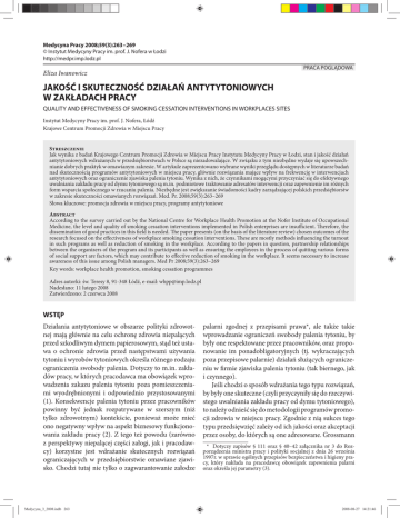 Medycyna Pracy 2008;59(3):263 – 269 © Instytut Medycyny Pracy im. prof. J. Nofera w Łodzi http://medpr.imp.lodz.pl PRACA POGLĄDOWA Eliza Iwanowicz JAKOŚĆ I SKUTECZNOŚĆ DZIAŁAŃ ANTYTYTONIOWYCH W ZAKŁADACH PRACY QUALITY AND EFFECTIVENESS OF SMOKING CESSATION INTERVENTIONS IN WORKPLACES SITES Instytut Medycyny Pracy im. prof. J. Nofera, Łódź Krajowe Centrum Promocji Zdrowia w Miejscu Pracy Streszczenie Jak wynika z badań Krajowego Centrum Promocji Zdrowia w Miejscu Pracy Instytutu Medycyny Pracy w Łodzi, stan i jakość działań antytytoniowych wdrażanych w przedsiębiorstwach w Polsce są niezadowalające. W związku z tym niezbędne wydaje się upowszechnianie dobrych praktyk w omawianym zakresie. W artykule zaprezentowano wybrane wyniki przeglądu dostępnych w literaturze badań nad skutecznością programów antytytoniowych w miejscu pracy, głównie rozwiązania mające wpływ na frekwencję w interwencjach antytytoniowych oraz ograniczenie zjawiska palenia tytoniu. Wynika z nich, że czynnikami mogącymi przyczyniać się do efektywnego uwalniania zakładu pracy od dymu tytoniowego są m.in. podmiotowe traktowanie adresatów interwencji oraz zapewnienie im różnych form wsparcia społecznego w rzucaniu palenia. Niezbędne jest zwiększanie świadomości kadry zarządzającej polskich przedsiębiorstw w zakresie skuteczności omawianych rozwiązań. Med. Pr. 2008;59(3):263–269 Słowa kluczowe: promocja zdrowia w miejscu pracy, programy antytytoniowe Abstract According to the survey carried out by the National Centre for Workplace Health Promotion at the Nofer Institute of Occupational Medicine, the level and quality of smoking cessation interventions implemented in Polish enterprises are insufficient. Therefore, the dissemination of good practices in this field is needed. The paper presents (on the basis of the literature review) chosen outcomes of the research focused on the effectiveness of workplace smoking cessation interventions. These are mostly methods influencing the turnout in such programs as well as reduction of smoking in the workplace. According to the papers in question, partnership relationships between the organizers of the program and its participants as well as ensuring the employees in the process of quitting various forms of social support are factors, which may contribute to effective reduction of smoking in the workplace. It seems necessary to increase awareness of this issue among Polish managers. Med Pr 2008;59(3):263–269 Key words: workplace health promotion, smoking cessation programmes Adres autorki: św. Teresy 8, 91-348 Łódź, e-mail: [email protected] Nadesłano: 11 lutego 2008 Zatwierdzono: 2 czerwca 2008 WSTĘP Działania antytytoniowe w obszarze polityki zdrowotnej mają głównie na celu ochronę zdrowia niepalących przed szkodliwym dymem papierosowym, stąd też ustawa o ochronie zdrowia przed następstwami używania tytoniu i wyrobów tytoniowych określa różnego rodzaju ograniczenia swobody palenia. Dotyczy to m.in. zakładów pracy, w których pracodawca ma obowiązek wprowadzenia zakazu palenia tytoniu poza pomieszczeniami wyodrębnionymi i odpowiednio przystosowanymi (1). Konsekwencje palenia tytoniu przez pracowników powinny być jednak rozpatrywane w szerszym (niż tylko zdrowotnym) kontekście, ponieważ może mieć ono negatywny wpływ na aspekt biznesowy funkcjonowania zakładu pracy (2). Z tego też powodu (zarówno z perspektywy niepalącej części załogi, jak i pracodawcy) korzystne jest wdrażanie skutecznych rozwiązań ograniczających w przedsiębiorstwie omawiane zjawisko. Chodzi tutaj nie tylko o zagwarantowanie załodze Medycyna_3_2008.indb 263 palarni zgodnej z przepisami prawa*, ale także takie wprowadzanie ograniczeń swobody palenia tytoniu, by były one respektowane przez pracowników, oraz proponowanie im ponadobligatoryjnych (tj. wykraczających poza przepisowe palarnie) działań służących ograniczeniu w firmie zjawiska palenia tytoniu (tak biernego, jak i czynnego). Jeśli chodzi o sposób wdrażania tego typu rozwiązań, by były one skuteczne (czyli przyczyniły się do rzeczywistego uwalniania zakładu pracy od dymu tytoniowego), to należy odnieść się do metodologii programów promocji zdrowia w miejscu pracy. Zgodnie z nią sukces tego typu przedsięwzięć zależy od ich jakości oraz akceptacji przez osoby, do których są one adresowane. Grossmann * Dotyczy zapisów § 111 oraz § 40–42 załącznika nr 3 do Rozporządzenia ministra pracy i polityki socjalnej z dnia 26 września 1997r. w sprawie ogólnych przepisów bezpieczeństwa i higieny pracy, który nakłada na pracodawcę obowiązek zapewnienia palarni oraz określa jej parametry (3). 2008-08-27 14:21:46 264 E. Iwanowicz i Scala obrazują to następującą zależnością: sukces programu = jego jakość × akceptacja (4). Podstawowym czynnikiem sprzyjającym przychylnemu przyjęciu przedsięwzięcia prozdrowotnego przez pracowników jest ich podmiotowe traktowanie, a także umożliwienie im uczestnictwa w całokształcie prac nad jego przygotowaniem. Jakość programu zależy natomiast m.in. od właściwego rozpoznania potrzeb zdrowotnych załogi oraz gotowości i możliwości ich zaspokojenia w firmie poprzez promocję zdrowia, a następnie na tej bazie zaplanowanie i wdrożenie działań służących kształtowaniu wiedzy, umiejętności i motywacji pracowników do realizacji zachowania zdrowotnego (niepalenia), a także stworzenie takich możliwości w zakładzie pracy (5). W 2006 r. w Krajowym Centrum Promocji Zdrowia w Miejscu Pracy (KCPZwMP) Instytutu Medycyny Pracy przeprowadzono badanie nt. działań antytytoniowych podejmowanych w polskich przedsiębiorstwach*. Zrealizowano je metodą wywiadu kwestionariuszowego wśród 611 przedsiębiorstw z terenu całego kraju. Wylosowana próba dobrana została jako reprezentatywna dla ogółu przedsiębiorstw w Polsce, zatrudniających powyżej 50 pracowników (z wyłą