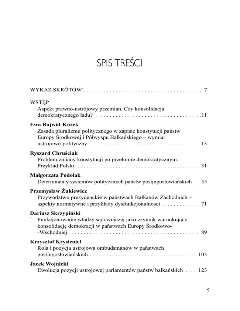 SPIS TREŚCI WYKAZ SKRÓTÓW`. . . . . . . . . . . . . . . . . . . . . . . . . . . . . . . . . . . . . . . . . 7 WSTĘP Aspekt prawno-ustrojowy przemian. Czy konsolidacja demokratycznego ładu? . . . . . . . . . . . . . . . . . . . . . . . . . . . . . . . . . . . . .11 Ewa Bujwid-Kurek Zasada pluralizmu politycznego w zapisie konstytucji państw Europy Środkowej i Półwyspu Bałkańskiego – wymiar ustrojowo-polityczny . . . . . . . . . . . . . . . . . . . . . . . . . . . . . . . . . . . . . . 13 Ryszard Chruściak Problem zmiany konstytucji po przełomie demokratycznym. Przykład Polski . . . . . . . . . . . . . . . . . . . . . . . . . . . . . . . . . . . . . . . . . . . 31 Małgorzata Podolak Determinanty systemów politycznych państw postjugosłowiańskich . . 55 Przemysław Żukiewicz Przywództwo prezydenckie w państwach Bałkanów Zachodnich – aspekty normatywne i przykłady dysfunkcjonalności . . . . . . . . . . . . . 71 Dariusz Skrzypiński ` Funkcjonowanie władzy sądowniczej jako czynnik warunkujący konsolidację demokracji w państwach Europy Środkowo-Wschodniej . . . . . . . . . . . . . . . . . . . . . . . . . . . . . . . . . . . . . . . . . . . . . 89 Krzysztof Krysieniel Rola i pozycja ustrojowa ombudsmanów w państwach postjugosłowiańskich . . . . . . . . . . . . . . . . . . . . . . . . . . . . . . . . . . . . . 103 Jacek Wojnicki Ewolucja pozycji ustrojowej parlamentów państw bałkańskich . . . . 123 5 Spis treści Adam Burakowski Determinanty stabilności rumuńskiego systemu politycznego. . . . . . 145 Bartłomiej Zdaniuk Nazwa języka a konsolidacja państwa. Kontrowersje wokół wyroku Sądu Konstytucyjnego Republiki Mołdawii z 5 grudnia 2013 roku. . . 157 Witold Brodziński System rządów − element konsolidacji ustroju demokratycznego w państwach Europy Środkowej po 1989 roku (wprowadzenie do rozważań). . . . . . . . . . . . . . . . . . . . . . . . . . . . . . . . . . . . . . . . . . . . 171 Krzysztof Skotnicki Ewolucja ustroju Republiki Słowacji po 1992 roku . . . . . . . . . . . . . . 183 Katarzyna Witkowska-Chrzczonowicz Przemiany demokratyczne w Republice Czeskiej . . . . . . . . . . . . . . . 199 Rafał Czachor Reżimy polityczne Ukrainy i Białorusi w ujęciu neopatrymonialnym . . . . . . . . . . . . . . . . . . . . . . . . . . . . . . . . . . . . . . 221 Marcin Sokołowski Naruszanie prawa podczas wyborów w Macedonii. Kwestia głosowania rodzinnego . . . . . . . . . . . . . . . . . . . . . . . . . . . . . . . . . . . 235 Wojciech Kasprowski Wolne wybory parlamentarne w Polsce w roku 1991 – termin odpowiedni czy spóźniony względem państw regionu?. . . . . . . . . . . 249 Michał Banaś Siła konstytucyjnych uprawnień prezydenta a poziom demokratyczności postkomunistycznych państw bałkańskich . . . . . . 267 Jakub Grzegorz Firlus, Natalie Fox Problematyka bezpośredniego stosowania ustawy zasadniczej Węgier z 2011 roku − wybrane zagadnienia na tle porównawczym . . 283 NOTY O AUTORACH . . . . . . . . . . . . . . . . . . . . . . . . . . . . . . . . . . . . . . 309 INDEKS NAZWISK . . . . . . . . . . . . . . . . . . . . . . . . . . . . . . . . . . . . . . . . .311 6