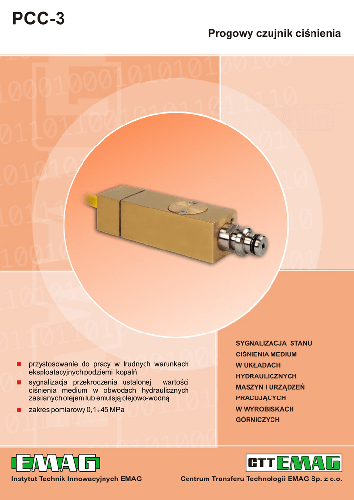 PCC-3 Progowy czujnik ciśnienia SYGNALIZACJA STANU CIŚNIENIA MEDIUM < przystosowanie do pracy w trudnych warunkach W UKŁADACH eksploatacyjnych podziemi kopalń HYDRAULICZNYCH < sygnalizacja przekroczenia ustalonej wartości MASZYN I URZĄDZEŃ ciśnienia medium w obwodach hydraulicznych PRACUJĄCYCH zasilanych olejem lub emulsją olejowo-wodną W WYROBISKACH zakres pomiarowy 0,1¸ 45 MPa < GÓRNICZYCH Instytut Technik Innowacyjnych EMAG Centrum Transferu Technologii EMAG Sp. z o.o. PCC-3 informacje techniczne Progowy czujnik ciśnienia PCC-3 jest przeznaczony do sygnalizacji przekroczenia ustalonej wartości ciśnienia medium w obwodach hydraulicznych zasilanych olejem lub emulsją olejowo-wodną. Metrologiczne - zakres nastawy ciśnienia - ciśnienie maksymalne - dokładność ustawienia ciśnienia progowego - histereza - ciśnienie progowe 0,1 ... 45 MPa 60 MPa 1% 5÷10% ustawionego ciśnienia progowego ustawione przez producenta Elektryczne - dopuszczalne parametry wejściowe Ui = 30 V DC, Ii = 2 A, Li = 7 µH - sygnał wyjściowy zestyk przełączalny o parametrach: 2 A/30 V AC/DC lub przełączalna rezystancja - wytrzymałość łączeniowa łącznika 5×10 cykli Warunki pracy - temperatura pracy - medium +5°C ... +60°C olej, emulsja olejowo-wodna Mechaniczne Wymiary gabarytowe Masa Długość przewodu Przyłącze procesowe Stopień ochrony obudowy Ø30×135 mm około 0,5 kg według zamówienia, maksymalnie 10 m Stecko DN10, gwint metryczny lub calowy IP 65 5 Rodzaj budowy przeciwwybuchowej I M1 Ex ia I II 2D Ex ia IIIB T105˚C Db Certyfikat badania typu WE KDB 04ATEX150 Znak zgodności ZAMÓWIENIA: Centrum Transferu Technologii EMAG Sp. z o.o. 40-189 Katowice, ul. Leopolda 31 tel. 32 2007 873, 32 2007 884 fax. 32 2007 883, www.cttemag.pl, e-mail: [email protected] PN-EN ISO 9001