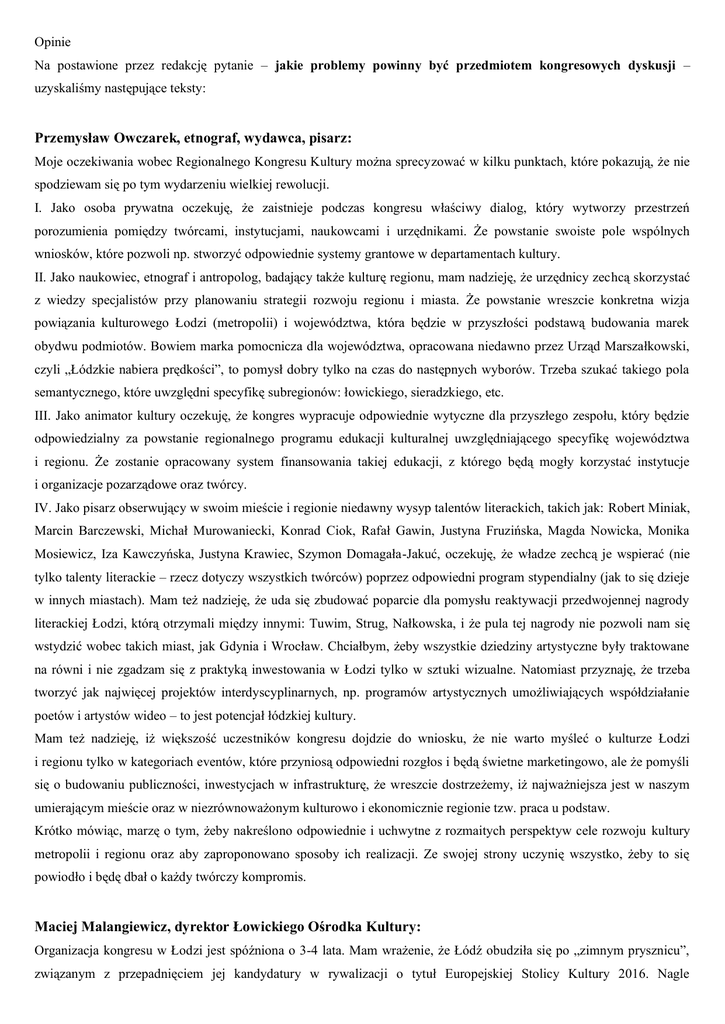 Opinie Na postawione przez redakcję pytanie – jakie problemy powinny być przedmiotem kongresowych dyskusji – uzyskaliśmy następujące teksty: Przemysław Owczarek, etnograf, wydawca, pisarz: Moje oczekiwania wobec Regionalnego Kongresu Kultury można sprecyzować w kilku punktach, które pokazują, że nie spodziewam się po tym wydarzeniu wielkiej rewolucji. I. Jako osoba prywatna oczekuję, że zaistnieje podczas kongresu właściwy dialog, który wytworzy przestrzeń porozumienia pomiędzy twórcami, instytucjami, naukowcami i urzędnikami. Że powstanie swoiste pole wspólnych wniosków, które pozwoli np. stworzyć odpowiednie systemy grantowe w departamentach kultury. II. Jako naukowiec, etnograf i antropolog, badający także kulturę regionu, mam nadzieję, że urzędnicy zechcą skorzystać z wiedzy specjalistów przy planowaniu strategii rozwoju regionu i miasta. Że powstanie wreszcie konkretna wizja powiązania kulturowego Łodzi (metropolii) i województwa, która będzie w przyszłości podstawą budowania marek obydwu podmiotów. Bowiem marka pomocnicza dla województwa, opracowana niedawno przez Urząd Marszałkowski, czyli „Łódzkie nabiera prędkości”, to pomysł dobry tylko na czas do następnych wyborów. Trzeba szukać takiego pola semantycznego, które uwzględni specyfikę subregionów: łowickiego, sieradzkiego, etc. III. Jako animator kultury oczekuję, że kongres wypracuje odpowiednie wytyczne dla przyszłego zespołu, który będzie odpowiedzialny za powstanie regionalnego programu edukacji kulturalnej uwzględniającego specyfikę województwa i regionu. Że zostanie opracowany system finansowania takiej edukacji, z którego będą mogły korzystać instytucje i organizacje pozarządowe oraz twórcy. IV. Jako pisarz obserwujący w swoim mieście i regionie niedawny wysyp talentów literackich, takich jak: Robert Miniak, Marcin Barczewski, Michał Murowaniecki, Konrad Ciok, Rafał Gawin, Justyna Fruzińska, Magda Nowicka, Monika Mosiewicz, Iza Kawczyńska, Justyna Krawiec, Szymon Domagała-Jakuć, oczekuję, że władze zechcą je wspierać (nie tylko talenty literackie – rzecz dotyczy wszystkich twórców) poprzez odpowiedni program stypendialny (jak to się dzieje w innych miastach). Mam też nadzieję, że uda się zbudować poparcie dla pomysłu reaktywacji przedwojennej nagrody literackiej Łodzi, którą otrzymali między innymi: Tuwim, Strug, Nałkowska, i że pula tej nagrody nie pozwoli nam się wstydzić wobec takich miast, jak Gdynia i Wrocław. Chciałbym, żeby wszystkie dziedziny artystyczne były traktowane na równi i nie zgadzam się z praktyką inwestowania w Łodzi tylko w sztuki wizualne. Natomiast przyznaję, że trzeba tworzyć jak najwięcej projektów interdyscyplinarnych, np. programów artystycznych umożliwiających współdziałanie poetów i artystów wideo – to jest potencjał łódzkiej kultury. Mam też nadzieję, iż większość uczestników kongresu dojdzie do wniosku, że nie warto myśleć o kulturze Łodzi i regionu tylko w kategoriach eventów, które przyniosą odpowiedni rozgłos i będą świetne marketingowo, ale że pomyśli się o budowaniu publiczności, inwestycjach w infrastrukturę, że wreszcie dostrzeżemy, iż najważniejsza jest w naszym umierającym mieście oraz w niezrównoważonym kulturowo i ekonomicznie regionie tzw. praca u podstaw. Krótko mówiąc, marzę o tym, żeby nakreślono odpowiednie i uchwytne z rozmaitych perspektyw cele rozwoju kultury metropolii i regionu oraz aby zaproponowano sposoby ich realizacji. Ze swojej strony uczynię wszystko, żeby to się powiodło i będę dbał o każdy twórczy kompromis. Maciej Malangiewicz, dyrektor Łowickiego Ośrodka Kultury: Organizacja kongresu w Łodzi jest spóźniona o 3-4 lata. Mam wrażenie, że Łódź obudziła się po „zimnym prysznicu”, związanym z przepadnięciem jej kandydatury w rywalizacji o tytuł Europejskiej Stolicy Kultury 2016. Nagle samorządowcy zorientowali się, że coś jest nie tak i znaleźli środki na badania, konsultacje i organizację kongresu. Obawiam się, że będzie to kolejna nuda, z której nic nie wyniknie. Znam program konferencji i jedyny pozytywny aspekt tego przedsięwzięcia w moim odczuciu jest taki, że goście i uczestnicy sesji oraz paneli odwiedzą Filharmonię Łódzką, która jest mądrze zarządzana, mocna programowo i zdecydowanie może wskazywać kierunki rozwoju dla innych łódzkich instytucji. Ale to Łódź. My na obrzeżach zawsze byliśmy skazani na siebie i lepiej czy gorzej dawaliśmy sobie radę. Renata Nolbrzak, dyrektor Forum Inicjatyw Twórczych w Parzęczewie: Organizacja debaty na temat stanu kultury w Łodzi i województwie łódzkim tuż po obradach Europejskiego Kongresu Kultury to doskonały pomysł. Pozwoli to w szerszym kontekście przyjrzeć się regionalnej polityce kulturalnej. Przeglądając program łódzkiego kongresu szczególnie zainteresowałam się sekcją tematyczną „Praktyki kulturowe”. Od kilkunastu lat zajmuję się bowiem działalnością kulturalną w gminie Parzęczew i obserwuję w praktyce zmiany, o których piszą w swoich raportach naukowcy. Cytowany na stronie internetowej kongresu wniosek autorów raportu o stanie kultury, że znaczna część tradycyjnych instytucji nie ma szans na przetrwanie, daje do myślenia. Odnosząc to do terenu, na którym działam, poszukuję odpowiedzi na pytanie, jaka formuła na wsi jest optymalna? Na pewno stracił rację bytu tradycyjny model gminnego ośrodka kultury. Oczywiście istotne jest kultywowanie tradycji ludowych, ale nie można uporczywie trzymać się formuły opartej na współpracy z kołami gospodyń wiejskich i zespołami folklorystycznymi, a tak właśnie funkcjonuje większość wiejskich ośrodków. Jak jednak dostosować ofertę kulturalną do współczesnych wymogów i oczekiwań, nie tracąc jednocześnie dotychczasowego dorobku – oto zasadnicze pytanie, na które być mo