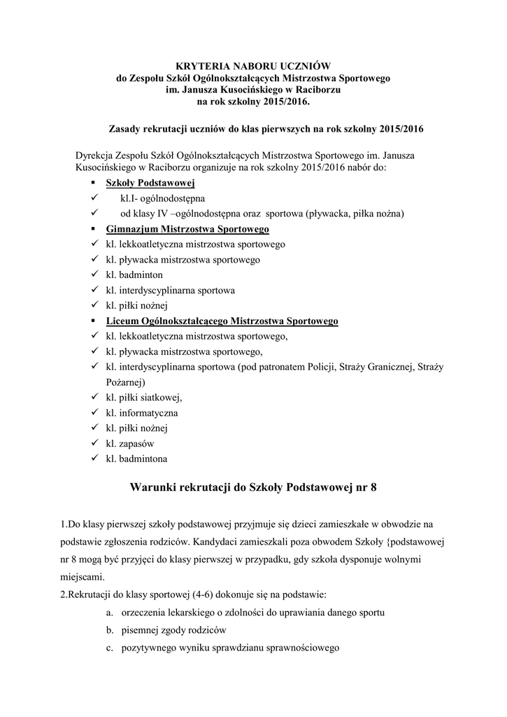 Kusocińskiego w Raciborzu organizuje na rok szkolny 2015/2016 nabór do: