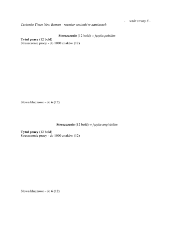 Czcionka Times New Roman - rozmiar czcionki w nawiasach Streszczenie (12 bold) w języku polskim Tytuł pracy (12 bold) Streszczenie pracy - do 1000 znaków (12) Słowa kluczowe - do 6 (12) Streszczenie (12 bold) w języku angielskim Tytuł pracy (12 bold) Streszczenie pracy - do 1000 znaków (12) Słowa kluczowe - do 6 (12) wzór strony 5 -
