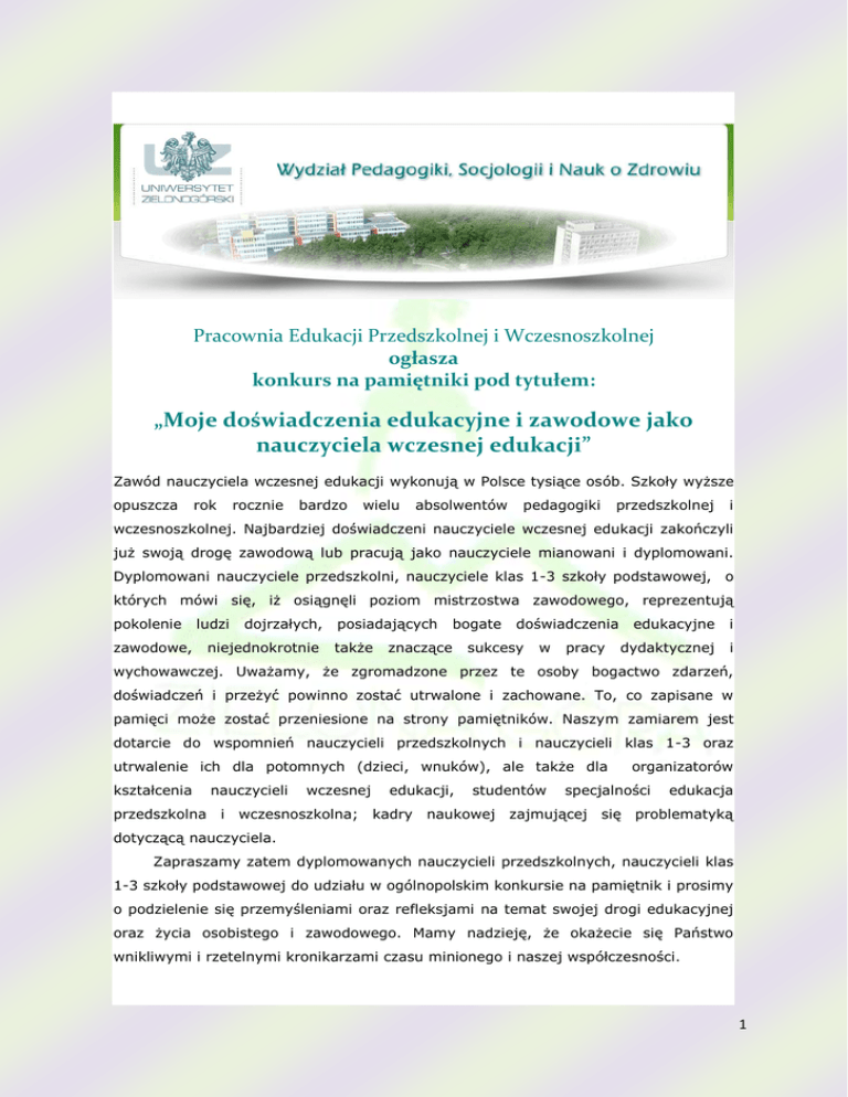 Pracownia Edukacji Przedszkolnej i Wczesnoszkolnej ogłasza konkurs na pamiętniki pod tytułem: „Moje doświadczenia edukacyjne i zawodowe jako nauczyciela wczesnej edukacji” Zawód nauczyciela wczesnej edukacji wykonują w Polsce tysiące osób. Szkoły wyższe opuszcza rok rocznie bardzo wielu absolwentów pedagogiki przedszkolnej i wczesnoszkolnej. Najbardziej doświadczeni nauczyciele wczesnej edukacji zakończyli już swoją drogę zawodową lub pracują jako nauczyciele mianowani i dyplomowani. Dyplomowani nauczyciele przedszkolni, nauczyciele klas 1-3 szkoły podstawowej, o których mówi się, iż osiągnęli poziom mistrzostwa zawodowego, reprezentują pokolenie zawodowe, ludzi dojrzałych, niejednokrotnie posiadających także bogate znaczące doświadczenia sukcesy w pracy edukacyjne i dydaktycznej i wychowawczej. Uważamy, że zgromadzone przez te osoby bogactwo zdarzeń, doświadczeń i przeżyć powinno zostać utrwalone i zachowane. To, co zapisane w pamięci może zostać przeniesione na strony pamiętników. Naszym zamiarem jest dotarcie do wspomnień nauczycieli przedszkolnych i nauczycieli klas 1-3 oraz utrwalenie ich dla potomnych (dzieci, wnuków), ale także dla kształcenia nauczycieli przedszkolna i wczesnej edukacji, studentów organizatorów specjalności edukacja wczesnoszkolna; kadry naukowej zajmującej się problematyką dotyczącą nauczyciela. Zapraszamy zatem dyplomowanych nauczycieli przedszkolnych, nauczycieli klas 1-3 szkoły podstawowej do udziału w ogólnopolskim konkursie na pamiętnik i prosimy o podzielenie się przemyśleniami oraz refleksjami na temat swojej drogi edukacyjnej oraz życia osobistego i zawodowego. Mamy nadzieję, że okażecie się Państwo wnikliwymi i rzetelnymi kronikarzami czasu minionego i naszej współczesności. 1 Organizator konkursu Wydział Pedagogiki, Socjologii i Nauk o Zdrowiu Pracownia Edukacji Przedszkolnej i Wczesnoszkolnej, dr Anetta Soroka-Fedorczuk, dr Mirosława Nyczaj-Drąg Uczestnicy konkursu - dyplomowani nauczyciele przedszkolni, - dyplomowani nauczyciele klas 1-3. Cele konkursu: 1. Poznanie: kim są dyplomowani nauczyciele wczesnej edukacji? 2. Ukazanie „portretów” pokolenia dojrzałych nauczycieli przedszkolnych i klas 1-3 szkoły podstawowej na podstawie ich doświadczeń życiowych, edukacyjnych i zawodowych. 3. Pogłębienie wiedzy na temat zawodu nauczyciela wczesnej edukacji. 4. Wyłonienie najlepszych prac konkursowych i przyznanie nagród. 5. Opublikowanie najlepszych prac. Prace konkursowe Prace konkursowe stanowią pamiętniki dowolnej objętości, dostarczone w formie czytelnych rękopisów lub wydruków komputerowych wraz z dołączonym plikiem zapisanym na nośnikach (CD, pendrive). Prosimy o uwzględnienie w treści opisu: 1) wieku, wykształcenia, stażu pracy (typ szkoły, nazwa, miejsce), ukończonych specjalności, sytuacji rodzinnej, materialnej i innych, ważnych zdaniem autora danych osobistych i życiowych; 2) drogi edukacyjnej (etapów kształcenia) wraz z motywami dotyczącymi wyboru zawodu, podejmowania poszczególnych form kształcenia i dokształcania; 3) rozwoju zawodowego (pozyskiwanych kolejno stopni awansu zawodowego). Dodatkowo ważne byłyby dla nas informacje na temat: 1) doświadczeń związanych z kontaktami z dziećmi i ich rodzicami (Co z tego wiem o dziecku i jego rodzicach? Jak ich oceniam w perspektywie czasowej? Jak to wyglądało w początkowym okresie pracy zawodowej i jak to się zmieniało? 1) przedszkola, szkoły i pełnionych przez nie funkcji (kiedyś (dawniej) i dziś), na tle kolejnych reform programowych; 2) form dzielenia się doświadczeniami zawodowymi (bloogi, strony internetowe, prowadzenie praktyk studenckich, pełnienie funkcji opiekuna stażu, pisanie artykułów do czasopism pedagogicznych itp.); 3) pasji, zainteresowań, działalności twórczej; 4) przemyśleń, dążeń, oczekiwań, propozycji. 5) sukcesów, porażek, nagród, wyróżnień i stosunku do nich; 6) rozterek i dylematów związanych z wykonywanym zawodem. Mile widziane zdjęcia, ilustracje, materiały filmowe itp. 2 Jury konkursu Pracownicy naukowi Wydziału Pedagogiki, Socjologii i Nauk o Zdrowiu Kryteria oceny prac konkursowych: 1) Kryterium merytoryczne (bogactwo treści, szczegółowość opisu wydarzeń, własna ocena rzeczywistości, oryginalność). 2) Kryterium techniczne: - rękopisy: bardzo wyraźne, czytelne; - tekst w postaci wydruku komputerowego (czcionka Times New Roman, wielkość 12, odstęp między wersami 1,5; tekst wyrównany, tytuły - czcionka wielkość 14, każda kolejna myśl od nowego akapitu, numeracja stron, tekst na kolejnych stronach). Komisja konkursowa zastrzega sobie prawo odrzucenia prac nie spełniających wymogów formalnych. Organizatorzy nie będą odsyłać nadesłanych prac konkursowych. Wszystkim uczestnikom życzymy powodzenia! Nagrody: I nagroda - 4.000,00 zł. II nagroda - 3. 000,00 zł. III nagroda – 1. 000,00 zł. 10 wyróżnień – nagrody książkowe Termin składania prac: do 30 września 2012 r. Termin i forma rozstrzygnięcia konkursu: grudzień 2012 r., uroczyste ogłoszenie wyników i wręczenie nagród Miejsce składania prac Uniwersytet Zielonogórski, Wydział Pedagogiki, Socjologii i Nauk o Zdrowiu, Soroka-Fedorczuk, ul. al. Wojska Polskiego 69, sekretariat, pok. 225 dr Anetta Prace należy przesłać z dopiskiem: „Konkurs na pamiętniki dyplomowanych nauczycieli wczesnej edukacji”. Na pracy powinny być umieszczone dokładne dane osobowe (imię, nazwisko, adres zamieszkania, wiek, ewentualnie nr telefonu i adres e-mail). 3 Praca powinna być opatrzona własnoręcznym podpisem autora. Organizatorzy konkursu gwarantują wszystkim autorom pamiętników dyskrecję i anonimowość, a nagrodzone prace przewidziano do druku po autoryzacji tekstów oraz wyrażeniu pisemnej zgody autora. Kontakt: Sekretariat : tel. 683283256 dr Anetta Soroka-Fedorczuk: adres e-mail: [email protected]:, tel. 607035026 4
