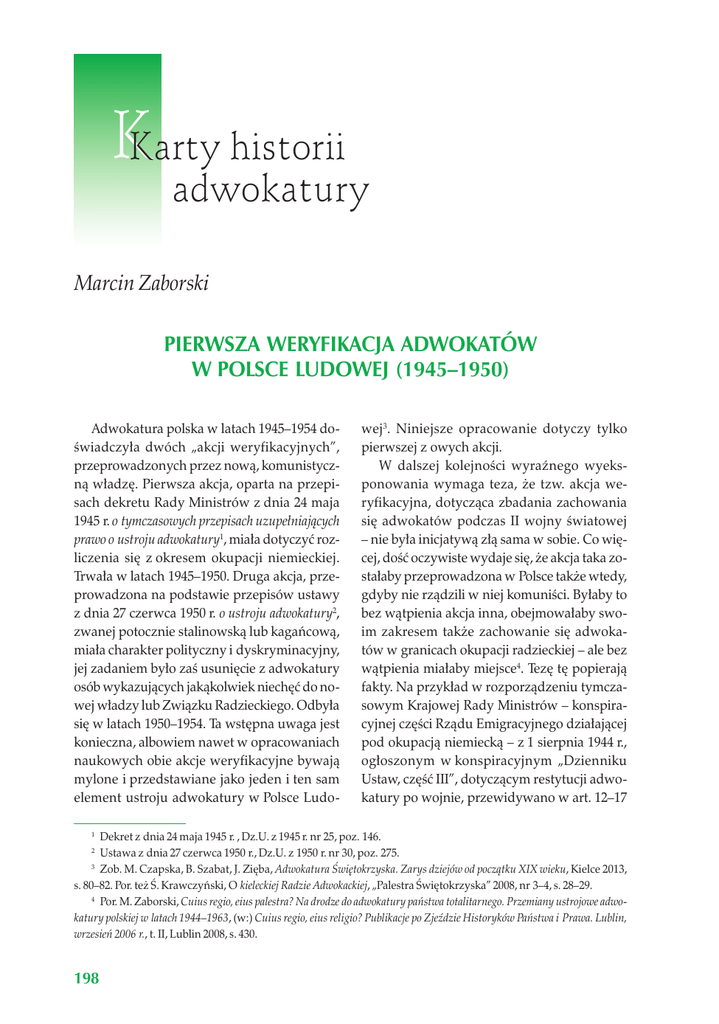 KKarty historii adwokatury Marcin Zaborski Pierwsza weryfikacja adwokatów w Polsce Ludowej (1945–1950) Adwokatura polska w latach 1945–1954 doświadczyła dwóch „akcji weryfikacyjnych”, przeprowadzonych przez nową, komunistyczną władzę. Pierwsza akcja, oparta na przepisach dekretu Rady Ministrów z dnia 24 maja 1945 r. o tymczasowych przepisach uzupełniających prawo o ustroju adwokatury1, miała dotyczyć rozliczenia się z okresem okupacji niemieckiej. Trwała w latach 1945–1950. Druga akcja, przeprowadzona na podstawie przepisów ustawy z dnia 27 czerwca 1950 r. o ustroju adwokatury2, zwanej potocznie stalinowską lub kagańcową, miała charakter polityczny i dyskryminacyjny, jej zadaniem było zaś usunięcie z adwokatury osób wykazujących jakąkolwiek niechęć do nowej władzy lub Związku Radzieckiego. Odbyła się w latach 1950–1954. Ta wstępna uwaga jest konieczna, albowiem nawet w opracowaniach naukowych obie akcje weryfikacyjne bywają mylone i przedstawiane jako jeden i ten sam element ustroju adwokatury w Polsce Ludo- wej3. Niniejsze opracowanie dotyczy tylko pierwszej z owych akcji. W dalszej kolejności wyraźnego wyeksponowania wymaga teza, że tzw. akcja weryfikacyjna, dotycząca zbadania zachowania się adwokatów podczas II wojny światowej – nie była inicjatywą złą sama w sobie. Co więcej, dość oczywiste wydaje się, że akcja taka zostałaby przeprowadzona w Polsce także wtedy, gdyby nie rządzili w niej komuniści. Byłaby to bez wątpienia akcja inna, obejmowałaby swoim zakresem także zachowanie się adwokatów w granicach okupacji radzieckiej – ale bez wątpienia miałaby miejsce4. Tezę tę popierają fakty. Na przykład w rozporządzeniu tymczasowym Krajowej Rady Ministrów – konspiracyjnej części Rządu Emigracyjnego działającej pod okupacją niemiecką – z 1 sierpnia 1944 r., ogłoszonym w konspiracyjnym „Dzienniku Ustaw, część III”, dotyczącym restytucji adwokatury po wojnie, przewidywano w art. 12–17 Dekret z dnia 24 maja 1945 r. , Dz.U. z 1945 r. nr 25, poz. 146. Ustawa z dnia 27 czerwca 1950 r., Dz.U. z 1950 r. nr 30, poz. 275. 3 Zob. M. Czapska, B. Szabat, J. Zięba, Adwokatura Świętokrzyska. Zarys dziejów od początku XIX wieku, Kielce 2013, s. 80–82. Por. też Ś. Krawczyński, O kieleckiej Radzie Adwokackiej, „Palestra Świętokrzyska” 2008, nr 3–4, s. 28–29. 4 Por. M. Zaborski, Cuius regio, eius palestra? Na drodze do adwokatury państwa totalitarnego. Przemiany ustrojowe adwokatury polskiej w latach 1944–1963, (w:) Cuius regio, eius religio? Publikacje po Zjeździe Historyków Państwa i Prawa. Lublin, wrzesień 2006 r., t. II, Lublin 2008, s. 430. 1 2 198 11–12/2015 instytucję „sprawdzania” adwokatów oraz „list adwokatów sprawdzonych”5. „Sprawdzenie” adwokata miało polegać na zbadaniu, czy weryfikowany adwokat „swoim zachowaniem się lub działalnością zwłaszcza w okresie okupacji” nie uchybił „obowiązkom obywatela polskiego lub godności stanu adwokackiego”6. Okoliczność, że ww. rozporządzenie tymczasowe było stosowane, jest w tym momencie bez znaczenia – istotna jest bowiem intencja legalnego ustawodawcy, związanego z Rządem Emigracyjnym w Londynie. Konieczność zweryfikowania adwokatów była dostrzegana także oddolnie, przez odradzające się w poszczególnych izbach adwokackich organy adwokatury. Np. w Izbie Adwokackiej w Lublinie miejscowa Rada Adwokacka, działająca chwilowo jako całkowicie niezależna od nowej władzy, już w uchwale z 18 sierpnia 1944 r. wprowadziła obowiązek „wyjaśniania” radzie przez adwokatów zamierzających wznowić praktykę, „czym zajmowali się w okresie od dnia 1 września 1939 r. do daty zgłoszenia”7. Problem dostrzegła także Rada Adwokacka w Warszawie (zwana też Komitetem Organizacyjnym Izby Adwokackiej w Warszawie), kierowana przez krótki okres od 8 lutego 1945 r. do końca marca 1945 r. przez adw. Ryszarda Henrykowskiego i pozostająca we względnej niezależności od władzy „ludowej”. W uchwale z 12 lutego 1945 r. rada ta stwierdziła przy okazji rozpatrywania kwestii aktualności w Polsce Ludo- Pierwsza weryfikacja adwokatów... wej uprawnień adwokackich pochodzących z okresu II RP, że tymczasowo kwestię „zachowania się adwokatów w okresie okupacji niemieckiej mogą w razie nasuwających się wątpliwości rozpatrywać władze dyscyplinarne korporacji”8. Powyższe uwagi nie oznaczają jednak, że pierwszą akcję weryfikacyjną należy oceniać pozytywnie. Podstawą prawną przeprowadzenia pierwszej akcji weryfikacyjnej były przepisy art. 4–10 wspomnianego już wyżej dekretu Rady Ministrów z 24 maja 1945 r. Warto w tym miejscu zaznaczyć, że dekret ten w innych swoich artykułach zniósł de facto samorządność adwokatury oraz adwokacką incompatibilitas, unieważnił nadto dotychczasowe listy adwokatów i listy aplikantów adwokackich9. Dekret ów miał w teorii tylko „uzupełniać” przepisy obowiązującej nadal (aż do 1950 r.) ustawy z dnia 4 maja 1938 r. Prawo o ustroju adwokatury10, jednak de facto spowodował obumarcie najważniejszych jej przepisów, uczynił adwokaturę w Polsce zależną od nowej władzy i niesamorządną. Przepisy dekretu z 24 maja 1945 r. dotyczące weryfikacji adwokatów były sformułowane w sposób zawiły i niejasny, ich wykładnia nastręczała – i nastręcza nadal – trudności i wiele wątpliwości. Dodatkowe zagmatwanie wynika z faktu, że na mocy innego dekretu – z 26 sierpnia 1946 r. – dokonano nowelizacji dekretu z 24 maja 1945 r., polegającej na przedłużeniu terminu, w którym dopuszczalne 5 Rozporządzenie Tymczasowe Krajowej Rady Ministrów z dnia 1 sierpnia 1944 r. o uruchomieniu adwokatury, zob. treść w: T. J. Kotliński, A. Redzik, M. Zaborski, Historia ustroju Adwokatury Polskiej w źródłach, Warszawa 2013, s. 341–344. 6 Art. 12 ust. 3 rozporządzenia tymczasowego przewidywał, że adwokatowi