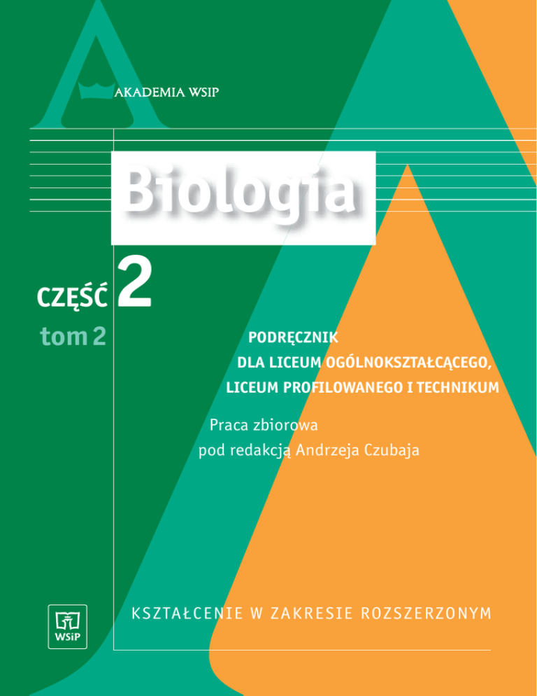 Biologia CZĘŚĆ tom2 2 PODRĘCZNIK DLA LICEUM OGÓLNOKSZTAŁCĄCEGO, LICEUM PROFILOWANEGO I TECHNIKUM Praca zbiorowa pod redakcją Andrzeja Czubaja K S ZTAŁC ENIE W ZAKR ES I E ROZ S Z ER ZONY M SPIS TREÂCI Od Autorów ............................................................................................................................... 5 Fizjologia zwierzàt z elementami fizjologii cz∏owieka 11. Ârodowisko wewn´trzne organizmu zwierz´cego ......................................................................... 12. 13. 14. 15. 16. 17. 18. 19. 20. 21. 22. 11.1. Ârodowisko wewn´trzne organizmu ................................................................................................. 11.2. Homeostaza .................................................................................................................................... 11.3. Informacja i regulacja ...................................................................................................................... Uk∏ad nerwowy .................................................................................................................................... 12.1. Budowa i funkcje tkanki nerwowej .................................................................................................. 12.2. Budowa i funkcje uk∏adu nerwowego .............................................................................................. ¸uk odruchowy – od receptora do efektora .................................................................................... 13.1. Odruchy .......................................................................................................................................... 13.2. Narzàdy zmys∏ów ............................................................................................................................ Dokàd prowadzà drogi czuciowe ...................................................................................................... 14.1. Trójneuronowe drogi czucia swoistego ............................................................................................. 14.2. Regulacja ruchu................................................................................................................................ 14.3. Budowa i funkcje kory mózgowej ..................................................................................................... Uk∏ad limbiczny i autonomiczny ........................................................................................................ 15.1. Ocena emocjonalna bodêców .......................................................................................................... 15.2. Autonomiczny uk∏ad nerwowy ......................................................................................................... Uk∏ad dokrewny .................................................................................................................................... 16.1. Gruczo∏y wydzielania wewn´trznego i ich hormony .......................................................................... 16.2. Uk∏ad odÊrodkowy neuroendokrynowy ............................................................................................ 16.3. Inne gruczo∏y dokrewne ................................................................................................................... 16.4. Hormony tkankowe ......................................................................................................................... Efektory ................................................................................................................................................... 17.1. Mi´Ênie szkieletowe ........................................................................................................................ 17.2. Mi´sieƒ sercowy .............................................................................................................................. 17.3. Mi´Ênie g∏adkie ............................................................................................................................... 17.4. Gruczo∏y wydzielania zewn´trznego ................................................................................................. Od˝ywianie i trawienie ........................................................................................................................ 18.1. Strategie pokarmowe zwierzàt ......................................................................................................... 18.2. Sk∏adniki pokarmu .......................................................................................................................... 18.3. Budowa i dzia∏anie przewodu pokarmowego kr´gowców................................................................. Wymiana gazowa .................................................................................................................................. 19.1. Wymiana gazowa u zwierzàt wodnych ............................................................................................ 19.2. Wymiana gazowa u zwierzàt làdowych ........................................................................................... Metabolizm ............................................................................................................................................ 20.1. Poziomy metabolizmu ...................................................................................................................... 20.2. Niektóre czynniki wp∏ywajàce na metabolizm ................................................................................... Uk∏ad krà˝enia ...................................................................................................................................... 21.1. Uk∏ad krà˝enia otwarty ......................................................................................