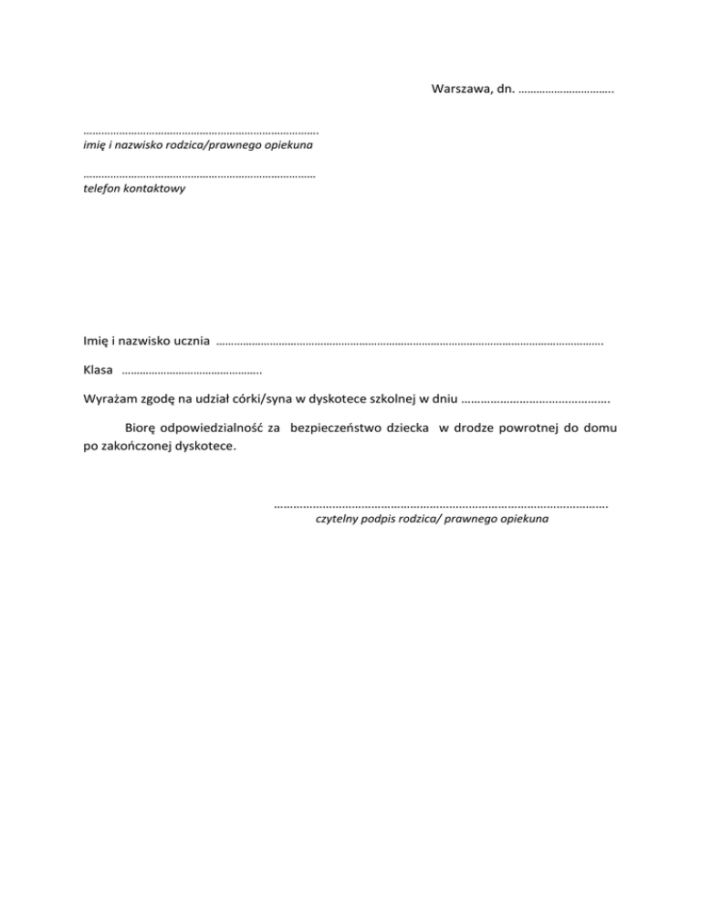 Warszawa, dn. ………………………….. ……………………………………………………………………. imię i nazwisko rodzica/prawnego opiekuna …………………………………………………………………… telefon kontaktowy Imię i nazwisko ucznia …………………………………………………………………………………………………………………. Klasa ……………………………………….. Wyrażam zgodę na udział córki/syna w dyskotece szkolnej w dniu ………………………………………. Biorę odpowiedzialność za bezpieczeństwo dziecka w drodze powrotnej do domu po zakończonej dyskotece. …………………………………………………………………………………………. czytelny podpis rodzica/ prawnego opiekuna