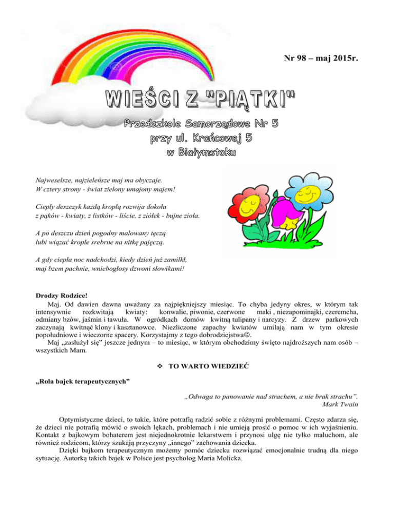 Nr 98 – maj 2015r. Najweselsze, najzieleńsze maj ma obyczaje. W cztery strony - świat zielony umajony majem! Ciepły deszczyk każdą kroplą rozwija dokoła z pąków - kwiaty, z listków - liście, z ziółek - bujne zioła. A po deszczu dzień pogodny malowany tęczą lubi wiązać krople srebrne na nitkę pajęczą. A gdy ciepła noc nadchodzi, kiedy dzień już zamilkł, maj bzem pachnie, wniebogłosy dzwoni słowikami! Drodzy Rodzice! Maj. Od dawien dawna uważany za najpiękniejszy miesiąc. To chyba jedyny okres, w którym tak intensywnie rozkwitają kwiaty: konwalie, piwonie, czerwone maki , niezapominajki, czeremcha, odmiany bzów, jaśmin i tawuła. W ogródkach domów kwitną tulipany i narcyzy. Z drzew parkowych zaczynają kwitnąć klony i kasztanowce. Niezliczone zapachy kwiatów umilają nam w tym okresie popołudniowe i wieczorne spacery. Korzystajmy z tego dobrodziejstwa. Maj „zasłużył się” jeszcze jednym – to miesiąc, w którym obchodzimy święto najdroższych nam osób – wszystkich Mam. TO WARTO WIEDZIEĆ „Rola bajek terapeutycznych” „Odwaga to panowanie nad strachem, a nie brak strachu”. Mark Twain Optymistyczne dzieci, to takie, które potrafią radzić sobie z różnymi problemami. Często zdarza się, że dzieci nie potrafią mówić o swoich lękach, problemach i nie umieją prosić o pomoc w ich wyjaśnieniu. Kontakt z bajkowym bohaterem jest niejednokrotnie lekarstwem i przynosi ulgę nie tylko maluchom, ale również rodzicom, którzy szukają przyczyny „innego” zachowania dziecka. Dzięki bajkom terapeutycznym możemy pomóc dziecku rozwiązać emocjonalnie trudną dla niego sytuację. Autorką takich bajek w Polsce jest psycholog Maria Molicka. Bajka terapeutyczna – krótkie opowiadanie z morałem tworzone dla dzieci w wieku od 3 do 9 lat. W opowiadaniach tych świat jest widziany z dziecięcej perspektywy. Ich głównym zadaniem jest przezwyciężanie i redukowanie lęku u dzieci. Cechą bajek terapeutycznych jest to, że bohater znajduje się w trudnej sytuacji i przeżywa stany lękowe. Wprowadzone do bajki postaci pomagają bohaterowi znaleźć sposoby przezwyciężenia trudnych chwil życia. Dziecko ma możliwość przebycia z bohaterem całej drogi wyjścia z lęku. Zazwyczaj bohaterami bajek terapeutycznych są małe zwierzątka, dzieci lub zabawki, z którymi czytelnik (słuchacz), może się identyfikować. Rodzaje bajek terapeutycznych: a) Bajki relaksacyjne, których celem jest wyciszenie, odprężenie, uspokojenie dziecka. Osoba, która je opowiada, bądź czyta, powinna robić to spokojnym, ciepłym i przyciszonym głosem, być odprężona i zrelaksowana. Bajka relaksacyjna opiera się na 3 strukturach: - słuchowej - śpiew ptaków, szum wody itp. - wzrokowej - widzisz pole maków, szczyty gór, morskie fale itp. - czuciowej - czujesz krople deszczu na twarzy, podmuchy wiatru, pijesz wodę z pobliskiego źródła itp. Miejsce akcji zawsze jest bezpieczne, przyjazne i spokojne. Bohater opowiadania obserwuje, doświadcza wszystkimi zmysłami miejsca, w którym się znajduje. W bajce relaksacyjnej występują specyficzne wydarzenia, którym przypisuje się silne działanie oczyszczające, uwalniające od napięć i negatywnych emocji. Sugestywna relaksacja przechodzi na coraz głębsze poziomy, odprężając kolejno mięśnie, rozszerzając naczynia krwionośne. b) Bajki psychoedukacyjne - mają na celu poszerzenie repertuaru zachowań dziecka, poprzez poznanie bohatera, który ma podobny problem. Kontakt ze światem bajki uczy jak dany problem rozwiązać, a tym samym go pokonać. Takie bajki powinny opowiadać o emocjach, rozpoznawaniu ich i nazywaniu. Bohaterami mogą być ludzie, zwierzęta, bądź rzeczy o ludzkich cechach. Są one wsparciem procesu wychowania. c) Bajki psychoterapeutyczne – których głównym celem jest obniżanie lęku powstałego w wyniku niezaspokojonych potrzeb lub niewłaściwych wyobrażeń dziecka o czymś lub o kimś. W tych bajkach świat tworzy zrozumiałą dla dziecka rzeczywistość, pozwala oswoić się z trudnymi sytuacjami, a także znaleźć rozwiązanie problemu. Bajka jest dłuższa, ma rozbudowaną fabułę. Jeżeli treść bajki budzi żywe zainteresowanie, to znak, że dziecko silnie utożsamia się z bohaterem i po wysłuchaniu przyjmie ją, albo odrzuci. Oto kilka tytułów bajek, które mogą pomóc w rozwiązywaniu niektórych problemów: a) nowe dziecko w rodzinie: - „Franklin czeka na siostrzyczkę” - Paulette Bourgeois - „O laleczce, która była klaunem” – Maria Molicka b) konflikt, kłótnia między rodzeństwem: - „Rodzeństwo starsze i młodsze” w serii: „Plastelinek” - Roksana Jędrzejewska- Wróbel - „Franklin wybacza siostrzyczce”- Paulette Bourgeois, Brenda Clark - „Rodzeństwo - jak ułatwić dziecku trudne życie z bratem lub siostrą” w: „Bajki, które leczą cz. II”- Doris Brett b) pobyt w szpitalu, wizyta u lekarza: - „Franklin idzie do szpitala” – Paulette Bourgeois - „Kamilka idzie do szpitala” - Aline Petingy, Nancy Aline Petingy, Nancy - „Kamilka idzie do doktora” – Aline Petingy, Nancy Aline Petingy, Nancy; - „Martynka jest chora” – Wanda Chotomska c) pójście do szkoły: - „Szkoła jest naprawdę super” - Dorota Swark - „Jestem już duży. Emil i Emilka idą do szkoły” - Jan Frey, Betina Gotzen-Beek - „Franklin idzie do szkoły” - Jan Frey, Betina Gotzen-Beek d) złość: - „Po co się złościć”- Elżbieta Zubrzycka - „Kapryśny aniołek. Paweł przestaje się złościć”- Antonia Michaelis, Betina Gotzen – Beek e) stres, napięcie, problem z zasypianiem: - „Wtul się w miękką chmurkę” - Sabine Kalwitzk - „33 odprężające opowiadania dla dzieci w wieku przedszkolnym” - Gabriele Hermanns f) agresja rówieśników, jak sobie z nią radzić: - „Dzielna Emilka” - Dagmar Geisler - „Słup soli”- Elżbieta Zubrzycka - „Śmierdzący ser”- Deleuze Gille