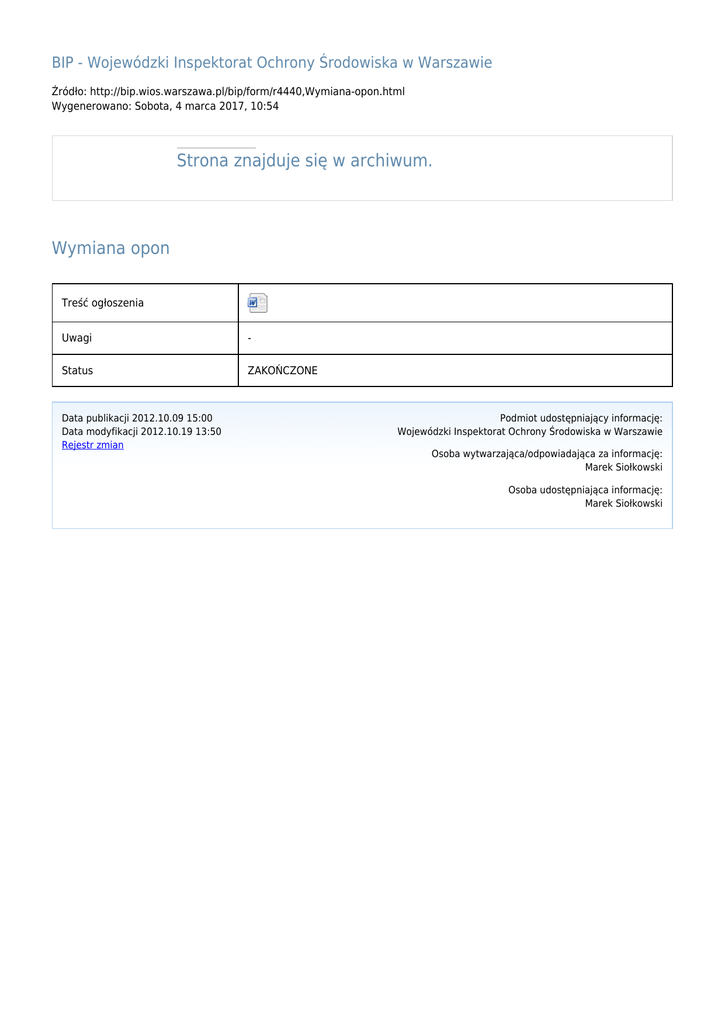 BIP - Wojewódzki Inspektorat Ochrony Środowiska w Warszawie Źródło: http://bip.wios.warszawa.pl/bip/form/r4440,Wymiana-opon.html Wygenerowano: Sobota, 4 marca 2017, 10:54 Strona znajduje się w archiwum. Wymiana opon Treść ogłoszenia Uwagi - Status ZAKOŃCZONE Data publikacji 2012.10.09 15:00 Data modyfikacji 2012.10.19 13:50 Rejestr zmian Podmiot udostępniający informację: Wojewódzki Inspektorat Ochrony Środowiska w Warszawie Osoba wytwarzająca/odpowiadająca za informację: Marek Siołkowski Osoba udostępniająca informację: Marek Siołkowski