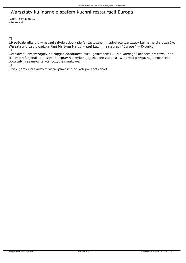 Zespół Szkół Ekonomiczno-Usługowych w Rybniku Warsztaty kulinarne z szefem kuchni restauracji Europa Autor: Bernadeta K. 21.10.2015. 19 października br. w naszej szkole odbyły się fantastyczne i inspirujące warsztaty kulinarne dla uczniów. Warsztaty przeprowadziła Pani Martyna Marcol - szef kuchni restauracji "Europa" w Rybniku. Uczniowie uczęszczający na zajęcia dodatkowe "ABC gastronomii ... dla każdego" ochoczo pracowali pod okiem profesjonalistki, szybko i sprawnie wykonując zlecone zadania. W bardzo przyjaznej atmosferze powstały niesamowite kompozycje smakowe. Dziękujemy i czekamy z niecierpliwością na kolejne spotkanie! http://www.zseu.pl/strona Kreator PDF Utworzono 4 March, 2017, 08:54