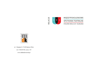 ul. 1 Sierpnia 9, 37-450 Stalowa Wola tel. 15 842 09 50, wewn. 119 www.mdkstalowawola.pl Pomysł na „Relacje. Międzypokoleniowe Spotkania Teatralne” zrodził się z potrzeby znalezienia miejsca wspólnego dla różnych generacji, pretekstu do rozmowy o tym, co łączy pokolenia i pozwala komunikować się bez uprzedzeń. Czas zmian, chaosu, nadmiaru informacji, deficyt autorytetów pomagających uporządkować nasze działania opowiadają się za spowolnieniem, przystankiem na rozmowę. Taki przystanek proponujemy w Stalowej Woli. Podczas tegorocznych „Relacji” zapraszamy do poszukiwania tego, co podobne w nas-młodych i nas-starszych. REGULAMIN ORGANIZATORZY „Relacje. Międzypokoleniowe Spotkania Teatralne” (MST) organizowane są przez Miejski Dom Kultury w Stalowej Woli. Biuro Organizacyjne MST: Miejski Dom Kultury w Stalowej Woli ul. 1 Sierpnia 9 37-450 Stalowa Wola tel. 15 842 09 50, wewn. 119 Koordynator Biura Organizacyjnego: Katarzyna Pawłowska e-mail: [email protected] Współorganizatorami MST są: Gmina Stalowa Wola, Starostwo Powiatowe w Stalowej Woli. 2 POSTANOWIENIA OGÓLNE 1. MST mają zasięg ogólnopolski. 2. Na MST składają się dwie grupy działań – konkurs na najlepszy spektakl międzypokoleniowy (zasady prezentacji spektakli konkursowych określa niniejszy Regulamin) oraz wydarzenia towarzyszące (oparte na odrębnych porozumieniach). 3. Forma spektakli konkursowych jest dowolna. 4. Zgłoszenie do udziału w MST jest równoznaczne z akceptacją Regulaminu. 5. Organizator powołuje Komisję Artystyczną, która na podstawie nadesłanych zgłoszeń kwalifikuje zespoły teatralne do udziału w MST. 6. Ostateczna interpretacja Regulaminu, rozstrzyganie kwestii spornych i niezawartych w Regulaminie należy do Organizatora. ZASADY UCZESTNICTWA 1. Do udziału w MST zapraszamy amatorskie zespoły teatralne (ze szczególnym uwzględnieniem grup międzypokoleniowych), które w swoich spektaklach poruszają zagadnienie relacji między młodością i starością. Uczestnikami MST mogą być osoby w każdym wieku. 2. Każdy zespół w ramach konkursu może zaprezentować jeden spektakl. 3. Maksymalny czas trwania spektaklu to 45 minut. 4. Czas montażu i demontażu scenografii, wraz z ustawieniem świateł, nie może przekraczać w sumie 30 minut. 5. Zespół aktorski spektaklu zgłoszonego do MST może liczyć maksymalnie 15 osób. 3 6. Warunkiem uczestnictwa w części konkursowej MST jest nadesłanie na adres Organizatora do 24 czerwca 2016 (decyduje data stempla pocztowego) następujących dokumentów: wypełnionej i podpisanej Karty Zgłoszenia, pełnego zapisu spektaklu na płycie DVD (plan ogólny bez zbliżeń i montażu), 3 zdjęć ze spektaklu (może być drogą elektroniczną na e-mail Biura Organizacyjnego) ze zgodą autorów na nieodpłatną publikację w materiałach reklamowych MST, oświadczeń wypełnionych przez pełnoletnich oraz opiekunów prawnych niepełnoletnich członków zespołów teatralnych. Organizator nie zwraca nadesłanych materiałów. 7. Po otrzymaniu informacji o zakwalifikowaniu do MST zespoły dokonują do 1 sierpnia 2016 bezzwrotnych opłat akredytacyjnych w wysokości 150 zł od osoby. Wpłaty należy przelać na konto bankowe Miejskiego Domu Kultury w Stalowej Woli – Bank Spółdzielczy w Stalowej Woli, nr konta: 95 9430 0006 0024 3410 2000 0001. W tytule przelewu należy wpisać nazwę grupy teatralnej, liczbę osób, za które dokonywana jest wpłata, a także „Relacje. MST – akredytacja”. Akredytacja obowiązuje wszystkich uczestników MST (w tym wykonawców, opiekunów, obsługę techniczną, kierowców). 8. Organizator MST zapewnia uczestnikom: zakwaterowanie (2 noclegi), wyżywienie (3 obiady, 2 kolacje, 2 śniadania), wstęp na wszystkie spektakle konkursowe i wydarzenia towarzyszące, udział w omówieniach spektakli. 4 9. Ustalenie kolejności prezentacji konkursowych należy do Organizatora. 10. W trakcie MST uczestnicy zobowiązują się do nieodpłatnych wykonań zgłoszonych spektakli. 11. Zespoły zakwalifikowane do MST uczestniczą w programie zaproponowanym przez Organizatora, natomiast laureaci zobowiązani są do powtórnej prezentacji spektaklu na Gali podsumowującej MST 25 września 2016. W przypadku, gdy zwycięska grupa teatralna nie wypełni powyższego warunku, Organizator zastrzega sobie prawo do zatrzymania nagrody. 12. Organizator MST nie zwraca kosztów podróży. Ubezpieczenie członków zespołów teatralnych na czas podróży również pozostaje po stronie podmiotów zgłaszających. 13. Uczestnicy wyrażają zgodę na fotografowanie i filmowanie swoich występów przez Organizatora oraz na nieodpłatną publikację wszelkich utrwalonych w ten sposób materiałów. 14. Uczestnicy MST wyrażają zgodę na nieodpłatną publikację i rozpowszechnianie swoich danych osobowych (w tym wizerunku) na potrzeby promocji, przygotowania i realizacji MST. 15. Koszty związane z prawami autorskimi są po stronie zespołów zgłoszonych do MST. TERMINY 10 maja-24 czerwca 2016 – nadsyłanie zgłoszeń do MST 18 lipca 2016 – ogłoszenie listy zespołów zakwalifikowanych do udziału w MST na stronie internetowej Organizatora (www.mdkstalowawola.pl). 5 29 lipca 2016 – ostateczny termin potwierdzania udziału w MST zakwalifikowanych zespołów teatralnych 1 sierpnia 2016 – ostateczny termin realizacji opłat akredytacyjnych przez zespoły teatralne zakwalifikowane do MST WARUNKI TECHNICZNE 1. Prezentacje konkursowe odbywają się w salach widowiskowej i kameralnej Miejskiego Domu Kultury. sala widowiskowa (wymiary podłogi sceny): 9 m x 10 m sala kameralna (wymiary podłogi sceny): 6 m x 6 m 23-25 września 2016 – prezentacje konkursowe w ramach MST 25 września 2016 – Gala podsumowująca „Relacje. Międzypokoleniowe Spotkania Teatralne” w Stalowej Woli JURY I NAGRODY 1. Uczestników konkursu na najlepszy spektakl międzypokoleniowy ocenia Jury w składzie: Joanna Szczepkowska (Przewod