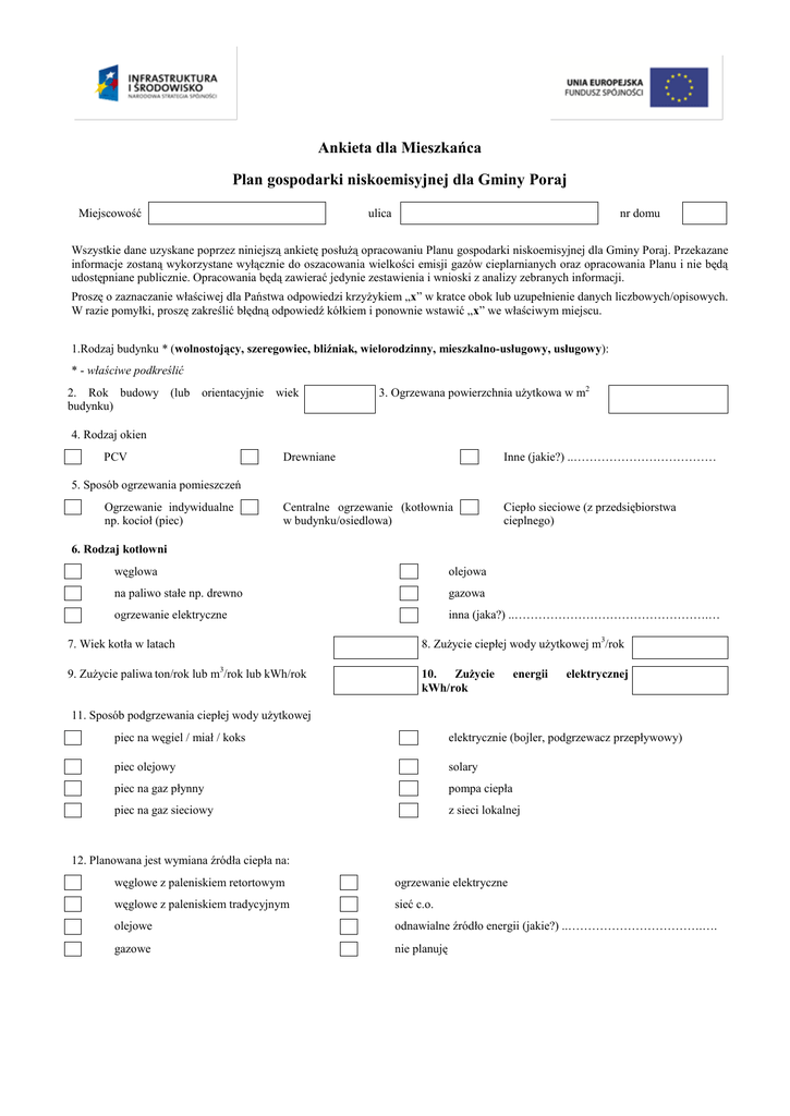 Ankieta dla Mieszkańca Plan gospodarki niskoemisyjnej dla Gminy Poraj Miejscowość ulica nr domu Wszystkie dane uzyskane poprzez niniejszą ankietę posłużą opracowaniu Planu gospodarki niskoemisyjnej dla Gminy Poraj. Przekazane informacje zostaną wykorzystane wyłącznie do oszacowania wielkości emisji gazów cieplarnianych oraz opracowania Planu i nie będą udostępniane publicznie. Opracowania będą zawierać jedynie zestawienia i wnioski z analizy zebranych informacji. Proszę o zaznaczanie właściwej dla Państwa odpowiedzi krzyżykiem „x” w kratce obok lub uzupełnienie danych liczbowych/opisowych. W razie pomyłki, proszę zakreślić błędną odpowiedź kółkiem i ponownie wstawić „x” we właściwym miejscu. 1.Rodzaj budynku * (wolnostojący, szeregowiec, bliźniak, wielorodzinny, mieszkalno-usługowy, usługowy): * - właściwe podkreślić 2. Rok budowy (lub budynku) orientacyjnie wiek 3. Ogrzewana powierzchnia użytkowa w m2 4. Rodzaj okien PCV Drewniane Inne (jakie?) ..……………………………… Centralne ogrzewanie (kotłownia w budynku/osiedlowa) Ciepło sieciowe (z przedsiębiorstwa cieplnego) 5. Sposób ogrzewania pomieszczeń Ogrzewanie indywidualne np. kocioł (piec) 6. Rodzaj kotłowni węglowa olejowa na paliwo stałe np. drewno gazowa ogrzewanie elektryczne inna (jaka?) ..………………………………………….… 7. Wiek kotła w latach 8. Zużycie ciepłej wody użytkowej m3/rok 9. Zużycie paliwa ton/rok lub m3/rok lub kWh/rok 10. Zużycie kWh/rok energii elektrycznej 11. Sposób podgrzewania ciepłej wody użytkowej piec na węgiel / miał / koks elektrycznie (bojler, podgrzewacz przepływowy) piec olejowy solary piec na gaz płynny pompa ciepła piec na gaz sieciowy z sieci lokalnej 12. Planowana jest wymiana źródła ciepła na: węglowe z paleniskiem retortowym ogrzewanie elektryczne węglowe z paleniskiem tradycyjnym sieć c.o. olejowe odnawialne źródło energii (jakie?) ..…………………………….…. gazowe nie planuję 13. Planowane prace termomodernizacyjne (zaznacz właściwe) nie planuję wymiana okien ocieplenie ścian montaż kolektorów słonecznych ocieplenie stropu pompa ciepłą 14. Typ pieca używanego do przygotowania posiłków węglowy elektryczno-gazowy gazowy Inny (jaki?) ……………………………………………………….… 15. Czy posiada Pan/Pani samochód osobowy? Tak, ile sztuk na gospodarstwo domowe? ………………………………… Nie Jeżeli tak – ile lat ma samochód/ mają samochody? ………………………………………………………………………………………… 16. Jakiego rodzaju paliwo używa Pan/Pani w samochodzie/ samochodach? benzyna diesel LPG bio-diesel 17. Ile średnio w miesiącu pokonuje Pan/Pani km własnym samochodem /-dami? 18. Jaki orientacyjny procent podróży własnym samochodem /-dami odbywa się w granicach Gminy? 19. Czy w gospodarstwie domowym są osoby korzystające regularnie (np. dojazdy do pracy, szkoły) z transportu publicznego: MZKP, kolej, PKS? Jeśli tak, proszę podać liczbę osób i rodzaj środka transportu. 20. Czy jest Pan/Pani zainteresowany/a udziałem w działaniach Gminy na rzecz redukcji, CO2 na terenie Gminy, poprzez np. wymianę źródeł ciepła na niskoemisyjne? Tak Nie, ponieważ (np. brak funduszy, niedawno wymieniono źródło ciepła, nie widzę sensu takich działań) ………………………………………………………………………………………………..…………. 21. Jeśli „tak” czy jest Pan/Pani skłonny/a wnieść wkład własny? Tak, jaka maksymalnie kwota? ………………….…………..PLN Nie Ankiety można wypełniać w wersji papierowej – wypełnione ankiety należy przekazywać pracownikowi Urzędu Gminy Poraj lub w wersji elektronicznej należy wysyłać na e-mail: [email protected] w terminie do 31 maja 2015 roku. Dziękujemy za wypełnienie Ankiety!