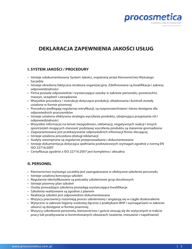 Cosmetic Labs & Production member of PackServiceGroup DEKLARACJA ZAPEWNIENIA JAKOŚCI USŁUG I. SYSTEM JAKOŚCI / PROCEDURY • Istnieje udokumentowany System Jakości, wspierany przez Kierownictwo Wyższego Szczebla • Istnieje określona faktyczna struktura organizacyjna. Zdefiniowane są kwalifikacje i zakresy odpowiedzialności • Firma posiada odpowiednie i wystarczające zasoby w zakresie personelu, powierzchni, maszyn, urządzeń i zarządzania • Wszystkie procedury / instrukcje dotyczące produkcji, składowania i kontroli zostały ustalone w formie pisemnej • Procedury podlegają regularnej weryfikacji, są rozpowszechniane i łatwo dostępne dla odpowiednich pracowników • Istnieje ustalona efektywna strategia wycofania produktu, obejmująca przypisanie ról i odpowiedzialności • Wszystkie informacje na temat niezgodności, reklamacji, negatywnych reakcji i innych spostrzeżeń mogących stanowić podstawę wycofania produktu są starannie gromadzone • Zagwarantowane jest przekazywanie odpowiednich informacji firmie zlecającej • Istnieje ustalona procedura obsługi reklamacji • Audyty wewnętrzne są regularnie przeprowadzane i dokumentowane • Istnieje dokumentacja dotycząca spełniania podstawowych wymagań zgodnie z normą EN ISO 22716:2007 • Certyfikacja zgodnie z ISO 22716:2007 jest kompletna i aktualna II. PERSONEL • • • • • • • • • Kierownictwo wyższego szczebla jest zaangażowane w efektywne szkolenie personelu Istnieje ustalona koncepcja szkoleń Regularnie identyfikowane są potrzeby szkoleniowe grup docelowych Istnieje pisemny plan szkoleń Osoby prowadzące szkolenia posiadają wystarczające kwalifikacje Szkolenia realizowane są zgodnie z planem Realizacja szkoleń jest odpowiednio dokumentowana Wszyscy pracownicy rozumieją proces szkoleniowy i angażują się w ciągłe doskonalenie Wytyczne w zakresie higieny osobistej (łącznie z praktykami BHP i wymaganiami w zakresie ubioru) są dostępne w formie pisemnej • Wszyscy członkowie personelu, kierownictwo i goście stosują się do wytycznych w trakcie pracy lub przebywania w kontrolowanych obszarach (ważenie, mieszanie i napełnianie) www.procosmetica.com.pl | 1 Cosmetic Labs & Production member of PackServiceGroup • Ruch personelu w obszarach ważenia, mieszania i napełniania jest ograniczony i kontrolowany (znaki, kontrole osobiste) • W łazienkach umieszczone są znaki na kazujące pracownikom myć i dezynfekować ręce III. BUDYNKI, URZĄDZENIA I POMIESZCZENIA • • • • • • • • • • • • • • • • Budynki są wykorzystywane zgodnie z przeznaczeniem. Ich stan techniczny jest dobry Rozkład pomieszczeń umożliwia jednokierunkowy przepływ materiałów Obszary różnych poziomów higieny są zdefiniowane, wskazane i oddzielone od siebie Budynki są zabezpieczone przed dostępem insektów, gryzoni i innych szkodników. Na wypadek tego typu problemów istnieje skuteczny plan eksterminacji (środki kontroli szkodników) Podłogi, ściany, sufity i urządzenia są łatwo zmywalne (gładkie i nieporowate powierzchnie) odległości pomiędzy urządzeniami są odpowiednie Pomieszczenia są zaprojektowane, urządzenia są rozmieszczone w sposób zapewniający, że przepływ osób, materiałów i maszyn nie stanowi ryzyka dla jakości (podłogi z lekkim spadem, zaokrąglone wklęsłości między podłogami a ścianami) System wentylacyjne, kanały powietrzne i filtry są w dobrym stanie, podlegają konserwacji i czyszczeniu w regularnych odstępach czasu. Czynności te są dokumentowane Wszystkie odpowiednie urządzenia produkcyjne / sprzęt techniczny podlegają regularnej konserwacji („konserwacja zapobiegawcza”). Konserwacja i naprawy są dokumentowane Kalibracja odpowiednich urządzeń jest zorganizowana w ten sam sposób Okna w obszarze produkcyjnym nie otwierają się bezpośrednio na zewnątrz budynku lub są stosownie zabezpieczone ekranami. Toalety, szatnie i pomieszczenia pracownicze są oddzielone od obszarów roboczych, ale ich wystarczająca liczba znajduje się w pobliżu obszarów roboczych. Pomieszczenia te utrzymywane są w czystości, a ich stan techniczny jest dobry. Wszystkie punkty mycia rąk są odpowiednie, czyste i wyposażone w środek myjący, ręczniki jednorazowe oraz środki dezynfekujące do rąk Ustalone są wymogi w zakresie ubioru i środki higieny osobistej personelu wchodzącego lub powracającego do stref wysokiego poziomu higieny. Dostępne są wystarczające przebieralnie. IV. UTRZYMANIE CZYSTOŚCI • W obszarze produkcyjnym i laboratoriach kontrolnych przeprowadza się stosowne czynności związane z utrzymaniem czystości (sprzątanie, dezynfekcja) (podłogi, ściany, sufity, oświetlenie, rury itp.) • Czynności związane z utrzymaniem czystości są ustalane w formie pisemnej (plan higieny, dostępny w każdym obszarze roboczym), a ich realizacja jest dokumentowana • Wszystkie działania związane z utrzymaniem czystości realizowane przez firmy zewnętrzne są uregulowane umownie (rodzaj sprzątania, częstotliwość, środki czyszczące, środki dezynfekujące i ich stężenie) www.procosmetica.com.pl | 2 Cosmetic Labs & Production member of PackServiceGroup • Wszystkie przyrządy służące do zapewniania czystości i dezynfekcji są właściwie oznaczone, a ich stan techniczny jest dobry • Pojemniki na odpady mają właściwą budowę i są zrobione z odpowiednich materiałów oraz są regularnie czyszczone V. ODBIÓR, OBSŁUGA I SKŁADOWANIE MATERIAŁÓW • Wchodzące materiały są rejestrowane za pomocą identyfikacji (ID produktu, nazwa, partia, data ważności (przydatności do użytku)))), która jest następnie wykorzystywana w całym procesie obsługi materiałów • Identyfikacja materiałów jest dostępna w każdym momencie (na jednostkach obsługi) • Status jakości materiałów jest oznaczany fizycznie lub kontrolowany w systemie przez cały czas wykorzystywania materi