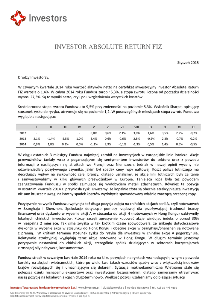 INVESTOR ABSOLUTE RETURN FIZ Styczeń 2015 Drodzy Inwestorzy, W czwartym kwartale 2014 roku wartość aktywów netto na certyfikat inwestycyjny Investor Absolute Return FIZ wzrosła o 1,4%. W całym 2014 roku Fundusz zarobił 5,3%, a stopa zwrotu liczona od początku działalności wynosi 27,3%. Są to wyniki netto, czyli po uwzględnieniu wszystkich kosztów. Średnioroczna stopa zwrotu Funduszu to 9,5% przy zmienności na poziomie 5,3%. Wskaźnik Sharpe, opisujący stosunek zysku do ryzyka, utrzymuje się na poziomie 1,2. W poszczególnych miesiącach stopa zwrotu Funduszu wyglądała następująco: I II III IV V VI VII VIII IX X XI XII 2012 - - - - 0,0% 0,6% 2,1% 3,0% 1,6% 3,5% 2,2% -0,7% 2013 2,1% -1,4% -2,5% 1,0% 3,4% 0,6% -0,6% 2,8% -0,2% 2,3% -0,7% 0,2% 2014 0,9% 1,8% 0,2% 0,0% -1,1% 2,9% -0,1% -1,3% 0,5% 1,4% 0,6% -0,5% W ciągu ostatnich 3 miesięcy Fundusz najwięcej zarobił na inwestycjach w europejskie linie lotnicze. Akcje przewoźników taniały wraz z pogarszającym się sentymentem inwestorów do sektora oraz z powodu informacji o nasilających się strajkach we Francji oraz Niemczech. Jednak w naszej opinii wyceny nie odzwierciedlały pozytywnego czynnika, jakim był spadek ceny ropy naftowej. Koszt paliwa lotniczego ma decydujący wpływ na zyskowność całej branży, dlatego uznaliśmy, że akcje linii lotniczych były za tanie i zainwestowaliśmy w kilku głównych przewoźników w Europie. Taniejąca ropa była też powodem zaangażowania Funduszu w spółki zajmujące się wydobyciem metali szlachetnych. Również ta pozycja w ostatnim kwartale 2014 r. przyniosła zysk. Uważamy, że kopalnie złota są obecnie atrakcyjniejszą inwestycją niż sam kruszec z uwagi na istotny spadek kosztów wydobycia spowodowany właśnie znaczącą przeceną ropy. Pozytywnie na wynik Funduszu wpłynęła też długa pozycja zajęta na chińskich akcjach serii A, czyli notowanych w Szanghaju i Shenzhen. Spekulacje dotyczące pomocy rządowej dla przeżywającej trudności branży finansowej oraz dyskonto w wycenie akcji A w stosunku do akcji H (notowanych w Hong Kongu) uaktywniły lokalnych chińskich inwestorów, którzy zaczęli agresywnie kupować akcje windując indeks o ponad 30% w niespełna 2 miesiące. Tak silna zwyżka w tak krótkim czasie spowodowała, że zniknęło dotychczasowe dyskonto w wycenie akcji w stosunku do Hong Kongu i obecnie akcje w Szanghaju/Shenzhen są notowane z premią. W krótkim terminie stosunek zysku do ryzyka dla inwestycji w chińskie akcje A pogorszył się. Relatywnie atrakcyjniej wyglądają teraz akcje notowane w Hong Kongu. W długim terminie jesteśmy pozytywnie nastawieni do chińskich akcji, szczególnie spółek działających w sektorach korzystających z rosnącej siły nabywczej konsumentów. Fundusz stracił w czwartym kwartale 2014 roku na kilku pozycjach na rynkach wschodzących, w tym z powodu korekty na akcjach wietnamskich, które po wielu kwartałach wzrostów spadły wraz z większością indeksów krajów rozwijających się i umacniającym się dolarem. Sytuacja makroekonomiczna Wietnamu stale się polepsza dzięki rosnącemu eksportowi oraz inwestycjom bezpośrednim, dlatego zamierzamy utrzymywać naszą pozycję na lokalnych akcjach długoterminowo. Wielkość pozycji uzależniamy od bieżącej sytuacji rynkowej. Straty przyniosły również pozycje zabezpieczające przed spadkami indeksów giełdowych rynków rozwiniętych, które Fundusz konsekwentnie utrzymuje by ograniczyć ryzyko inwestycyjne. W nadchodzących miesiącach Fundusz będzie przede wszystkim szukał okazji inwestycyjnych, jakie stwarza sytuacja na rynku ropy naftowej. Jej cena wpływa nie tylko na lepszą lub gorszą koniunkturę w poszczególnych branżach (na przykład linie lotnicze vs. firmy wydobywające ropę naftową), ale także na sytuację gospodarczą całych państw (importerzy ropy vs. eksporterzy) oraz ich sytuację fiskalną, szczególnie na rynkach wschodzących, gdzie dopłaty do cen paliw potrafią stanowić największą pozycję w budżecie państwa. Fundusz będzie się starał wykorzystać jak najwięcej tego typu zachodzących zmian. Strategia Investor Absolute Return FIZ Podstawowym zadaniem Funduszu jest przynoszenie dodatnich, powtarzalnych stóp zwrotu niezależnie od koniunktury na rynku, przy jednoczesnym ograniczaniu ryzyka inwestycyjnego. W tym celu konstrukcja portfela zakłada utrzymywanie zarówno długich (tj. zarabiających na wzrostach), jak krótkich (zarabiających na spadkach) pozycji. Ponadto, by ograniczyć zmienność portfela i korelację z rynkiem akcji, Fundusz stosuje różnorodne strategie inwestycyjne. Szukamy przede wszystkim atrakcyjnych tematów inwestycyjnych. Mogą to być wyselekcjonowane spółki, w których zachodzą strukturalne zmiany, a także sektory, kraje lub surowce, dla których udało nam się zidentyfikować makro-czynniki zmieniające obraz inwestycyjny. Maciej Wojtal Zarządzający Funduszem Email: [email protected] Nota prawna: Niniejszy materiał ma wyłącznie charakter promocyjny. Opracowany został przez Investors TFI S.A. w związku z zarządzaniem funduszami inwestycyjnymi. Materiał oraz zawarte w nim prognozy stanowią wyłącznie wyraz poglądów jego autora i oparte zostały na stanie wiedzy aktualnym na dzień jego sporządzenia. Przy sporządzeniu materiału i zawartych w nim prognoz oparto się na informacjach pozyskanych z powszechnie dostępnych i uznanych za wiarygodne źródeł, dokładając należytej staranności, aby informacje zamieszczone w niniejszym materiale były rzetelne, niemniej jednak nie można zagwarantować ich poprawności, kompletności i aktualności. Investors TFI S.A. zastrzega sobie możliwość zmiany przedstawionych opinii, w tym w przypadku zmiany sytuacji rynkowej, bez konieczności powiadamiania o niej adresatów niniejszego materiału. Investors TFI S.A. nie gwarantuje ziszczenia się scenariuszy lub prognoz zamieszczonych w niniejszym mater