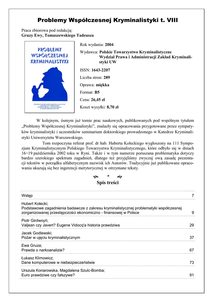 Problemy Współczesnej Kryminalistyki t. VIII Praca zbiorowa pod redakcją: Gruzy Ewy, Tomaszewskiego Tadeusza Rok wydania: 2004 Wydawca: Polskie Towarzystwo Kryminalistyczne Wydział Prawa i Administracji Zakład Kryminalistyki UW ISSN: 1643-2207 Liczba stron: 289 Oprawa: miękka Format: B5 Cena: 26,45 zł Koszt wysyłki: 8,70 zł W kolejnym, ósmym już tomie prac naukowych, publikowanych pod wspólnym tytułem „Problemy Współczesnej Kryminalistyki”, znalazły się opracowania przygotowane przez sympatyków kryminalistyki i uczestników seminarium doktorskiego prowadzonego w Katedrze Kryminalistyki Uniwersytetu Warszawskiego. Tom rozpoczyna referat prof. dr hab. Huberta Kołeckiego wygłoszony na 111 Sympozjum Kryminalistycznym Polskiego Towarzystwa Kryminalistycznego, które odbyło się w dniach 16÷19 października 2002 roku w Ryni. Także i w tym numerze poruszana problematyka dotyczy bardzo szerokiego spektrum zagadnień, dlatego też przyjęliśmy zwyczaj ową zasadę prezentacji tekstów w porządku alfabetycznym nazwisk ich Autorów. Tradycyjnie już publikowane opracowania ukazują się bez ingerencji merytorycznej w otrzymane teksty. * Spis treści Wstęp 7 Hubert Kołecki; Podstawowe zagadnienia badawcze z zakresu kryminalistycznej problematyki współczesnej zorganizowanej przestępczości ekonomiczno - finansowej w Polsce 9 Piotr Girdwoyń; Valjean czy Javert? Eugene Vidocq'a historia prawdziwa 29 Jacek Godlewski; Pożar w ujęciu kryminalistycznym 37 Ewa Gruza; Prawda o narkoanalizie? 67 Łukasz Klimowicz; Dane komputerowe w niebezpieczeństwie 73 Urszula Konarowska, Magdalena Szulc-Bomba; Euro prawdziwe czy fałszywe? 91 Adam Miłosz, Joanna Miłosz; Podstawowe prawa i obowiązki biegłego w sprawach dotyczących zaboru i identyfikacji pojazdu 95 Adam Miłosz, Joanna Miłosz, Bogdan Użanowki; Kryminalistyczno - teoretyczna i praktyczna identyfikacja pojazdu samochodowego na przykładzie Mercedesa 109 Jarosław Moszczyński; EURODAC - Europejski System Identyfikacji Daktyloskopijnej Uchodźców i Nielegalnych Imigrantów 129 Karolina Olszak; Proces karny a intuicja 137 Marzanna Piekarska-Drążek; Zmiana zeznań świadków w świetle badań ankietowych 145 Magdalena Potapowicz; Efekty czynności podejmowanych przez Policję w związku z poszukiwaniami osób zaginionych, identyfikacją odnalezionych NN zwłok oraz ujawnieniem osoby o nieustalonej tożsamości na przykładzie dokonanej analizy 59 akt spraw 173 Risto Pullat; Zorganizowana przestępczość w Estonii 199 Rafał Rogalski; Zorganizowana przestępczość - zarys problematyki 237 Adam Taracha; Dowodowe wykorzystanie w procesie karnym informacji pochodzących z sytemu cyfrowej telefonii komórkowej 249 Marzena Anna Wasilewska; Z historii kryminalistyki - Zbrodnicze otrucia: aspekty kryminalistyczne i kryminologiczne 261 Marzena Anna Wasilewska, Monika Kinga Czajkowska; Prostytucja w ujęciu prawodawstwa europejskiego 281 *