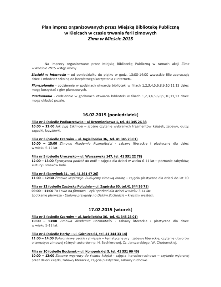 Plan imprez organizowanych przez Miejską Bibliotekę Publiczną w Kielcach w czasie trwania ferii zimowych Zima w Mieście 2015 Na imprezy organizowane przez Miejską Bibliotekę Publiczną w ramach akcji Zima w Mieście 2015 wstęp wolny. Sieciaki w Internecie – od poniedziałku do piątku w godz. 13:00-14:00 wszystkie filie zapraszają dzieci i młodzież szkolną do bezpłatnego korzystania z Internetu. Planszolandia - codziennie w godzinach otwarcia biblioteki w filiach 1,2,3,4,5,6,8,9,10,11,13 dzieci mogą korzystać z gier planszowych. Puzzlomania - codziennie w godzinach otwarcia biblioteki w filiach 1,2,3,4,5,6,8,9,10,11,13 dzieci mogą układać puzzle. 16.02.2015 (poniedziałek) Filia nr 2 (osiedle Podkarczówka – ul Krzemionkowa 1, tel. 41 345 26 38 10:00 – 11:00 Jak żyją Eskimosi – głośne czytanie wybranych fragmentów książek, zabawy, quizy, zagadki, krzyżówki. Filia nr 3 (osiedle Czarnów – ul. Jagiellońska 36, tel. 41 345 23 01) 10:00 – 13:00 Zimowa Akademia Rozmaitości - zabawy literackie i plastyczne dla dzieci w wieku 5-12 lat. Filia nr 5 (osiedle Uroczysko – ul. Warszawska 147, tel. 41 331 22 78) 12:00 – 13:00 Egzotyczna podróż do Indii – zajęcia dla dzieci w wieku 6-11 lat – poznanie zabytków, kultury i smaków Indii. Filia nr 8 (Barwinek 31, tel. 41 361 47 26) 11:00 – 12:30 Zimowe inspiracje. Budujemy zimową krainę – zajęcia plastyczne dla dzieci do lat 10. Filia nr 12 (osiedle Zagórska Południe – ul. Zagórska 60, tel.41 344 36 71) 09:00 – 11:00 To i owo na filmowo – cykl spotkań dla dzieci w wieku 7-14 lat. Spotkanie pierwsze - Szalone przygody na Dzikim Zachodzie – kręcimy western. 17.02.2015 (wtorek) Filia nr 3 (osiedle Czarnów – ul. Jagiellońska 36, tel. 41 345 23 01) 10:00 – 13:00 Zimowa Akademia Rozmaitości - zabawy literackie i plastyczne dla dzieci w wieku 5-12 lat. Filia nr 4 (osiedle Herby – ul. Górnicza 64, tel. 41 344 33 14) 11:00 – 14:00 Bałwankowe psotki i śmieszki – tematyczne gry i zabawy literackie, czytanie utworów o tematyce zimowej różnych autorów np. H. Bechlerowej, Cz. Janczarskiego, W. Chotomskiej. Filia nr 10 (osiedle Bocianek – ul. Konopnickiej 5, tel. 41 331 66 46) 10:00 – 12:00 Zimowe wyprawy do świata książki - zajęcia literacko-ruchowe – czytanie wybranej przez dzieci książki, zabawy literackie, zajęcia plastyczne, zabawy ruchowe. Filia nr 12 (osiedle Zagórska Południe – ul. Zagórska 60, tel.41 344 36 71) 09:00 – 11:00 To i owo na filmowo – cykl spotkań dla dzieci w wieku 7-14 lat. Spotkanie drugie – Śmieszne strachy – kręcimy film grozy. 18.02.2015 (środa) Filia nr 2 (osiedle Podkarczówka – ul Krzemionkowa 1, tel. 41 345 26 38 10:00 – 11:00 Jak żyją Eskimosi – głośne czytanie wybranych fragmentów książek, zabawy, quizy, zagadki, krzyżówki. Filia nr 4 (osiedle Herby – ul. Górnicza 64, tel. 41 344 33 14) 11:00 – 14:00 Bałwankowe psotki i śmieszki – tematyczne gry i zabawy literackie, czytanie utworów o tematyce zimowej różnych autorów np. H. Bechlerowej, Cz. Janczarskiego, W. Chotomskiej. Filia nr 8 (Barwinek 31, tel. 41 361 47 26) 11:00 – 12:30 Bajkowe Kuchcikowo – zajęcia kulinarno-literackie dla dzieci do lat 10. Czytanie fragmentów książki G. Kasdepke pt. „Słodki rok Kuby i Buby” oraz sporządzenie „wystrzałowej sałatki”. Filia nr 9 (ul. Okrzei 9, tel. 41 343 16 10) 11:00 – 12:00 W krainie baśni Hansa Christiana Andersena – czytanie utworów pisarza, gry i zabawy literackie. Filia nr 12 (osiedle Zagórska Południe – ul. Zagórska 60, tel. 41 344 36 71) 09:00 – 11:00 To i owo na filmowo – cykl spotkań dla dzieci w wieku 7-14 lat. Spotkanie trzecie – Brazylijskie klimaty – kręcimy telenowelę. Filia nr 13 (osiedle Pod Dalnią – ul. Naruszewicza 25, tel. 41 335 88 21) 10:00 – 11:00 Ferie z Franklinem – zajęcia literacko - plastyczne. 19.02.2015 (czwartek) Filia nr 3 (osiedle Czarnów – ul. Jagiellońska 36, tel. 41 345 23 01) 10:00 – 13:00 Zimowa Akademia Rozmaitości - zabawy literackie i plastyczne dla dzieci w wieku 5-12 lat. Filia nr 4 (osiedle Herby – ul. Górnicza 64, tel. 41 344 33 14) 11:00 – 14:00 Bałwankowe psotki i śmieszki – tematyczne gry i zabawy literackie, czytanie utworów o tematyce zimowej różnych autorów np. H. Bechlerowej, Cz. Janczarskiego, W. Chotomskiej. Filia nr 10 (osiedle Bocianek – ul. Konopnickiej 5, tel. 41 331 66 46) 10:00 – 12:00 Zimowe wyprawy do świata książki - zajęcia literacko-ruchowe – czytanie wybranej przez dzieci książki, zabawy literackie, zajęcia plastyczne, zabawy ruchowe. Filia nr 11 (osiedle Świętokrzyskie – ul. J. Nowaka Jeziorańskiego 53, tel. 041 331 83 46) 11:30 – 13:00 Ferie w bibliotece z ksiązką i nie tylko…- cykl spotkań dla dzieci w wieku 8-11 lat. Czytanie opowiadań z morałem, zabawy literackie, zajęcia plastyczne, zabawy ruchowe. Filia nr 12 (osiedle Zagórska Południe – ul. Zagórska 60, tel.41 344 36 71) 09:00 – 11:00 To i owo na filmowo – cykl spotkań dla dzieci w wieku 7-14 lat. Spotkanie czwarte – W poszukiwaniu zaginionej księgi – kręcimy film przygodowy. 20.02.2015 (piątek) Filia nr 3 (osiedle Czarnów – ul. Jagiellońska 36, tel. 41 345 23 01) 10:00 – 13:00 Zimowa Akademia Rozmaitości - zabawy literackie i plastyczne dla dzieci w wieku 5-12 lat. Filia nr 8 (Barwinek 31, tel. 41 361 47 26) 11:00 – 12:30 Dobre maniery na wesoło – gry i zabawy z zasad savoir vivre dla dzieci do lat 10. Filia nr 11 (osiedle Świętokrzyskie – ul. J. Nowaka Jeziorańskiego 53, tel. 041 331 83 46) 11:30 – 13:00 Ferie w bibliotece z ksiązką i nie tylko…- cykl spotkań dla dzieci w wieku 8-11 lat. Czytanie opowiadań z morałem, zabawy literackie, zajęcia plastyczne, zabawy ruchowe. Filia nr 12 (osiedle Zagórska Południe – ul. Zagórska 60, tel.41 344 36 71) 09:00 – 11:00 To i owo na filmowo – cykl spotkań dla dzieci w wieku 7-14 lat. Spotk